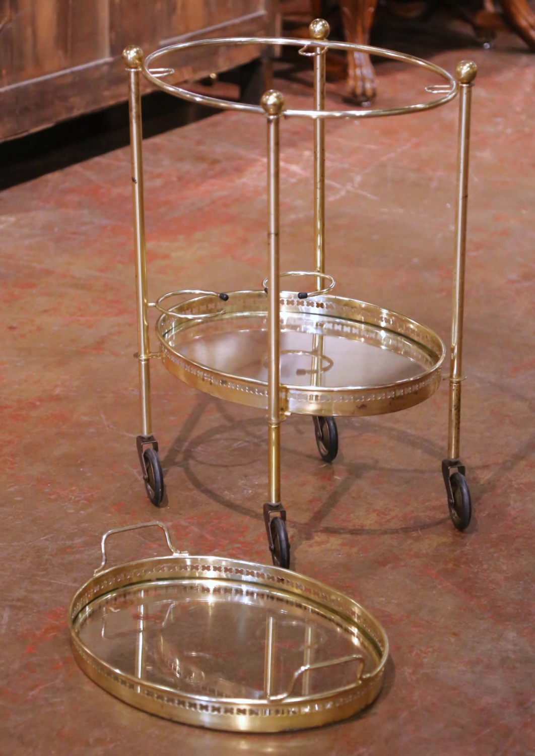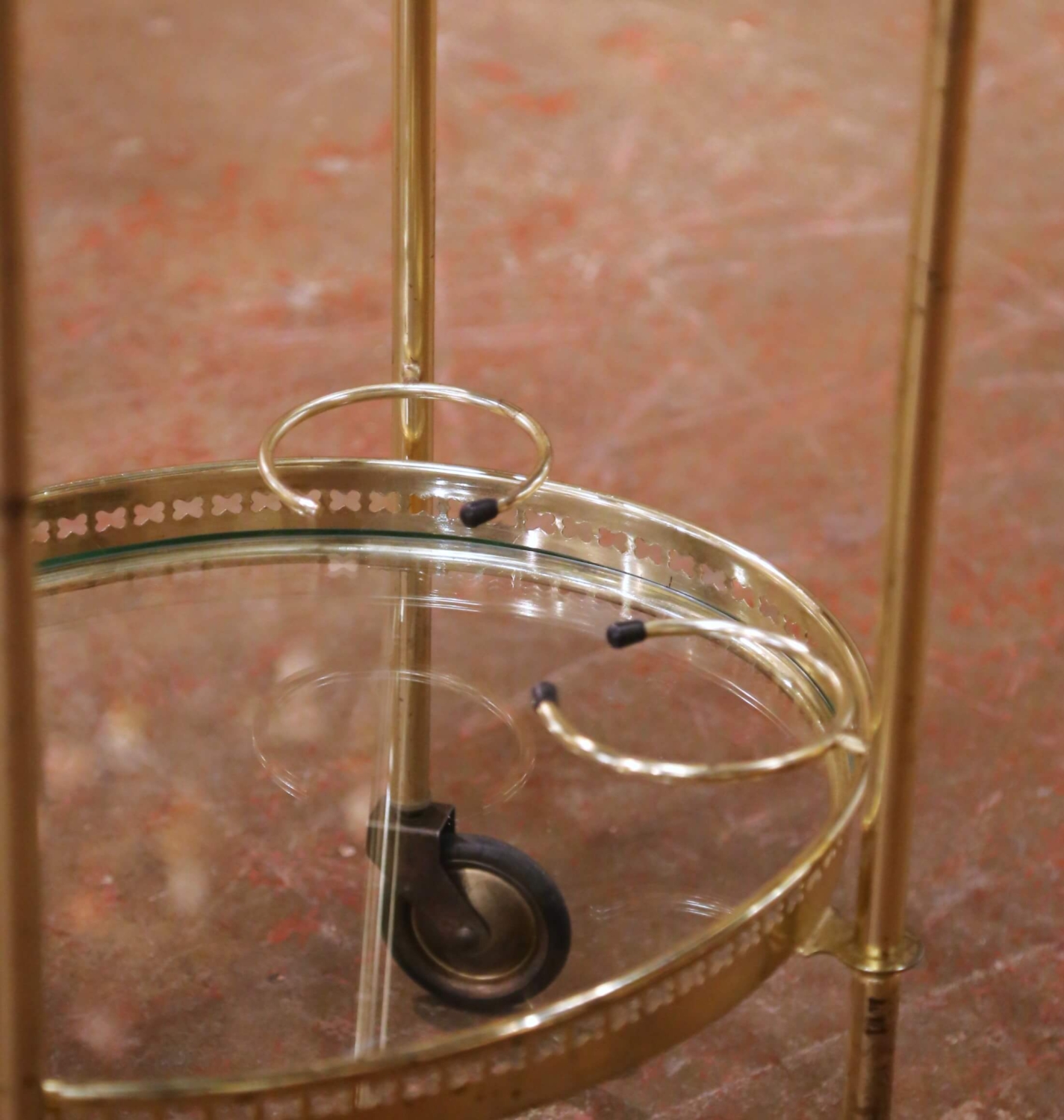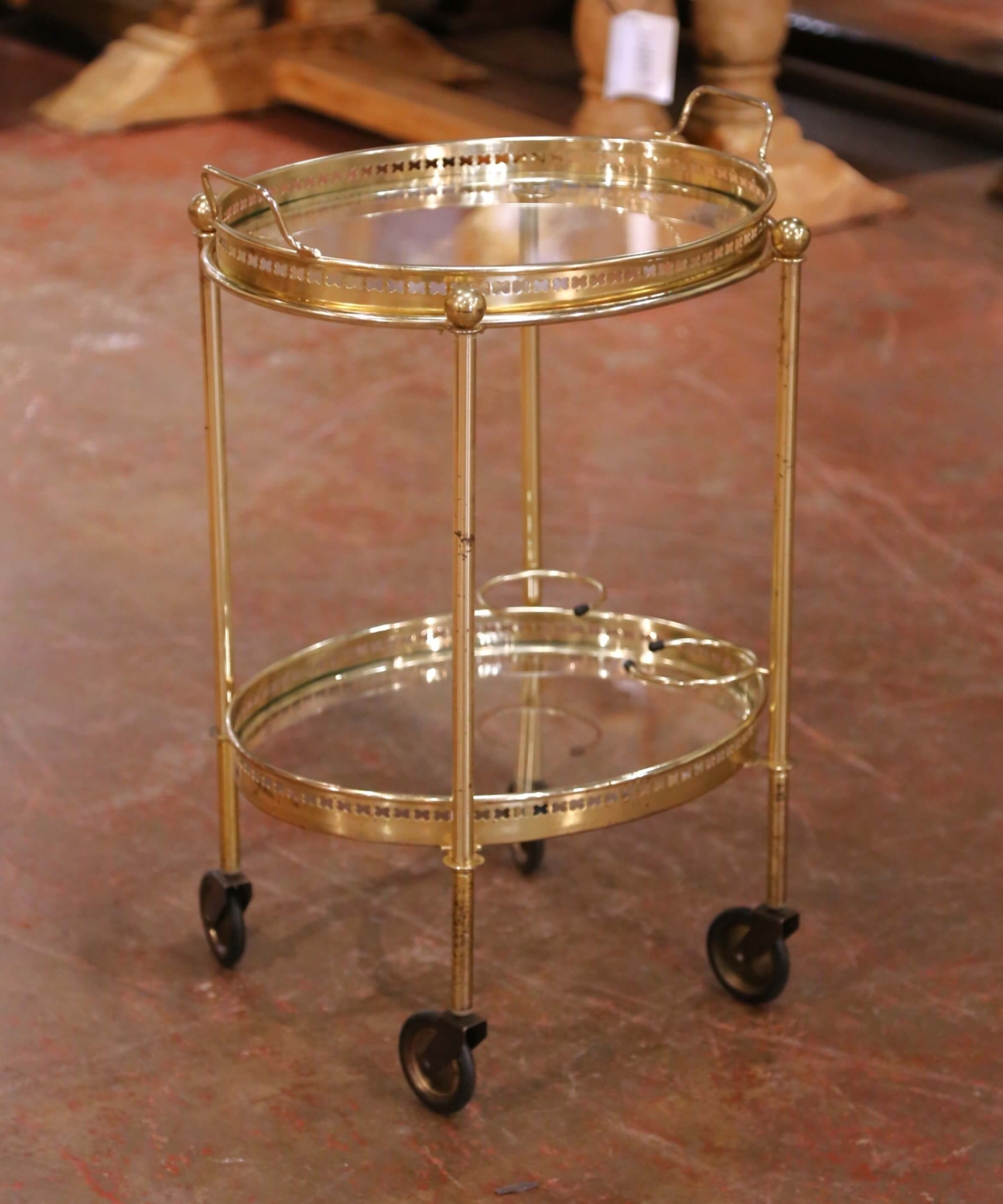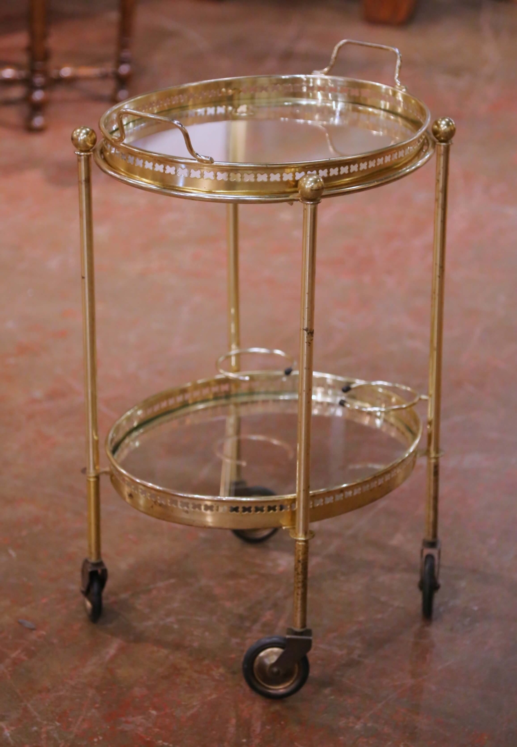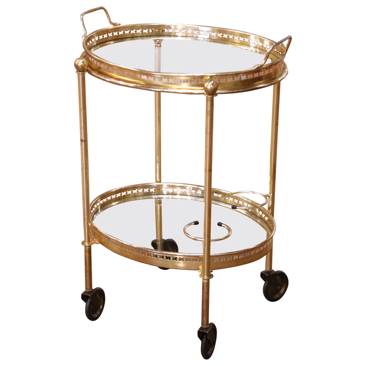 This elegant French bar cart was crafted circa 1950 and features a classic mid-century design executed in polished brass with two circular clear glass tiers. The open, airy structure is supported by slender vertical posts topped with spherical finials, giving the piece a light architectural presence while remaining sturdy and functional. The upper gallery tray is removable and detailed with pierced brass decoration and integrated side handles, allowing it to be used independently for serving. The lower tier includes a built-in bottle holder ring and stabilizing rail, making it ideal for wine or spirits storage. Set on four rolling casters, the cart moves easily and serves beautifully as a bar cart, drinks trolley, or accent piece in a living room, dining room, or entertaining space. The brass shows a warm patina with light wear consistent with age and use, and the glass shelves are clean and well fitted. A refined and highly decorative antique-inspired mid-century piece that combines practicality with timeless French style. Dimensions: 19″W x 14.5″D x 27.5″H.