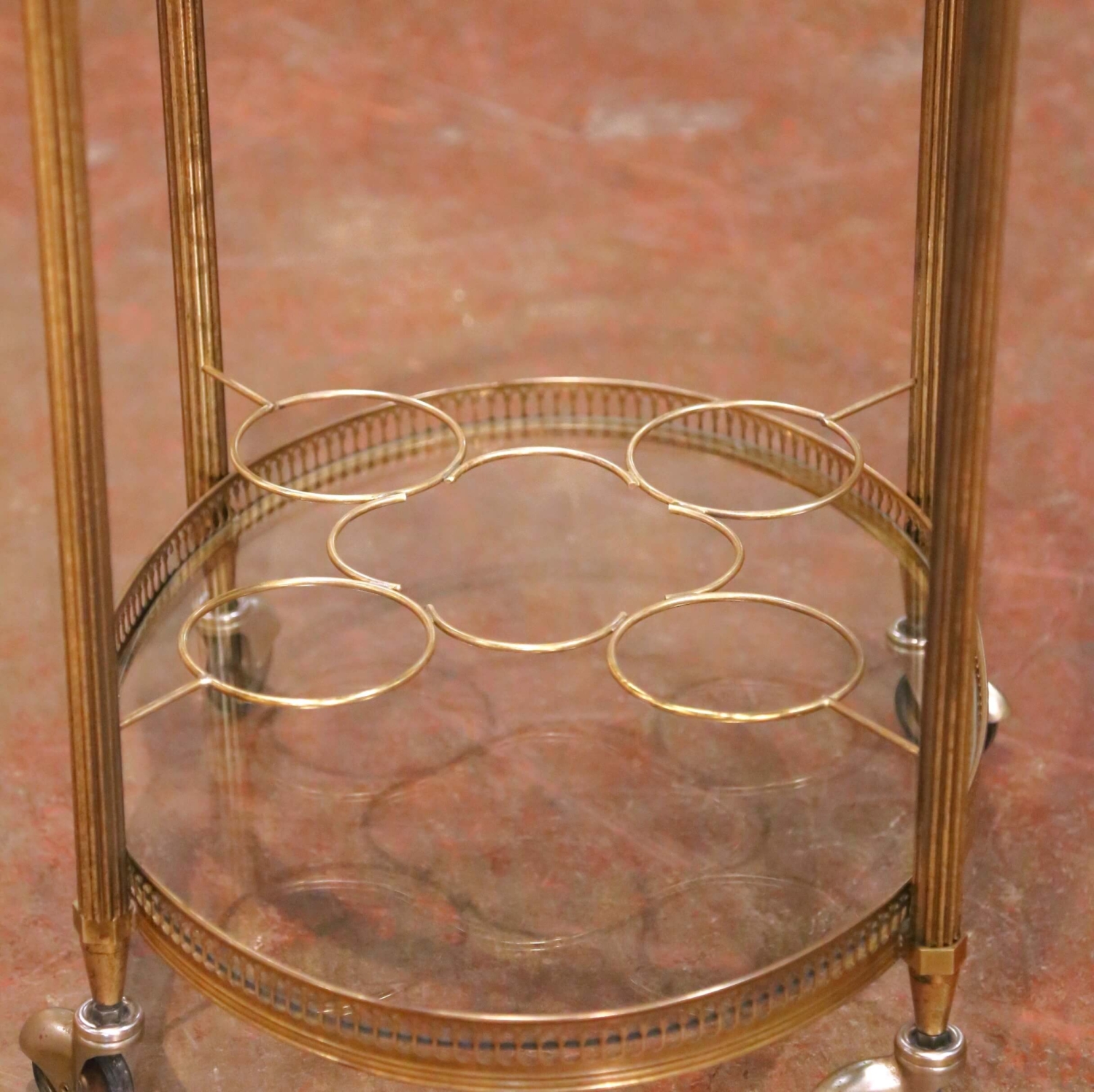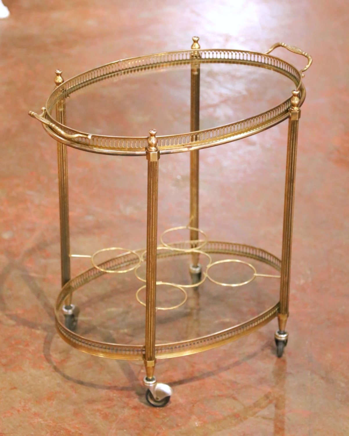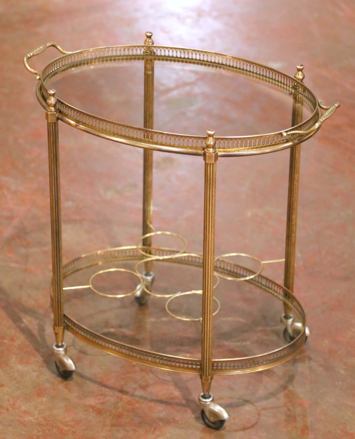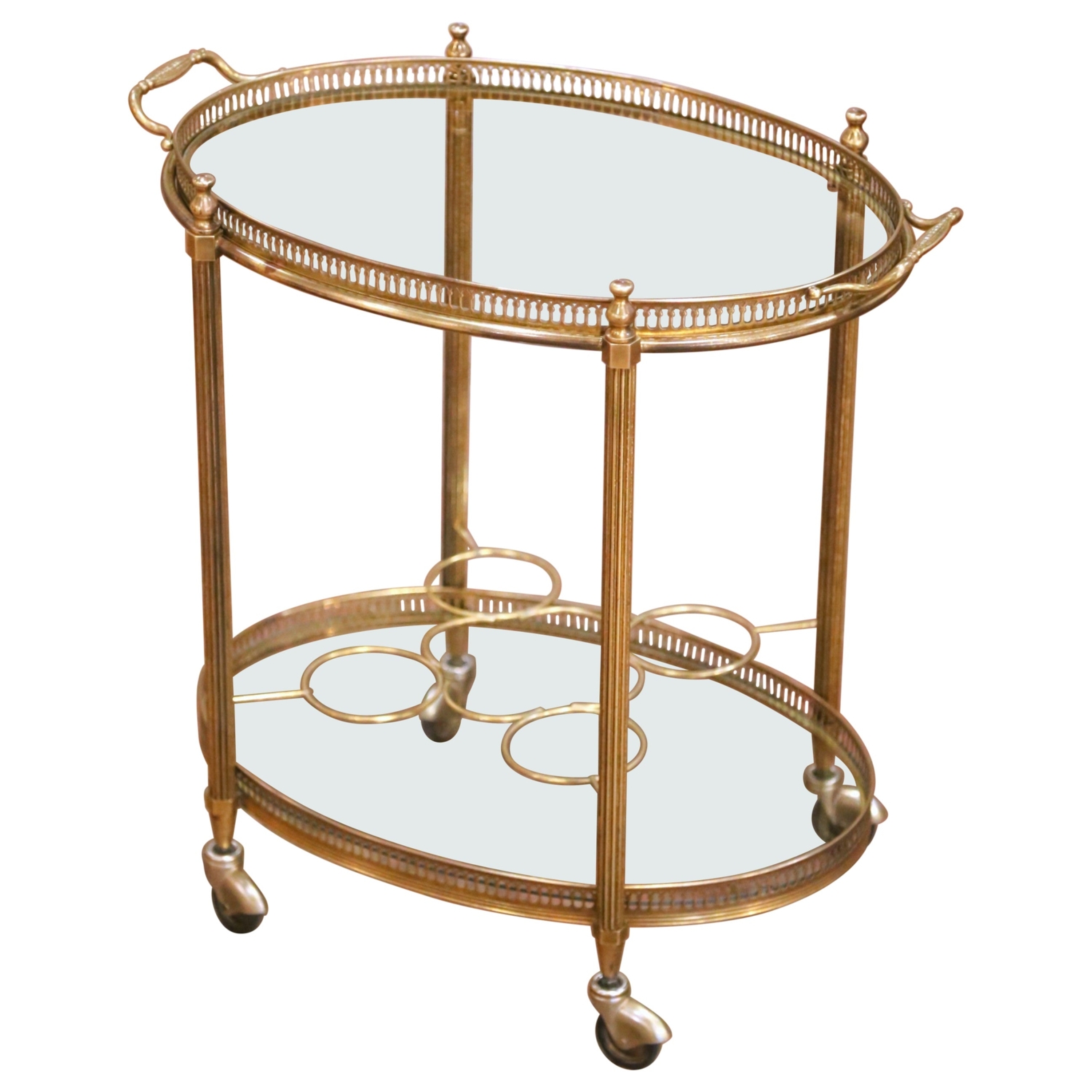 Crafted in France circa 1960, this elegant mid-century brass bar cart features a refined neoclassical design with a light and airy silhouette. The oval removable tray top is framed by a finely pierced brass gallery, providing both decorative detail and practical stability while serving. The trolley is supported by four slender fluted brass uprights joined by a lower oval glass shelf, also surrounded by a matching pierced gallery. The bottom tier is fitted with integrated brass bottle holders designed to secure wine and spirits while the cart is in motion, making the piece as functional as it is stylish. Raised on original rolling casters, the cart moves easily from room to room and is ideal for serving cocktails, displaying barware, or adding a sophisticated accent to a living room, dining room, or study. The warm brass finish and delicate detailing reflect the timeless Parisian bar carts popular in the mid-20th century. Excellent vintage condition commensurate with age and use. Dimensions: 24″W x 15.5″D x 23.75″H