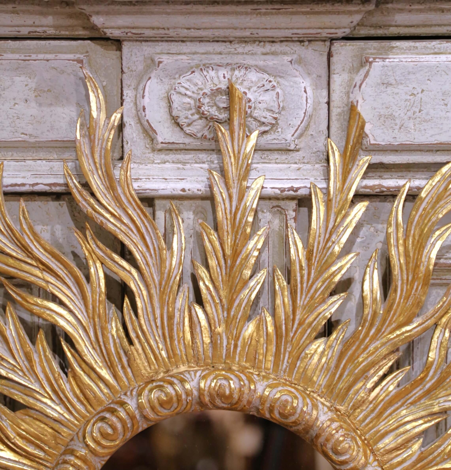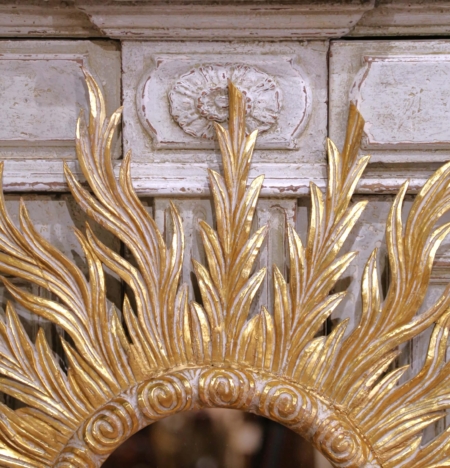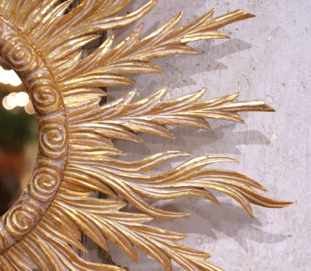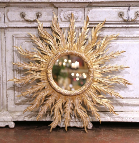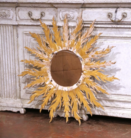 Add a radiant focal point to your interior with this large, eye-catching sunburst mirror. Hand-carved in France circa 1970, the bold circular frame features dynamic rays emanating outward in stylized, flame-like form. The giltwood construction is finished in warm gold leaf, creating a rich and luxurious patina that beautifully reflects light. The design draws inspiration from Louis XIV, the “Sun King” of France, who popularized the radiant sun motif as a symbol of grandeur, power, and elegance. This vintage French mirror remains in excellent condition commensurate with age and use. Its dramatic size and radiant gilded finish make it a versatile statement piece, equally suited for classical settings or modern interiors seeking a touch of historic glamour. Measures: 37.5″ diameter