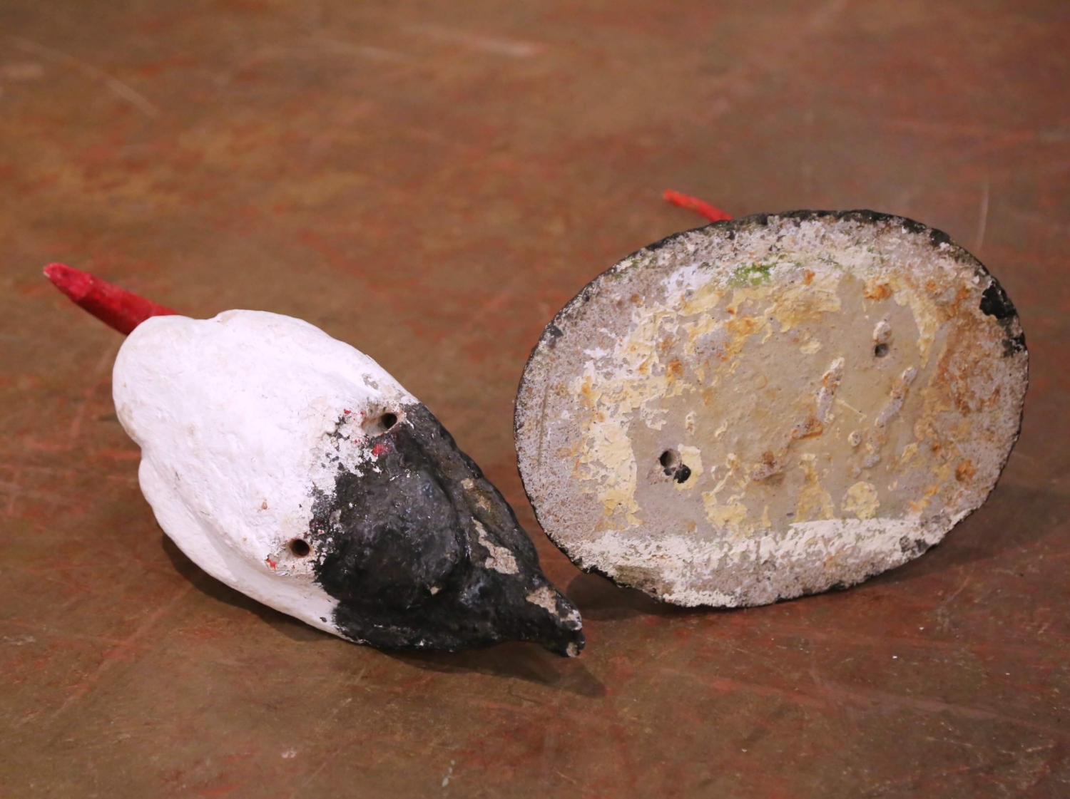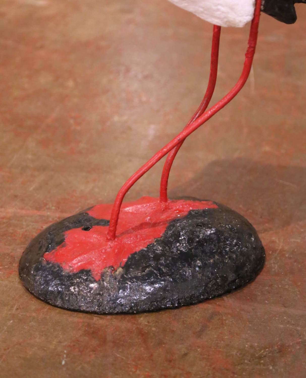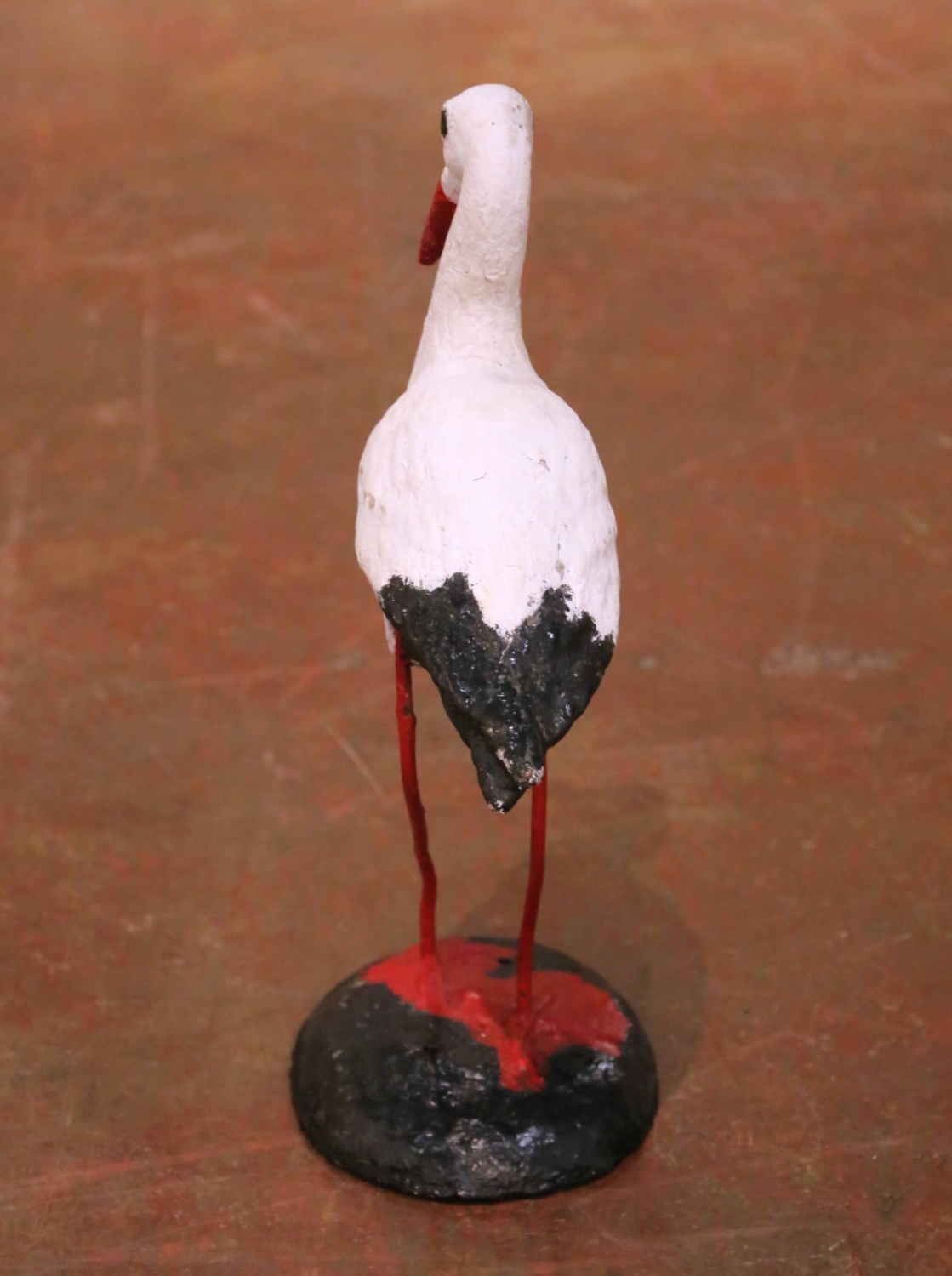 This charming antique garden sculpture was crafted in France circa 1960 and depicts a standing stork rendered in a rustic and highly decorative manner. The figure features a molded concrete body with a textured surface, hand-painted in white with black tail accents and a vivid red beak, and is supported by slender iron legs anchored to a weighted base. The stork, a traditional symbol of the French countryside and European garden ornamentation, is presented here in a stylized yet recognizable form, with its hand-applied finish and slightly naïve quality enhancing its authentic charm. The combination of solid concrete construction and iron support gives the piece both durability and visual character. The sculpture shows surface wear, paint loss, and weathering consistent with age and outdoor use, contributing to its timeworn patina. Structurally sound and stable, it remains a delightful decorative accent for a garden, terrace, or interior space. A whimsical and collectible antique garden figure, ideal for adding a touch of French provincial charm. Excellent condition commensurate with age and use. Dimensions: 16″W x 8.5″D x 23.5″H