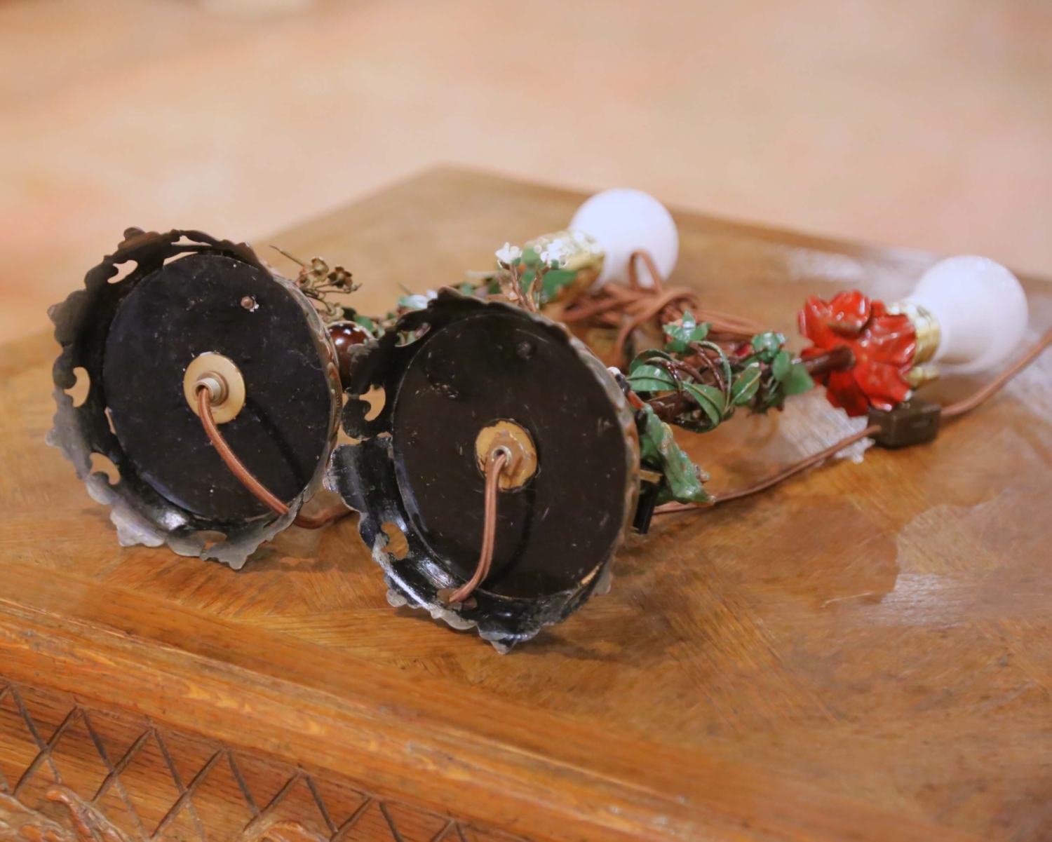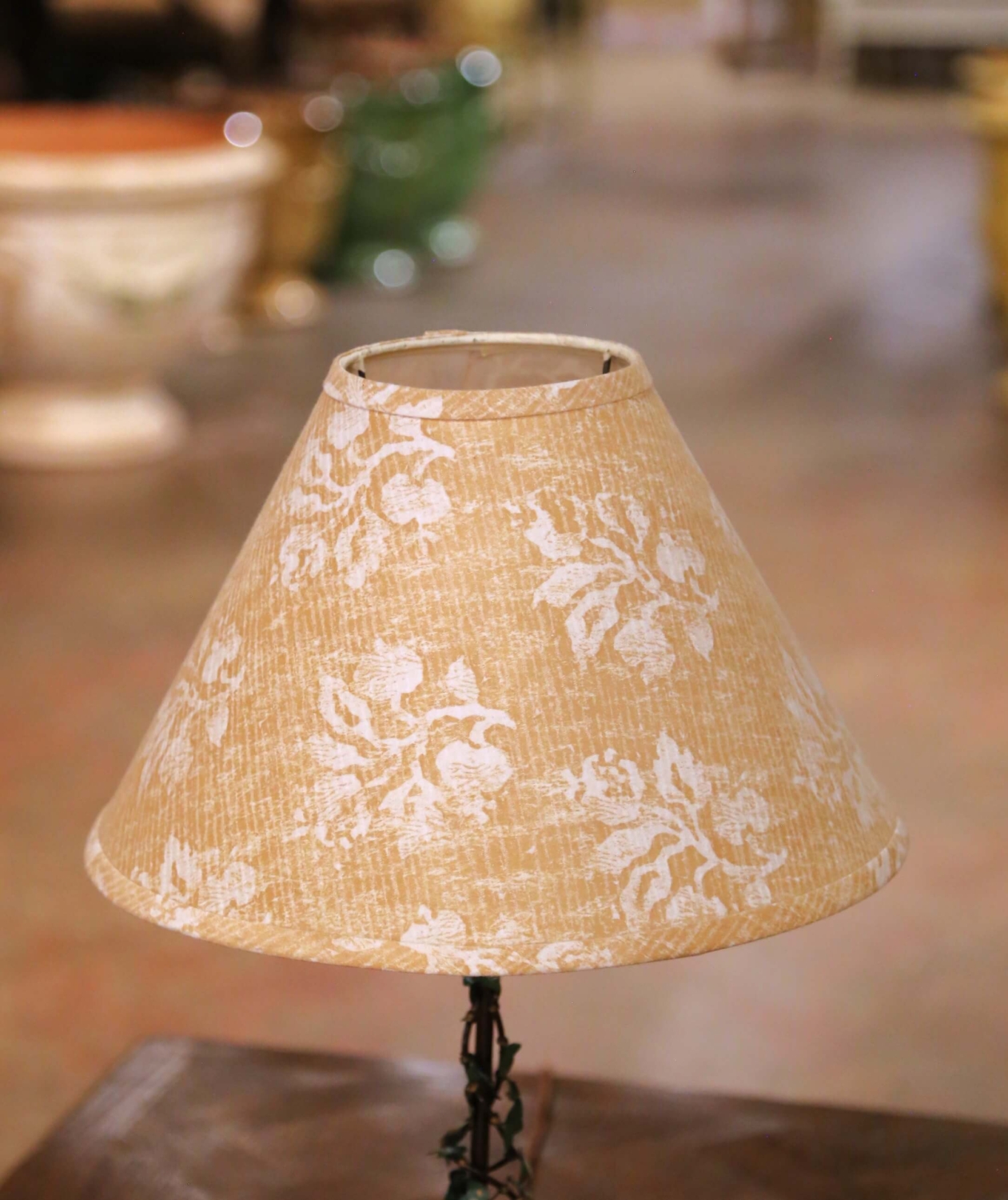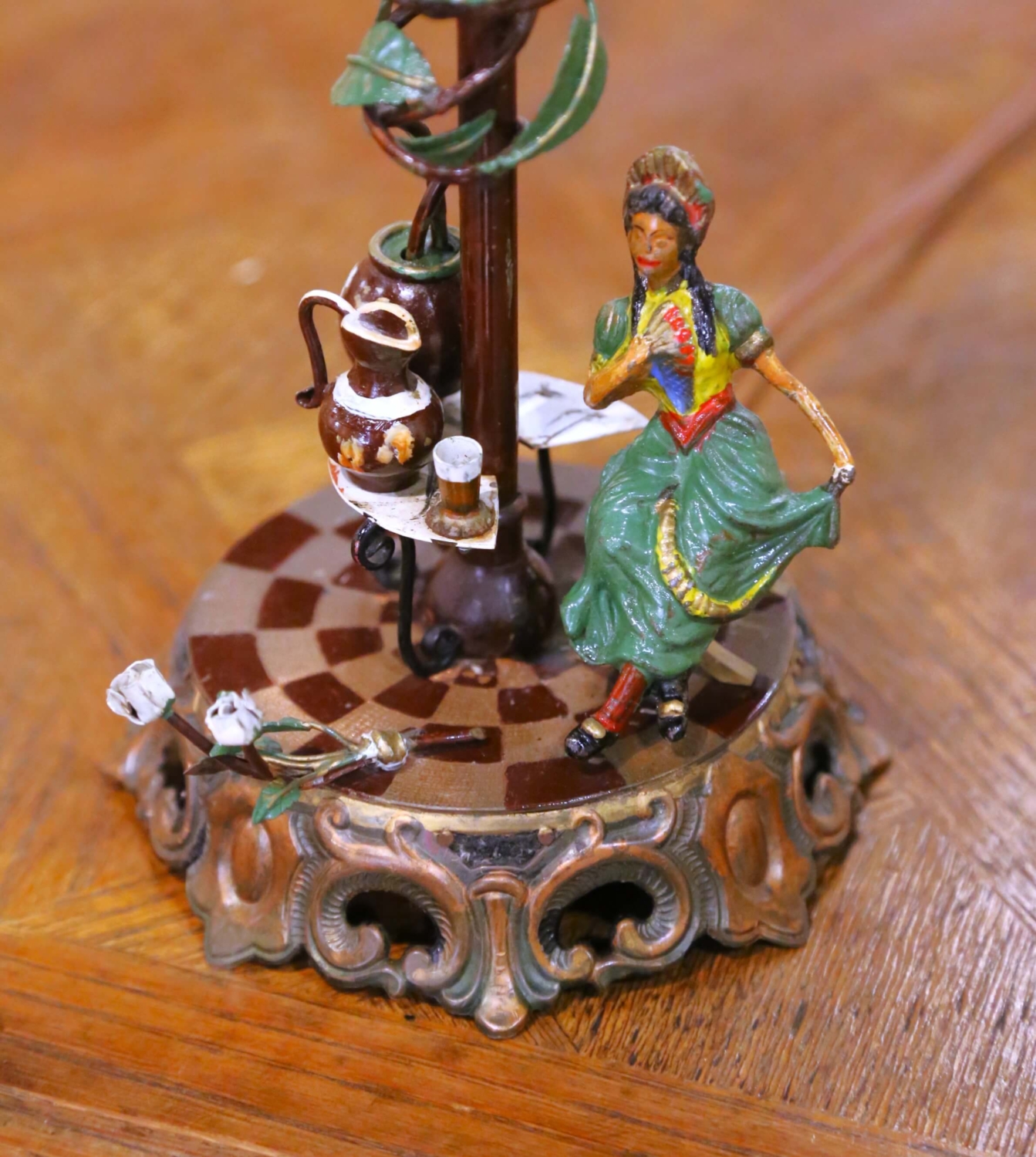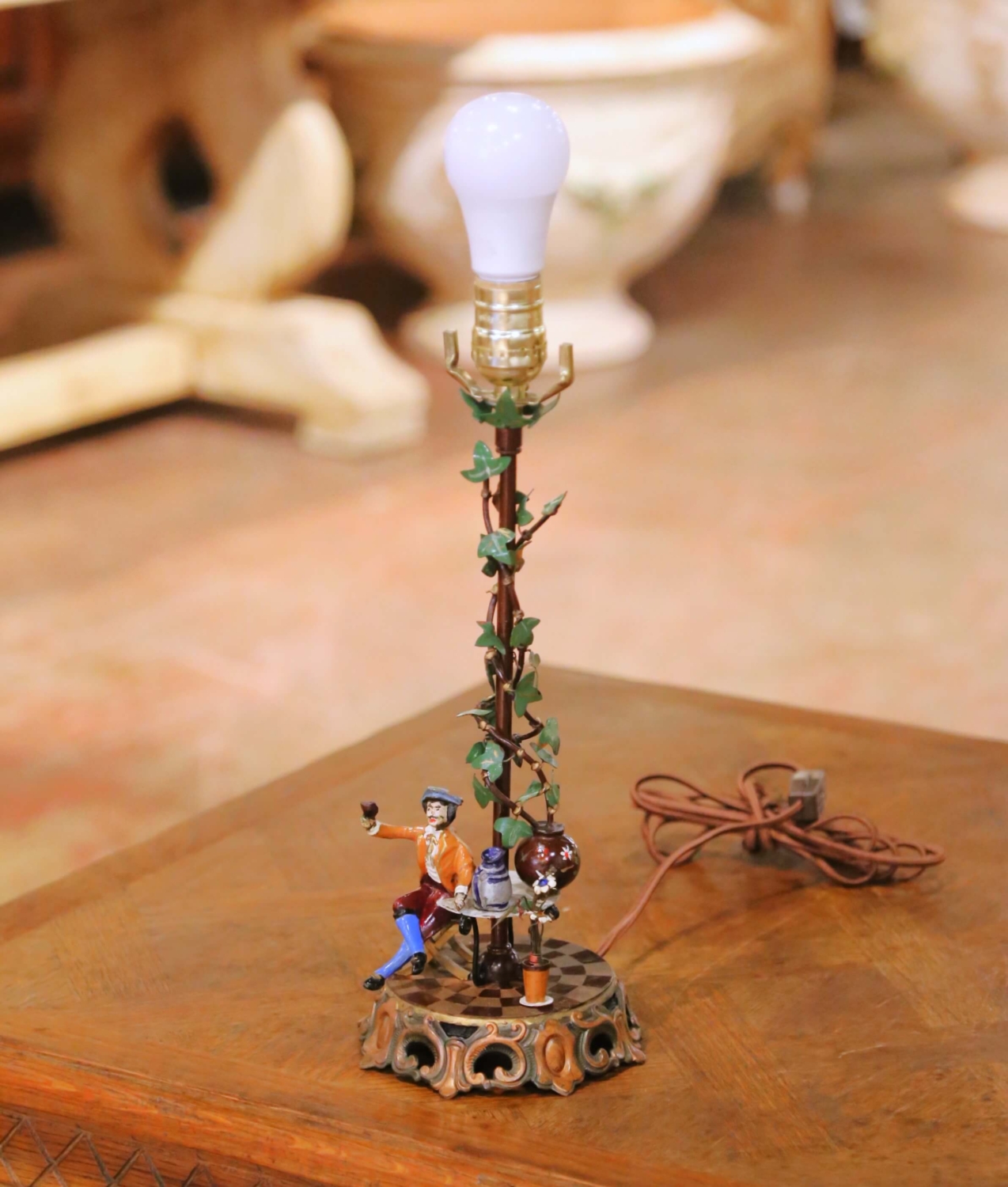Crafted in France circa 1950, this charming pair of mid-century table lamps captures the romantic spirit of French decorative design. Each lamp features a finely detailed hand-painted figural scene at the base: one depicting a seated gentleman raising a glass beside a café table, the other a dancing woman in traditional dress. The circular platforms are decorated with a checkerboard motif and raised scrolled borders in gilt and bronze-toned metal. Slender central stems are wrapped in painted tole vines with green leaves and sculpted blossoms, adding vertical movement and whimsy. Small café tables with miniature pitchers, glasses, and floral elements further enhance the storytelling quality of each piece. The lamps are topped with soft beige shades printed with a subtle floral pattern that complements the palette and diffuses the light warmly. The metal bases display a timeworn patina consistent with age and use. Wired for US standards with inline switches. Shades are included. Dimensions: With shade: 14” diameter x 20.5”H Without shade: 6” diameter x 14.75”H