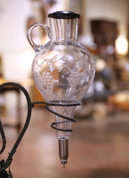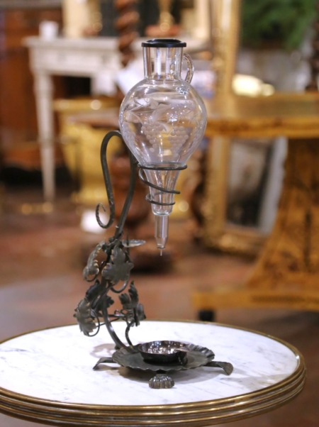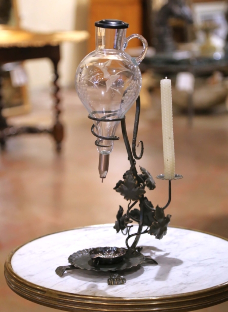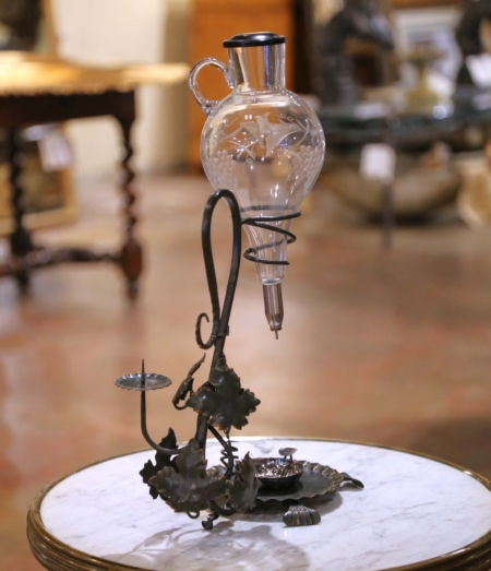 Celebrate the art of wine service with this elegant wine decanter dispenser, crafted in France circa 1950. The hand-blown glass decanter, delicately etched with grapevine and leaf motifs, is mounted upside down in a wrought iron frame with spiral support. The forged stand features a dark green painted finish with gilt accents and is adorned with sculptural grape leaves and curling tendrils. A single pricket for a taper candle adds an atmospheric touch for tastings. The decanter is fitted with a precision dispenser, allowing for a controlled pour directly into the accompanying silver-plated tastevin, or wine taster’s cup. Traditionally used by sommeliers, the tastevin’s raised bosses catch the candlelight to help evaluate a wine’s clarity and color. In excellent condition commensurate with age and use, and resting on scalloped feet, this piece combines function and artistry, making it a refined addition to a wine cellar, tasting room, or bar area. Measures: 12″W x 7″D x 19.5″H