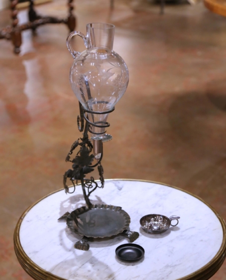 Mid-Century French Iron and Glass Wine Decanter Dispenser with Tastevin Cup