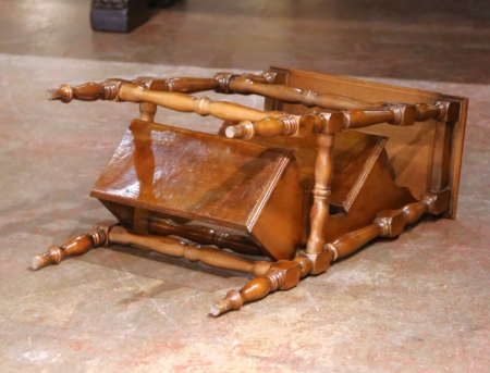 Crafted in France circa 1960, this clever piece combines form and function in the Louis XIII style. Built of walnut with a warm, hand-rubbed patina, the metamorphic stool features a rectangular molded top resting on turned supports. With a simple movement, the top section folds outward to reveal three broad treads, transforming the piece into a practical set of library steps. The turned baluster supports and octagonal stretchers provide strength and stability while lending visual interest, and the rich walnut grain shows subtle color variation that enhances its antique charm. The stool stands on four elegant tapering legs, completing the traditional silhouette. Sturdy and in very good condition commensurate with age and use, this versatile piece is ideal for a library, study, or living room, serving equally well as functional steps to reach high shelves. Closed dimensions: 29″ H x 20″ W x 14.25″ D Open depth: 25″; top step height: 29″