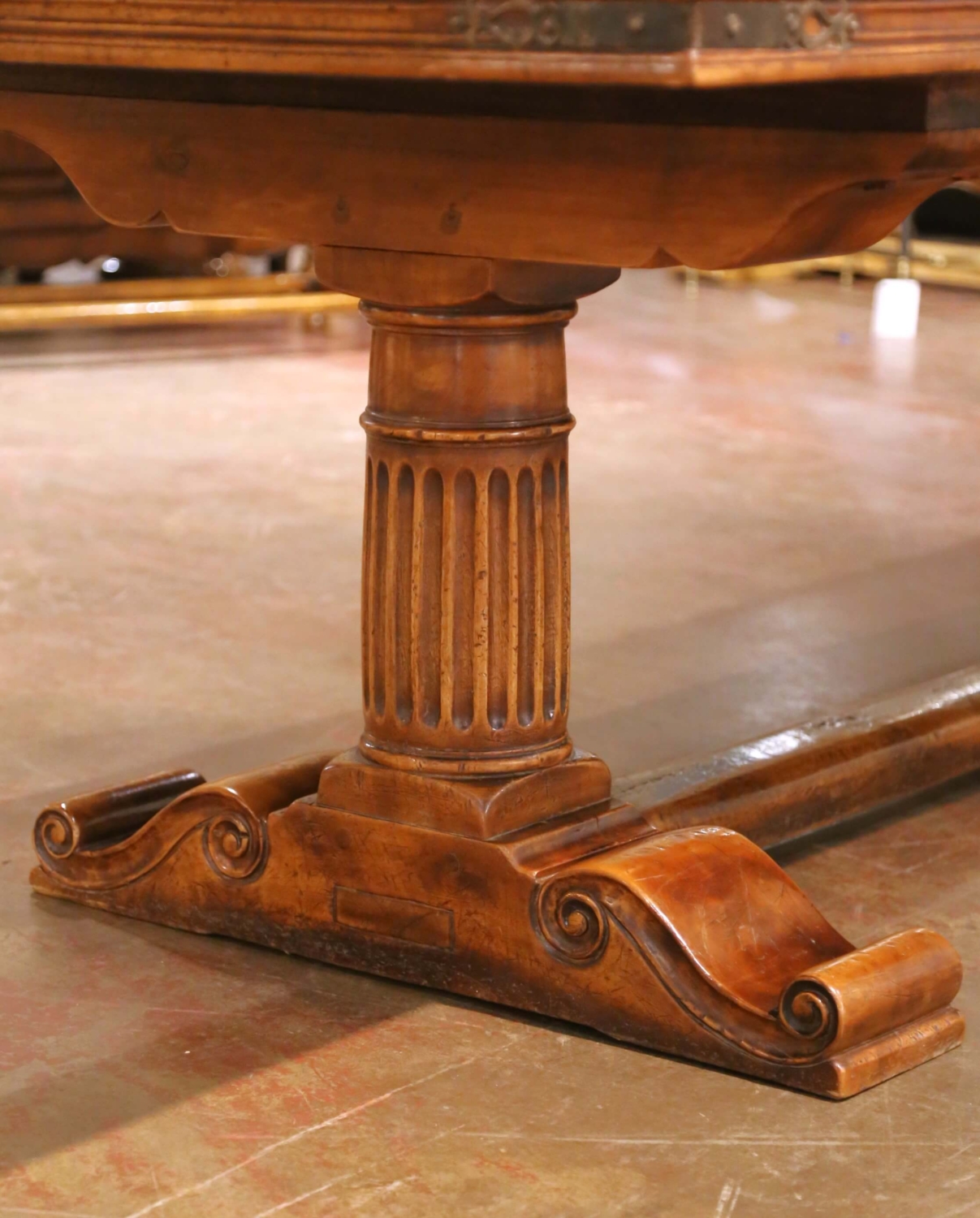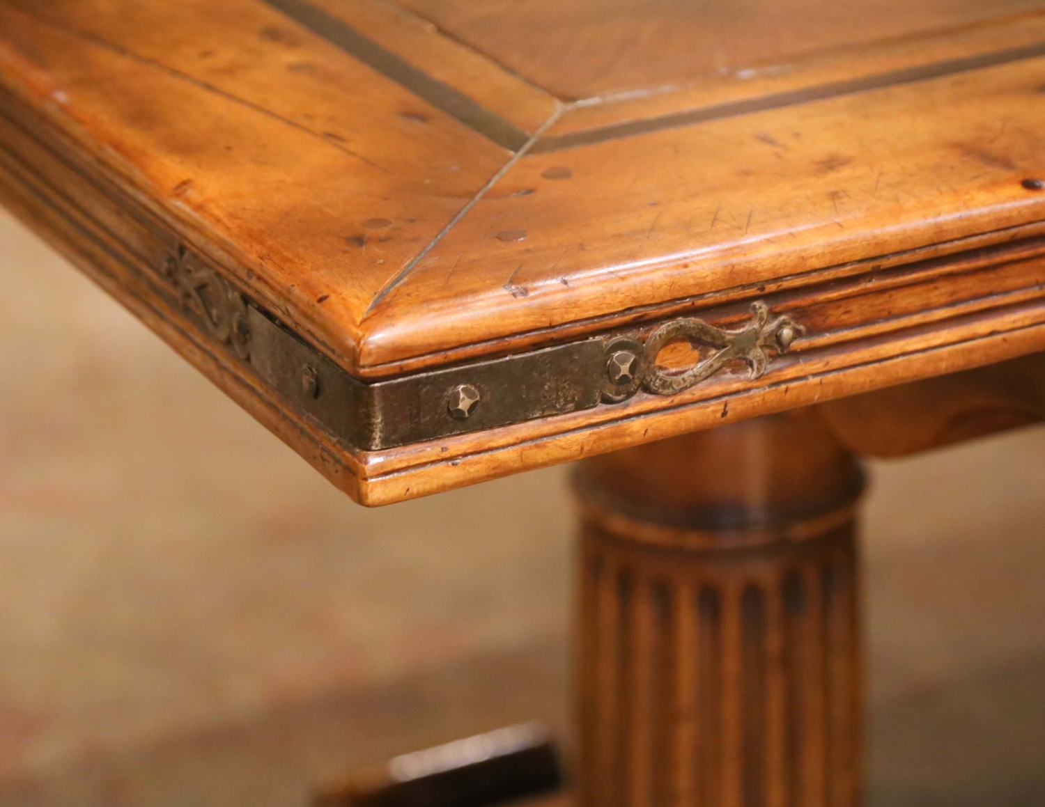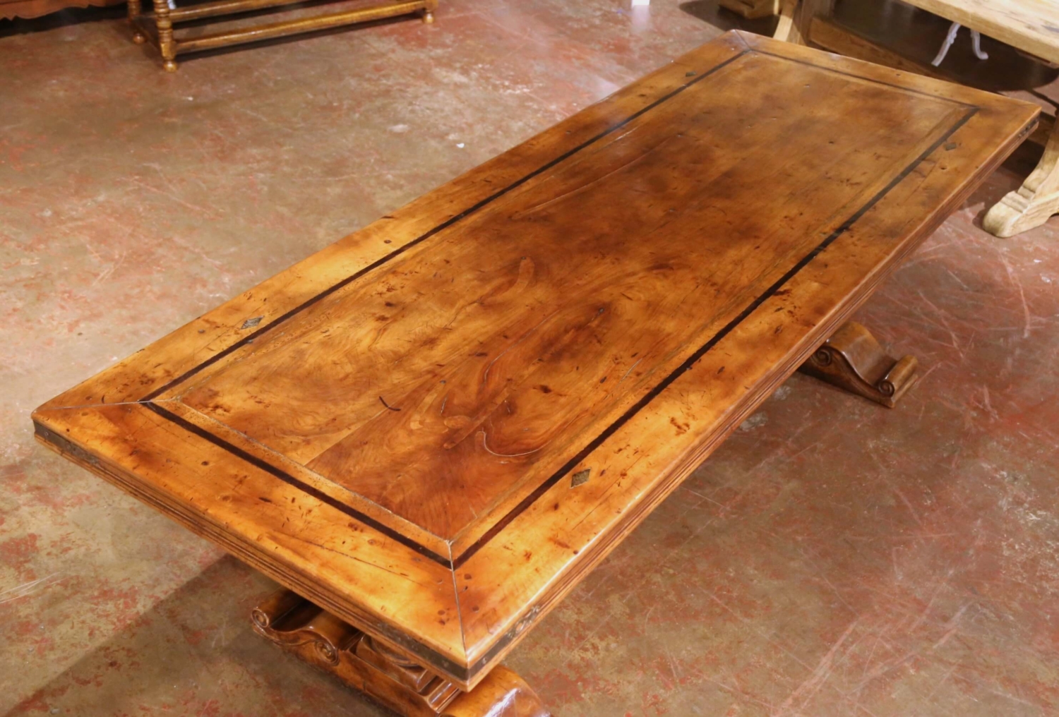 Built in the Pyrenees circa 1960 using reclaimed 18th century walnut, this impressive antique monastery refectory table reflects the bold architectural presence of Louis XIII design. The wide and long rectangular top is framed with a dark inlaid border and accented at each corner with iron diamond motifs. A forged iron band wraps the apron, punctuated with decorative iron mounts, adding strength and character. The table rests on two substantial pedestal supports with fluted Greek column forms, raised on scroll-carved trestle bases and joined by a thick central stretcher. The silhouette is grounded and monastic. The walnut showcases a beautiful patina with intentional distress, surface wear, old marks, and a ton of character throughout. The rich honey and amber tones, combined with the natural imperfections of the reclaimed wood, give the piece warmth and authenticity true to an antique refectory table. A grand, wide and long dining table that would easily seat 12 guests, perfect for a large family dining room, ranch house, or mountain retreat. Excellent condition commensurate with age and use. Dimensions: 102″W x 39″D x 31″H
