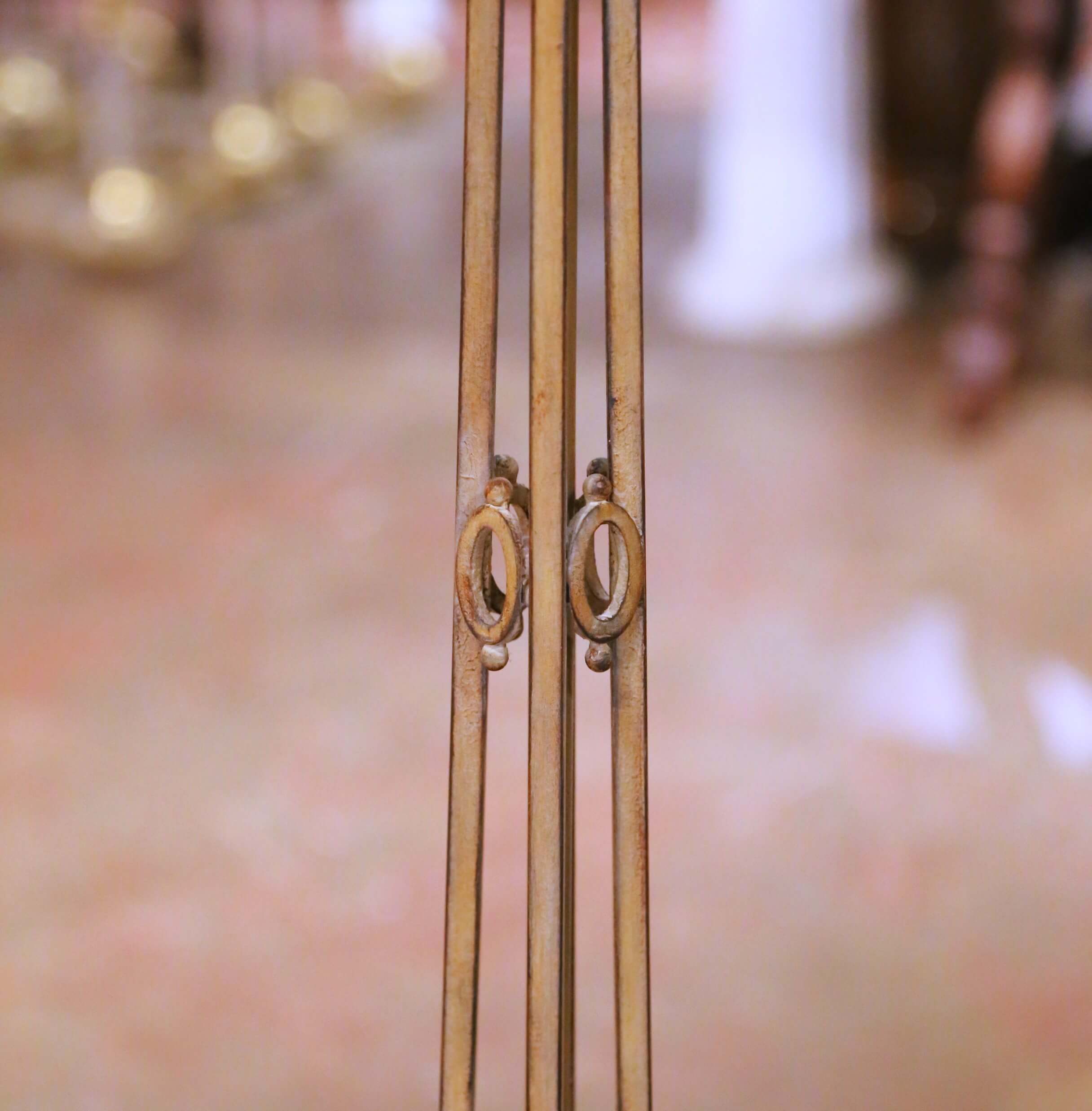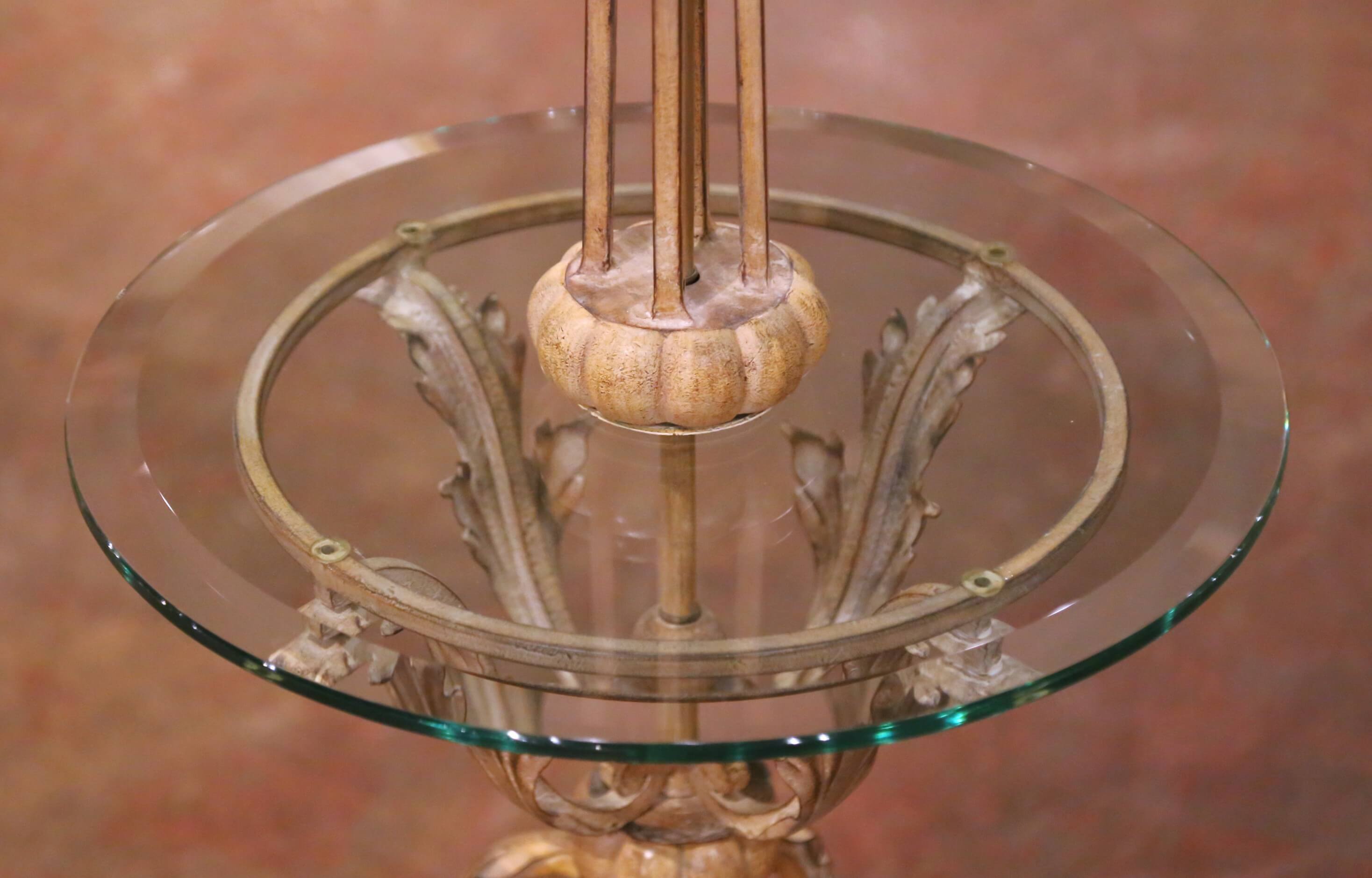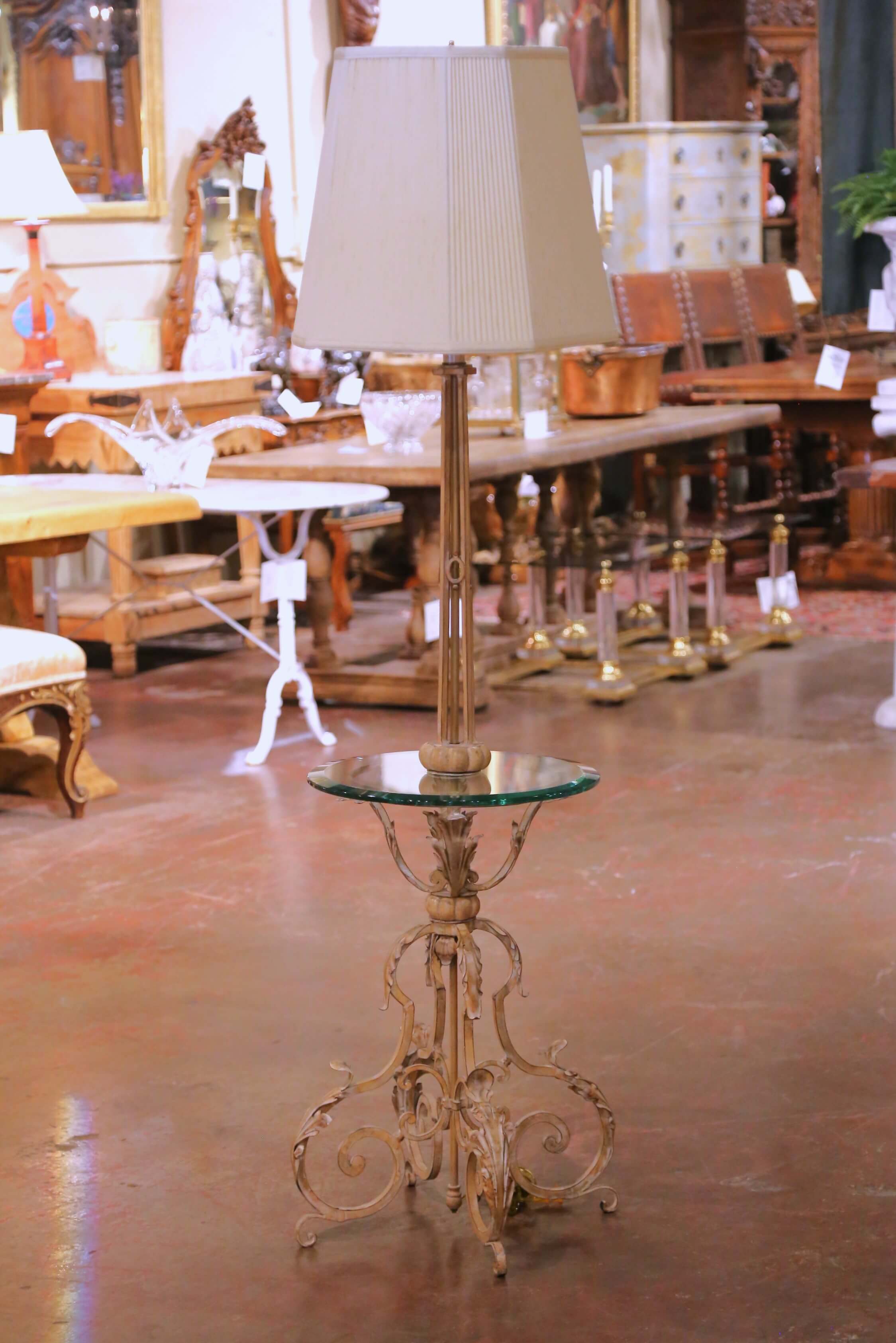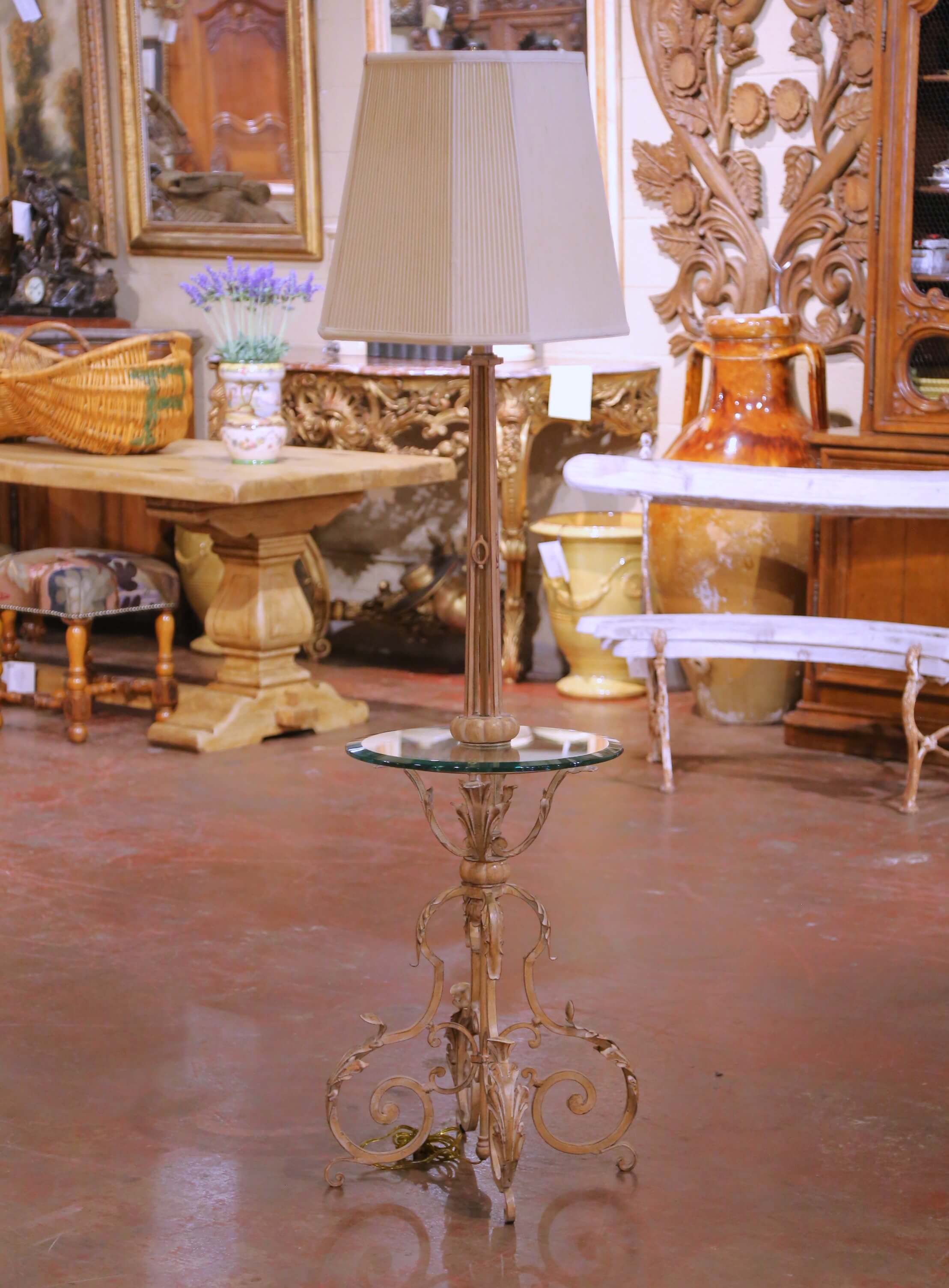 Place this elegant antique floor lamp and side table combination in a living room, salon, or reading corner for both function and decorative presence. Crafted in France circa 1960, the tall iron standard features a finely worked structure with a tripod base adorned with hand-forged scrolled motifs and acanthus leaf embellishments, showcasing a graceful Louis XV–inspired silhouette.
