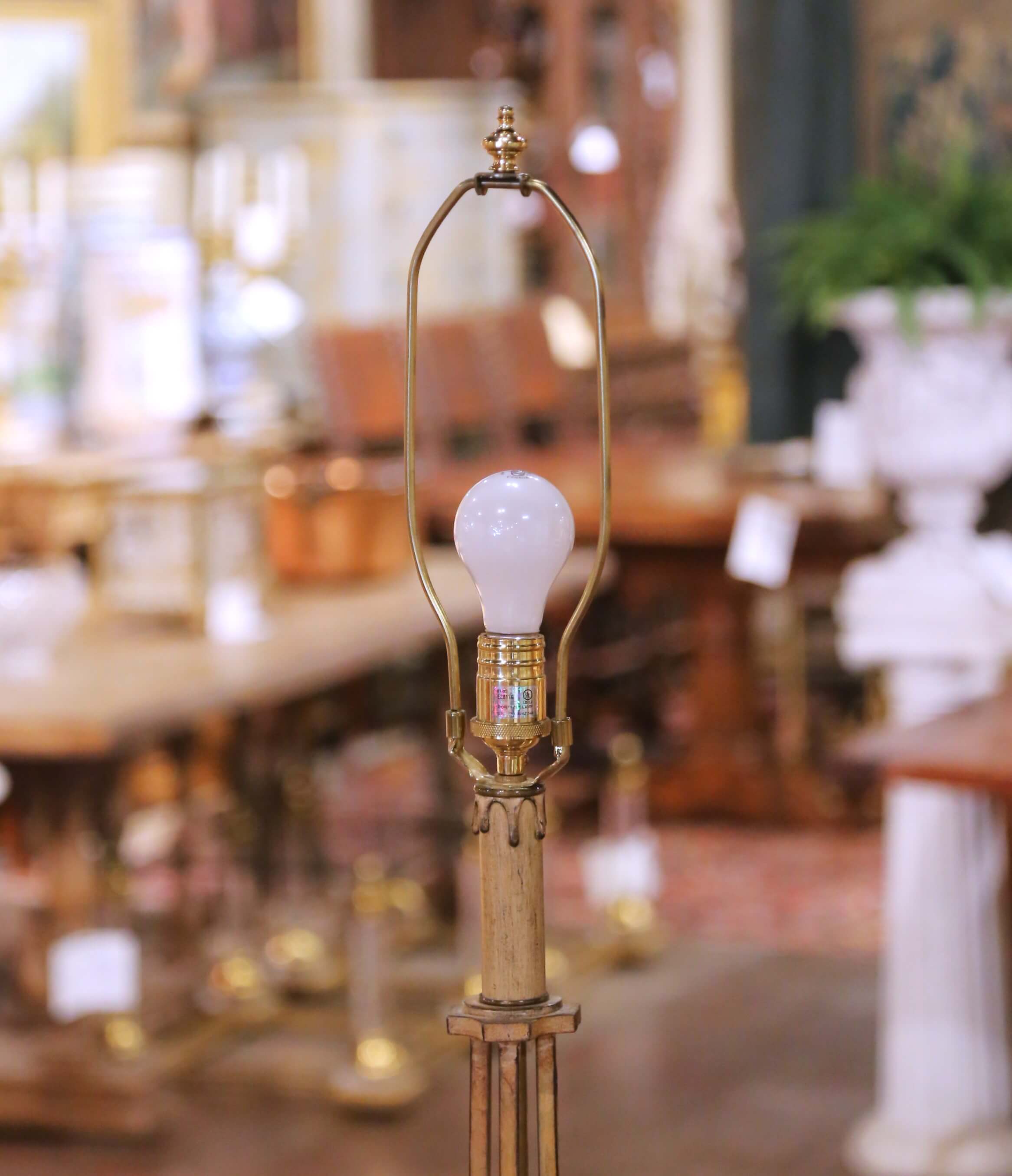 The slender shaft rises with a fluted and reeded design, accented with small ring details, leading to a single light fitted with a classic socket and harp. The piece retains its original circular glass shelf, offering a practical surface for a drink or book, supported by a decorative foliate bracket just above the base. The metal frame is finished in a warm gilt patinated tone with soft wear throughout, enhancing its authentic antique character.