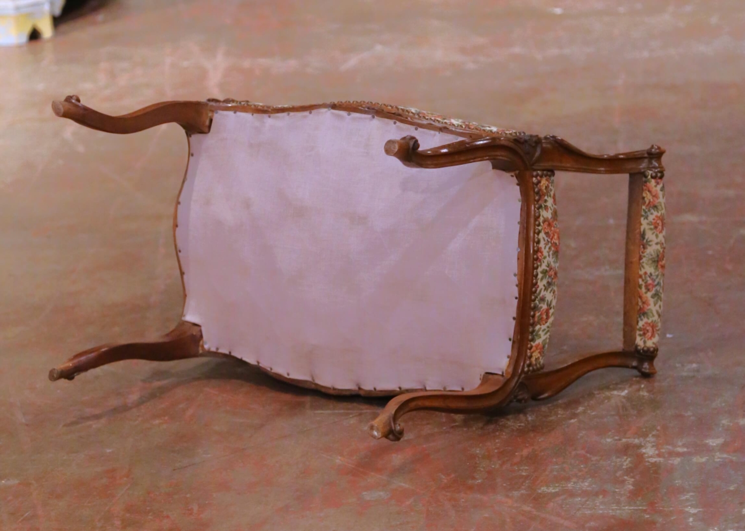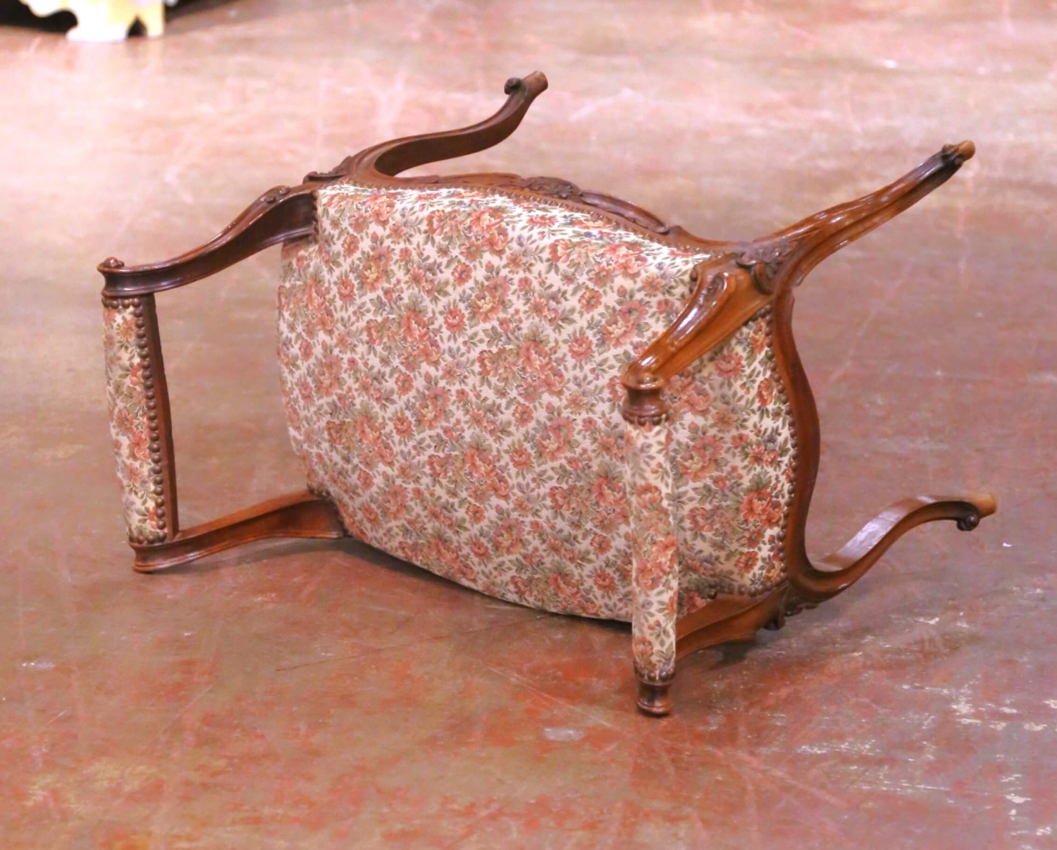 This elegant antique French piano bench was crafted in the mid-century period, circa 1950, and executed in the Louis XV style, showcasing graceful cabriole legs, flowing lines, and refined carved detailing. Constructed of solid walnut, the bench displays a warm and rich patina that enhances the natural grain and emphasizes the sculptural quality of the frame. The shaped apron is centered by a carved floral reserve with scrolling foliage, a decorative motif inspired by classic Louis XV design. The generously padded seat is upholstered in a floral tapestry-style fabric with soft pink, green, and neutral tones, secured with traditional brass nailhead trim. Gently curved arms at either end provide visual balance and subtle support, giving the bench both decorative appeal and practical versatility. This antique piano bench is in excellent condition commensurate with age and use, with light wear consistent with its antique nature. It is ideal for use at a piano, vanity, or dressing table, and also works beautifully as an accent bench at the foot of a bed or in a hallway, offering timeless French elegance with mid-century craftsmanship. Dimensions: 30″ W x 17″ D x 25″ H Seat height: 18″