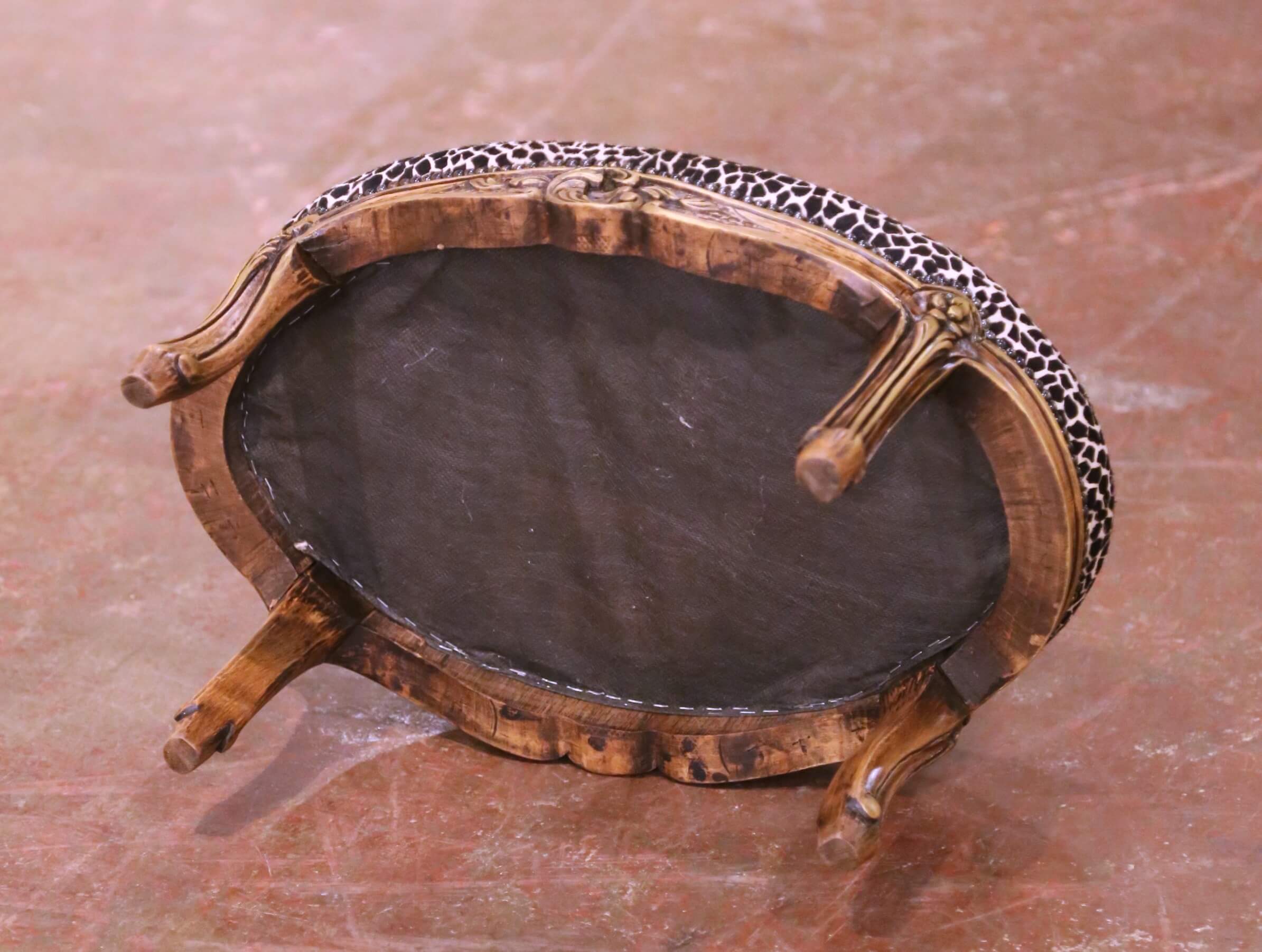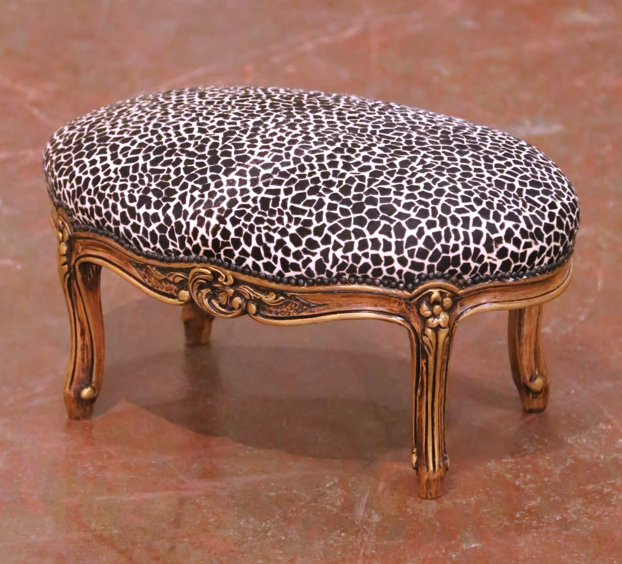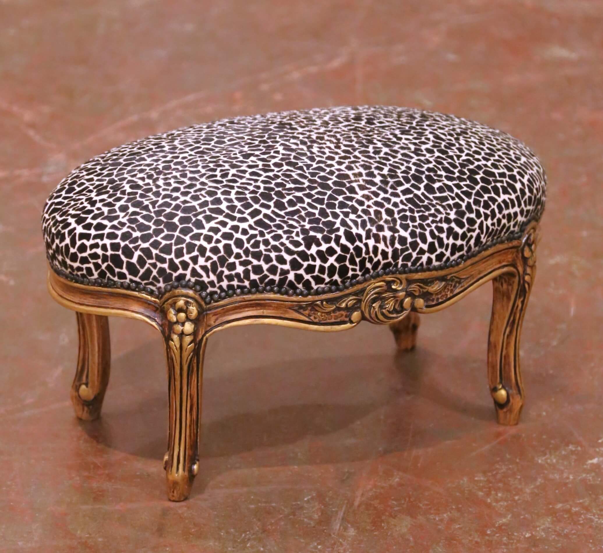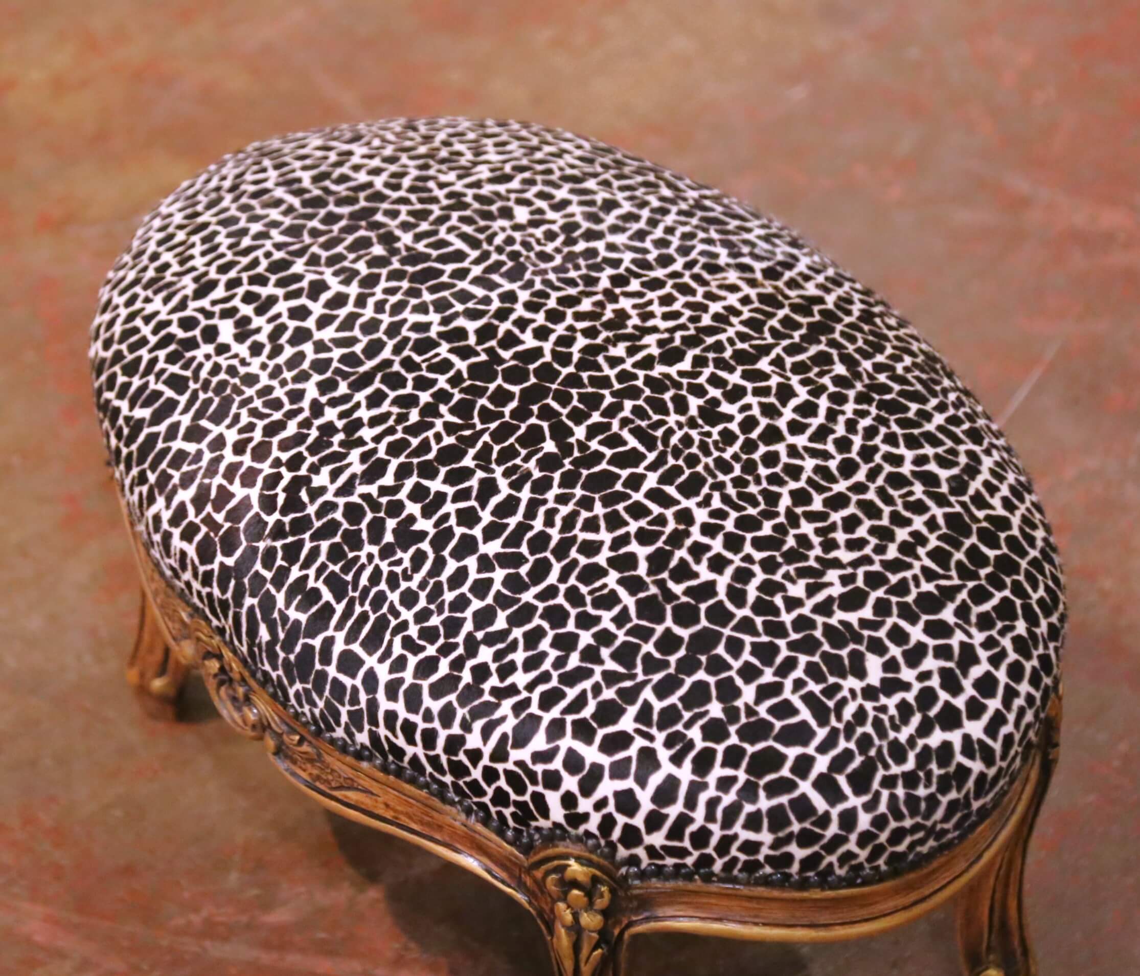 Add a touch of elegance to a bedroom or sitting area with this antique footstool. Crafted in France circa 1960, the oval stool is built of walnut and carved in the graceful Louis XV manner, featuring a scalloped apron embellished with delicate floral and foliate motifs. The cabriole legs are accented with carved details and terminate in petite feet, all highlighted with subtle touches of gilt over a warm and rich walnut patina.