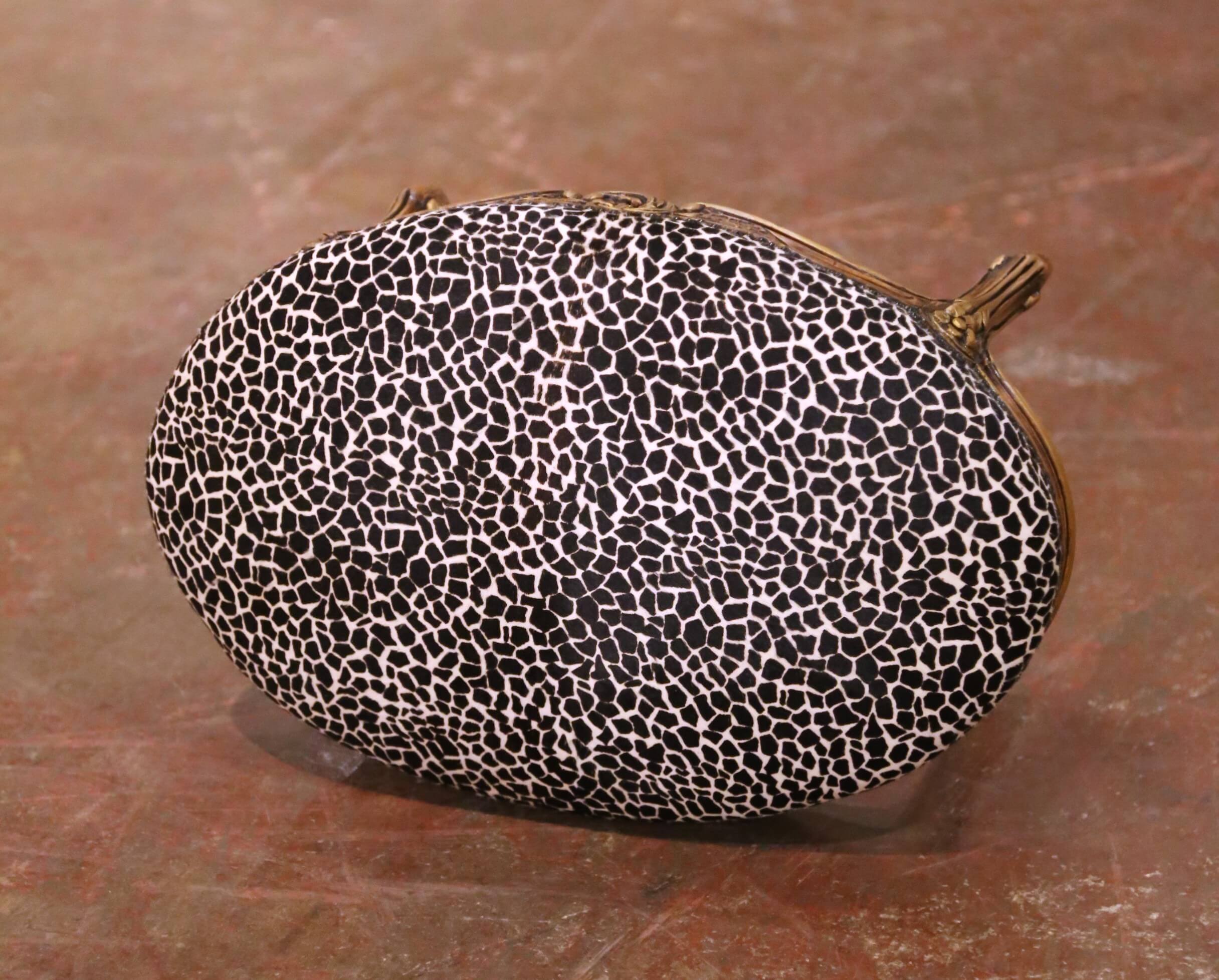 The upholstered seat is dressed in a striking black and cream patterned fabric, finished with decorative nailhead trim along the perimeter, adding a bold contrast to the classic frame. The stool is in excellent condition commensurate with age and use, and would make a charming accent at the foot of a bed, in a dressing room, or as a decorative ottoman in a living space.