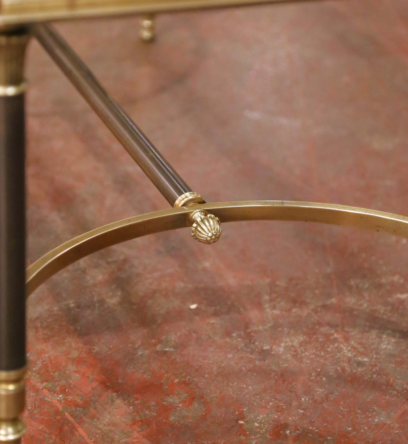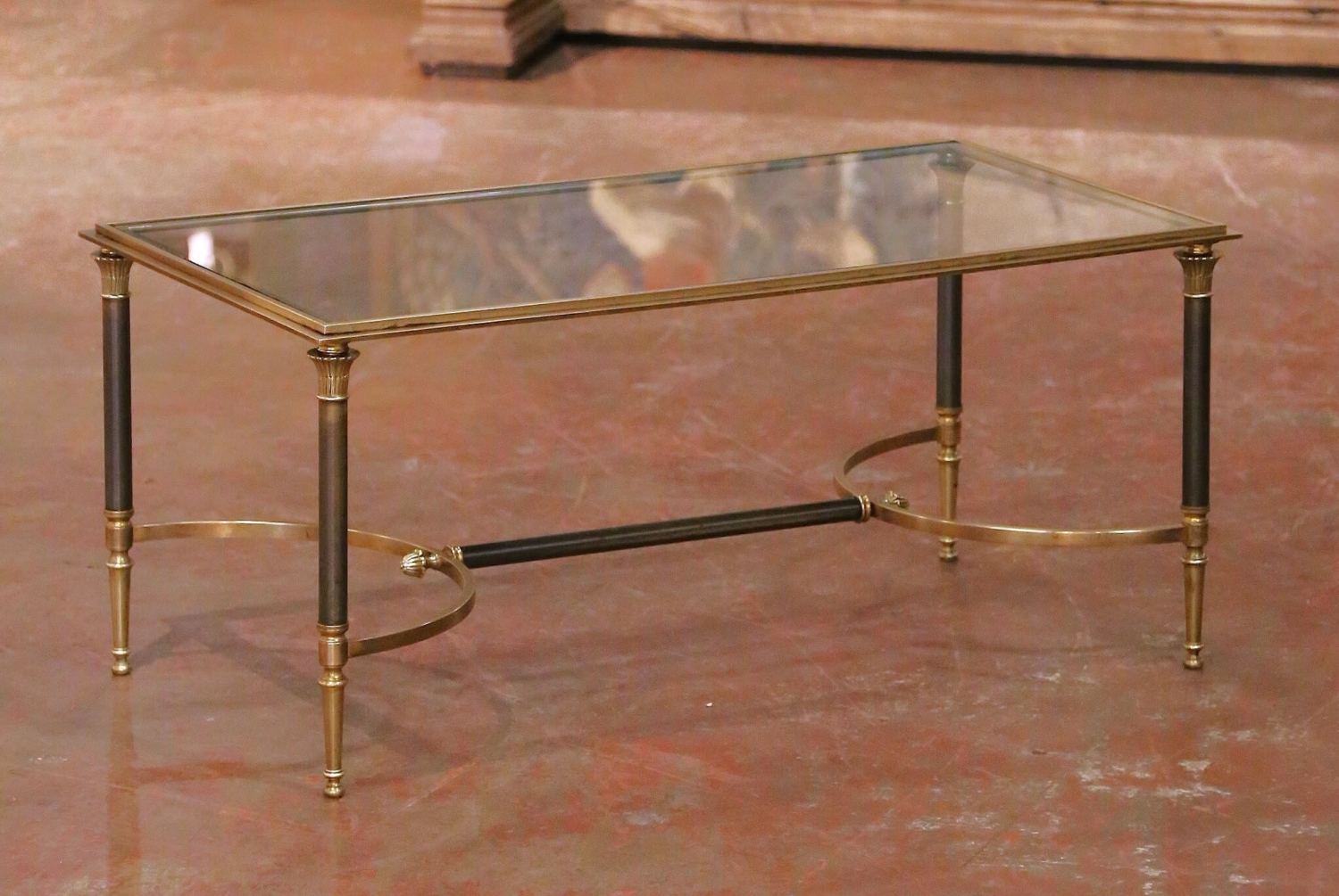 This elegant French coffee table by Maison Jansen was crafted circa 1960 and reflects the refined neoclassical aesthetic for which the celebrated Paris firm became internationally known. The rectangular table features a clear inset glass top set within a slender parcel-gilt frame, allowing the architectural metal base to remain fully visible. The base rises on four columnar legs combining gilt capitals and tapered feet with steel-toned shafts, creating a sophisticated two-tone contrast. Gracefully curved oval stretchers connect the legs and are joined by a central crossbar, adding both structural stability and visual rhythm to the composition. The restrained ornamentation and balanced proportions recall Louis XVI and Directoire design interpreted through mid-century materials. The table is in excellent vintage condition commensurate with age and use, with light wear consistent with careful preservation. Maison Jansen, founded in Paris in 1880 by Jean-Henri Jansen, became one of the first truly international interior design houses, serving aristocratic and diplomatic clients across Europe, the Americas, and the Middle East. Pieces such as this coffee table illustrate the firm’s mastery of classical design translated into elegant modern furnishings. Dimensions: 37″W x 19.25″D x 16.5″H