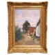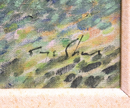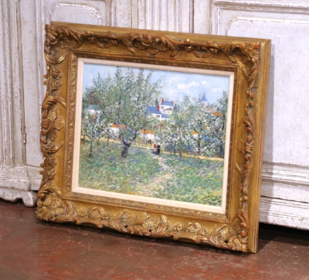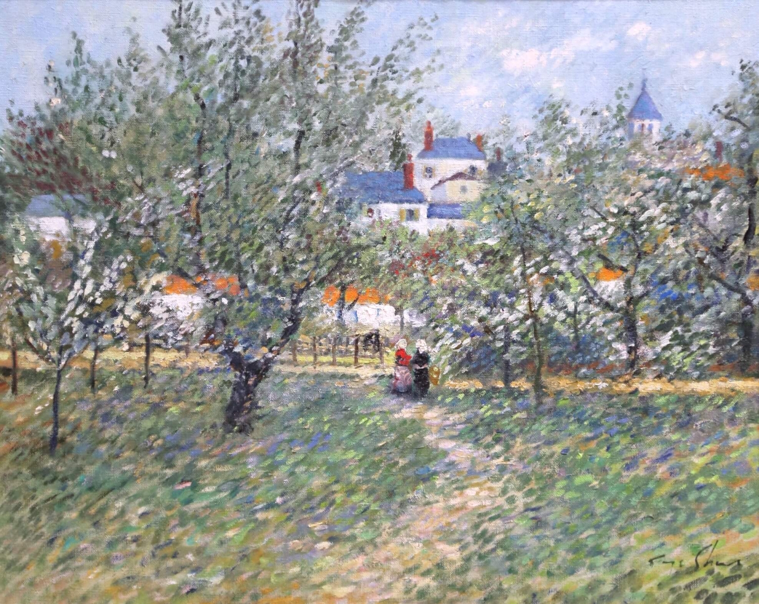 Painted by Franco-American artist Georges Shawe (1915–1995), this luminous landscape titled “Orchard” captures the tranquil beauty of the French countryside in springtime. Executed in oil on canvas, the composition reveals a sunlit orchard in full bloom, where flowering trees open onto a distant village crowned with a church steeple beneath a soft blue sky. Two women stroll along the path, adding a gentle narrative touch to the idyllic rural scene. Shawe’s expressive brushwork and vibrant interplay of greens, blues, and ochres reflect the influence of Post-Impressionism and the lyrical tradition of the École de Paris. Born in France, Shawe lived and worked between Paris and the United States, exhibiting widely during the mid-20th century. His paintings, often devoted to pastoral landscapes and provincial architecture, celebrate light, serenity, and the harmony of nature. The artwork is signed lower right corner, remains in excellent condition, and is presented in its richly carved giltwood frame of the period. Measures: 25″ W × 29″ H overall.