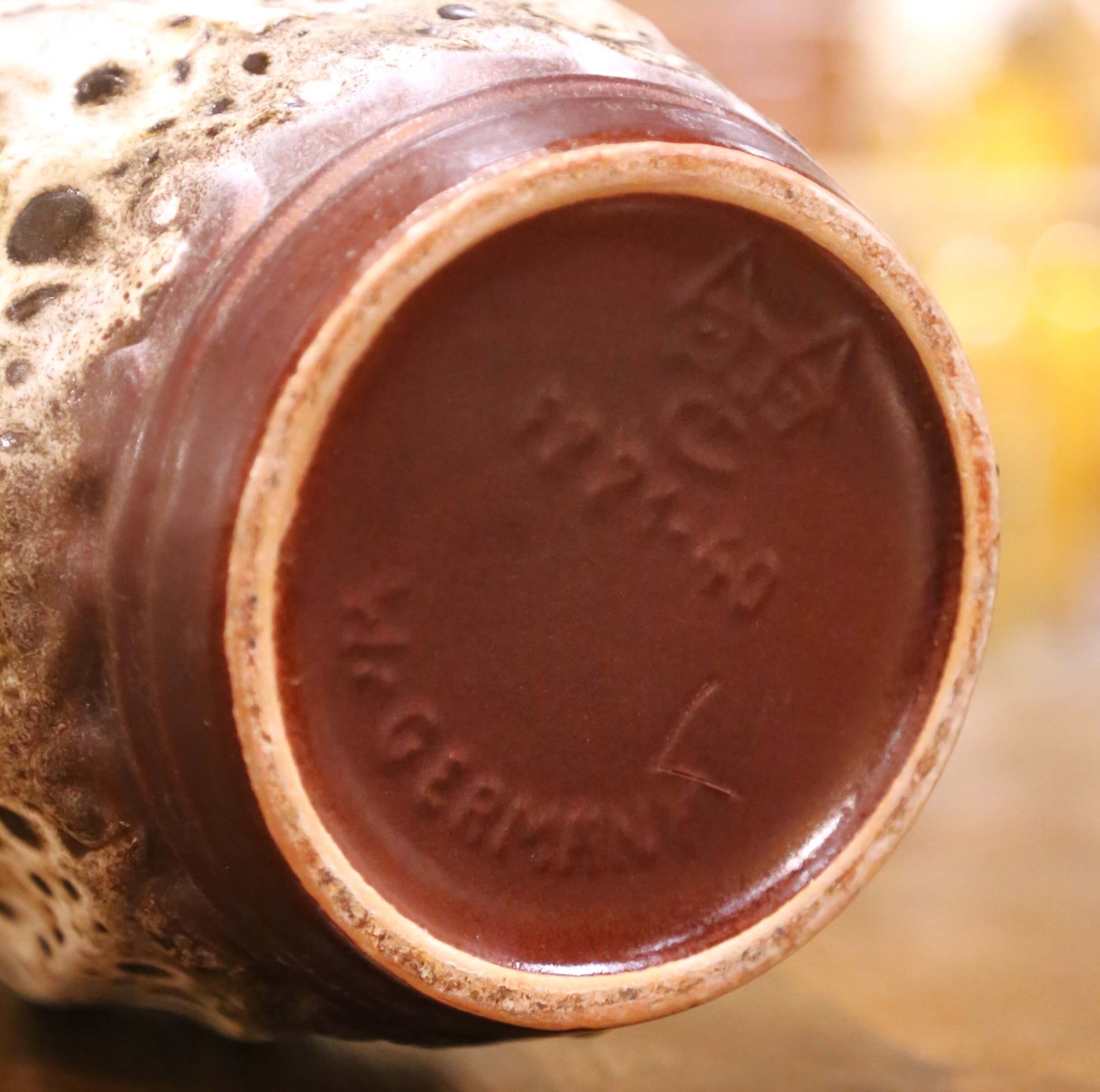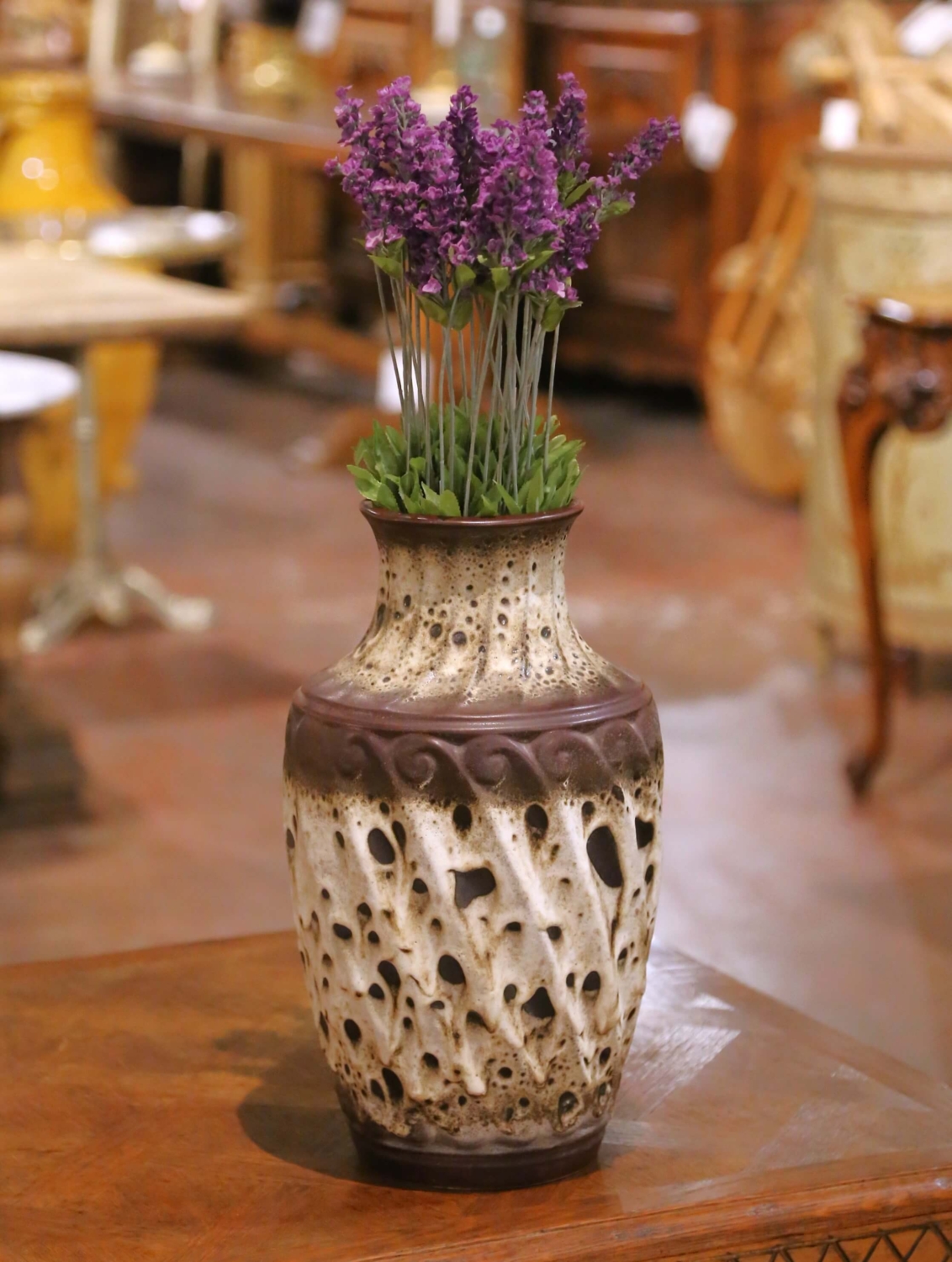 Circa 1970, this striking antique stoneware vase was crafted in West Germany by the renowned ceramics factory Scheurich Keramik. The tall vessel features a classic baluster silhouette with a flared neck and rounded shoulder, giving the piece a strong sculptural presence ideal for a console, entryway, or floor display. The vase is made of high-fired stoneware and decorated with a dramatic volcanic “fat lava” glaze, characteristic of West German studio pottery of the period. Rich chocolate brown tones appear at the rim and shoulder, while the body is covered in a heavily textured cream and caramel glaze that bubbles and erupts across the surface, creating deep cratered openings and organic patterns. A molded band of scrolling ornament around the shoulder adds subtle relief and structure to the dynamic glaze decoration. The underside bears the impressed mark “127-40 W. Germany,” indicating the Scheurich model number and the original height in centimeters. West German pottery of this era is widely collected for its bold glazing techniques and distinctive mid-century design. Excellent antique condition commensurate with age and use, with beautiful original glaze and strong decorative presence. Dimensions: 9.5″ Diameter x 16″ H.
