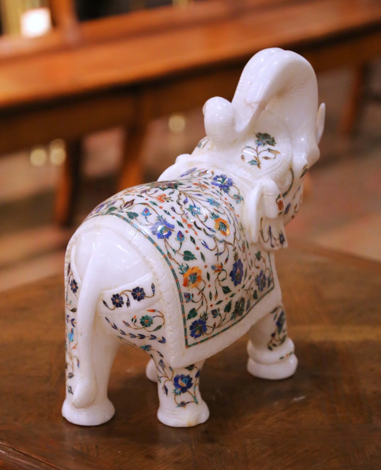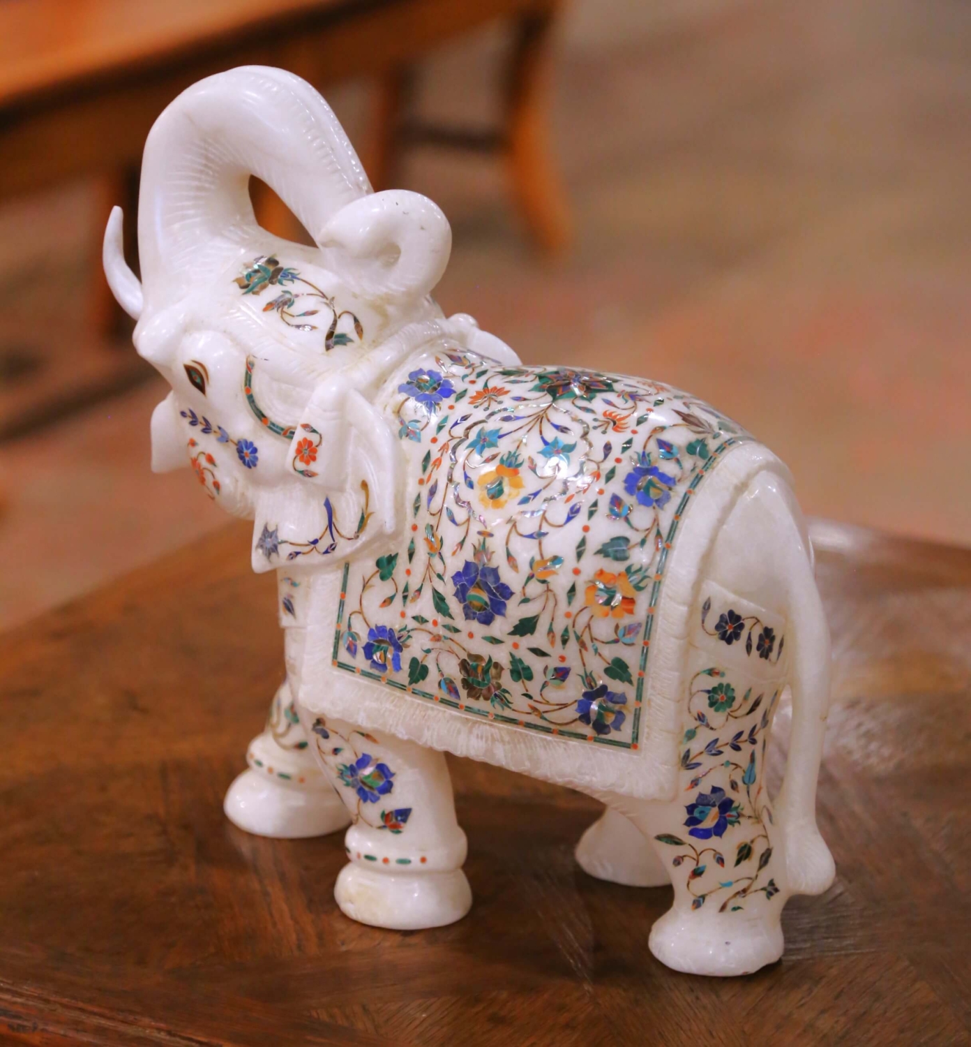 This finely carved elephant sculpture was produced in northern India during the mid-20th century and reflects the continuation of Mughal-inspired marble carving and pietra dura inlay traditions. Executed in solid white marble, the figure is crisply modeled with a raised trunk, expressive facial features, and well-defined legs, demonstrating skilled hand carving and confident sculptural form. The body is richly decorated with intricate hardstone floral inlay in shades of cobalt blue, turquoise, green, ochre, and terracotta. Scrolling botanical motifs embellish the saddle cloth, head, and legs, drawing directly from classical Indian decorative vocabulary long associated with marble inlay work from the Agra and Jaipur regions. The polished marble surface provides an elegant contrast to the colorful inlay, enhancing the clarity and visual depth of the design. Symbolic of strength, wisdom, and good fortune, the elephant serves as both a decorative sculpture and a culturally resonant object. Minor surface wear and light marks are consistent with age and handling and contribute to its authentic character. This antique marble sculpture is in excellent condition commensurate with age and use. Dimensions: 12.5″W x 6.5″D x 13″H.