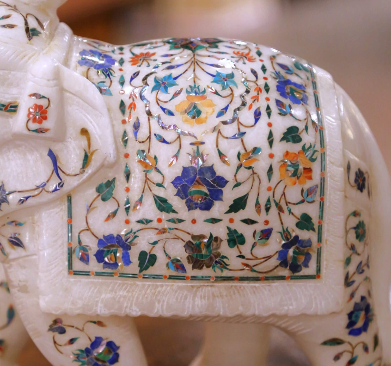 Mid-Century Indian Marble Elephant with Pietra Dura Floral Inlay