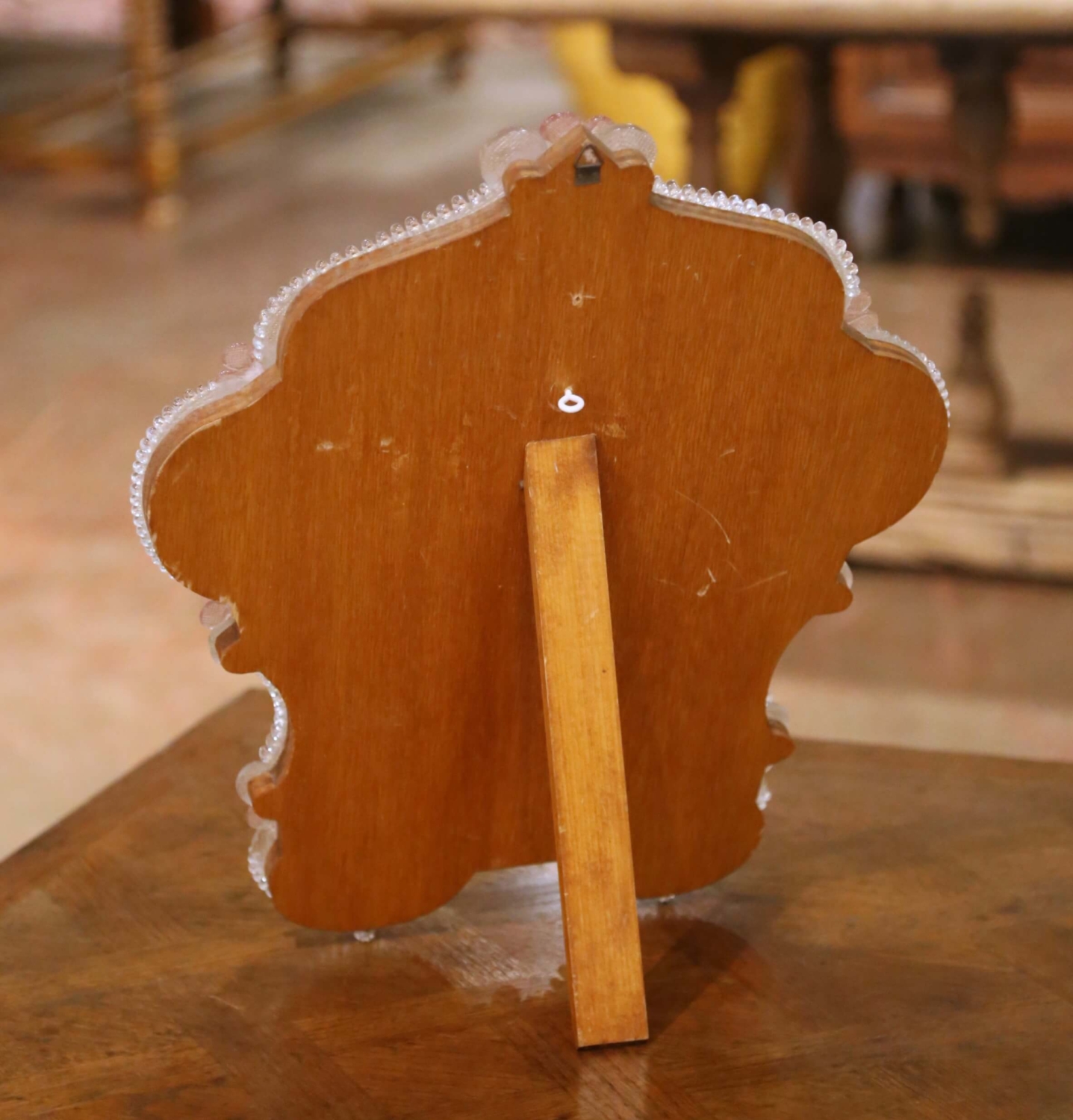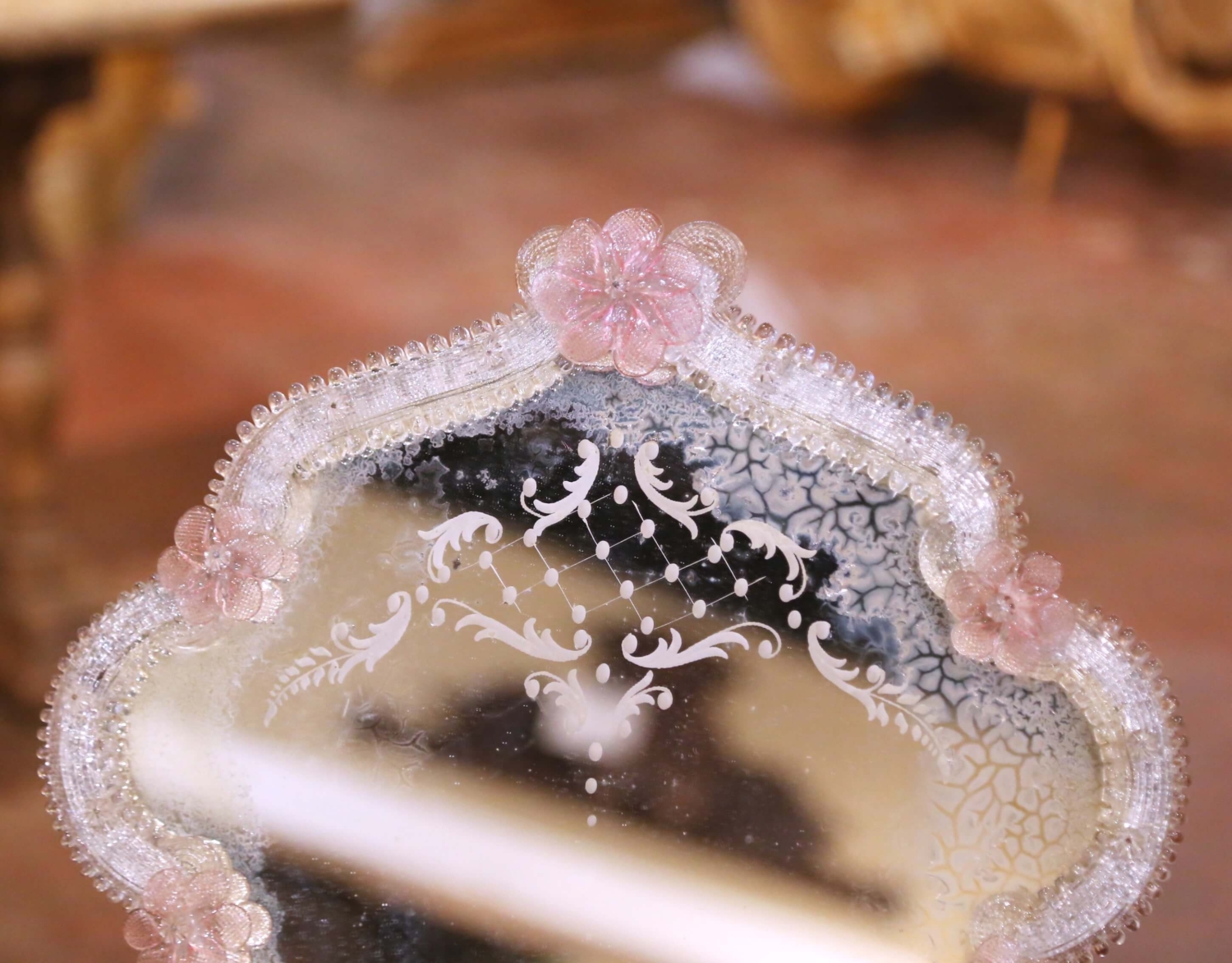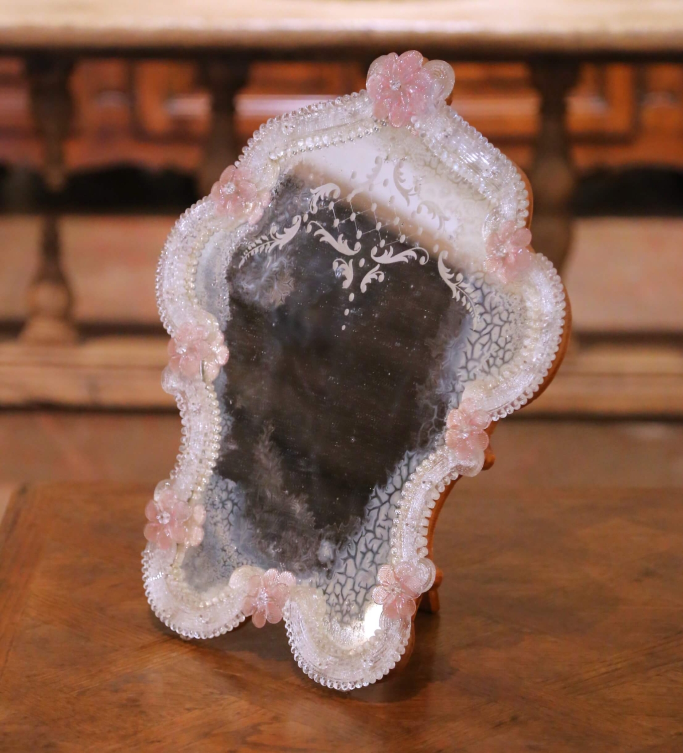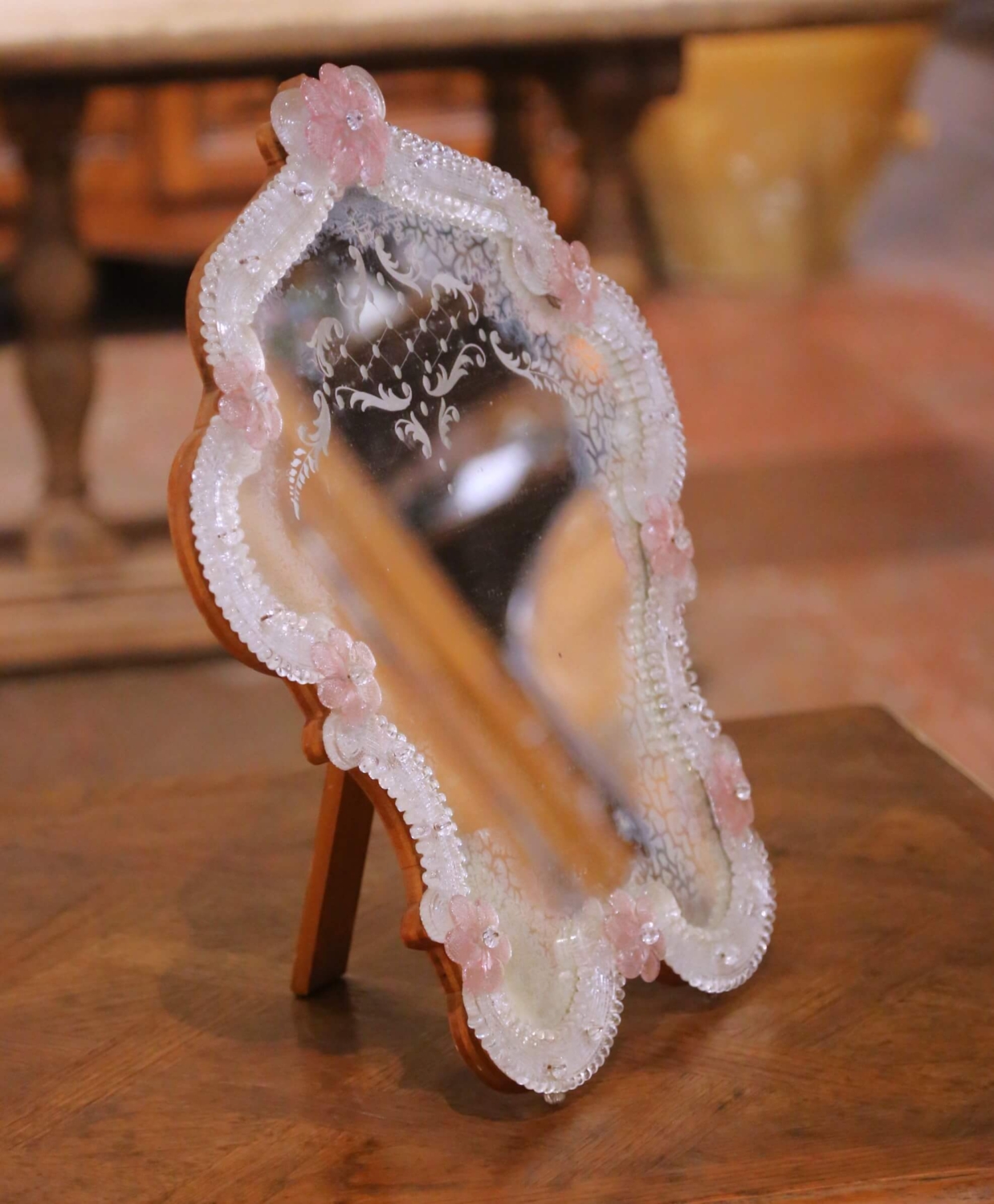 This elegant antique table mirror was created in Murano, Italy circa 1960 and reflects the refined tradition of Venetian glass artistry. The free standing vanity mirror features a shaped and scalloped silhouette, richly adorned with handmade clear Bohemian-style glass flowers and delicate leaves applied around the perimeter. Soft blush accents and beaded edging create depth and luminosity, allowing the frame to beautifully catch and refract light. The mirror plate is further embellished with hand painted and etched floral decoration, including scrolling foliate motifs and a central lattice design that enhances its romantic character. Light age spotting to the plate is consistent with its vintage charm and authentic antique appeal. The craftsmanship of the applied glass elements demonstrates careful hand assembly, with each flower individually formed and affixed to the frame. The reverse retains its original wooden back with an easel support, allowing the piece to stand securely on a vanity, dressing table, or powder room console. The decorative mirror is in excellent condition commensurate with age and use and offers a refined touch of Italian glamour to any interior. Dimensions: 16.5″W x 8″D x 19″H