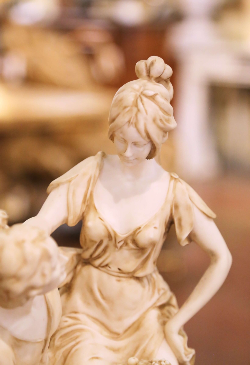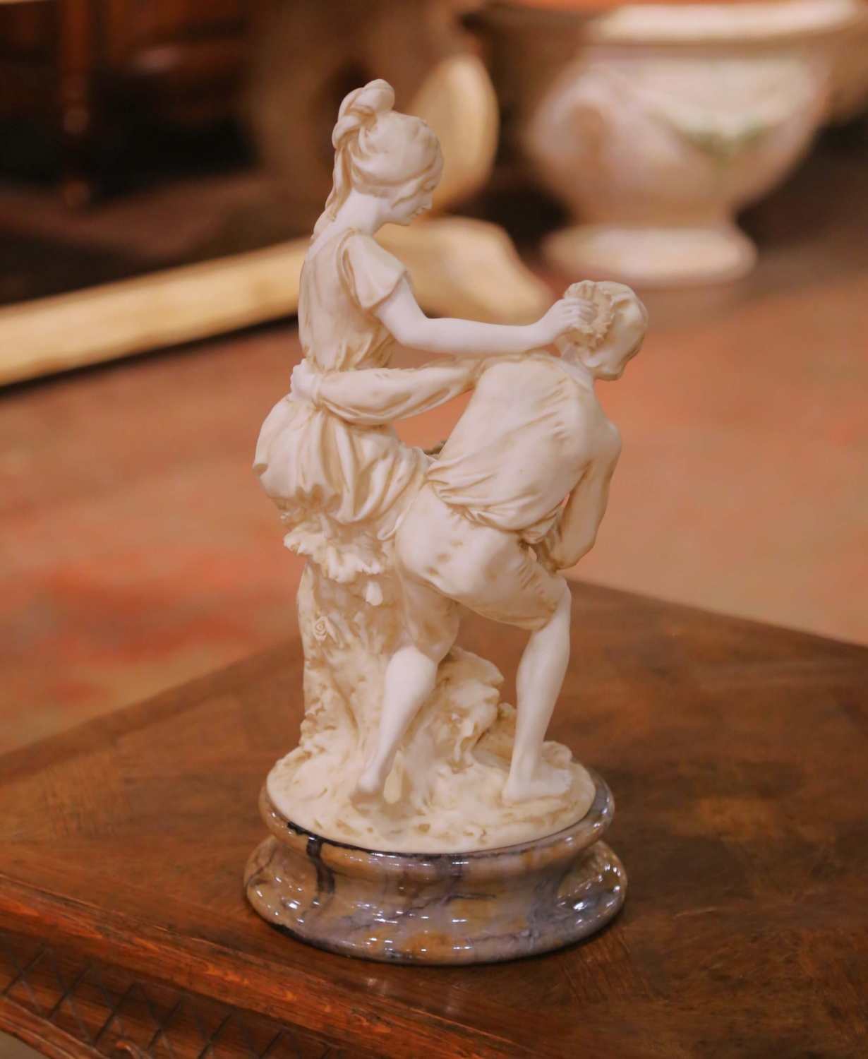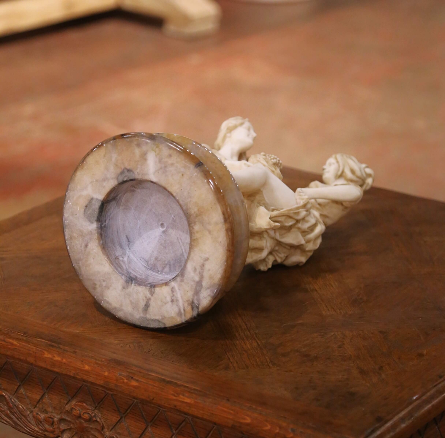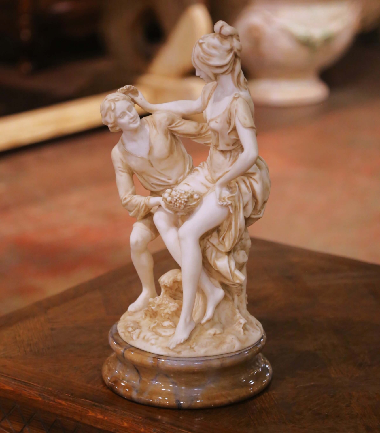 This refined mid-century Italian alabaster sculpture depicts a romantic Neoclassical figural group rendered with graceful movement and classical elegance. The composition features a seated young woman attended by a kneeling male companion offering a basket of fruit, a timeless pastoral motif symbolizing devotion and abundance. Carved in softly toned alabaster, the figures display delicate facial features, flowing drapery, and carefully modeled anatomy. Subtle hand-applied shading within the folds enhances depth and highlights the sculptural detail. The warm ivory coloration is beautifully complemented by the substantial circular marble base, which features natural honey and gray veining and a polished finish that adds contrast and stability. The piece reflects the enduring appeal of Neoclassical revival sculpture popular in mid-20th century Italy, combining romantic subject matter with refined craftsmanship. Ideal for display on a console, pedestal, or library table. The sculpture is in excellent condition commensurate with age and use, with natural tonal variation consistent with alabaster. Dimensions: 9″ Diameter x 18.5″H