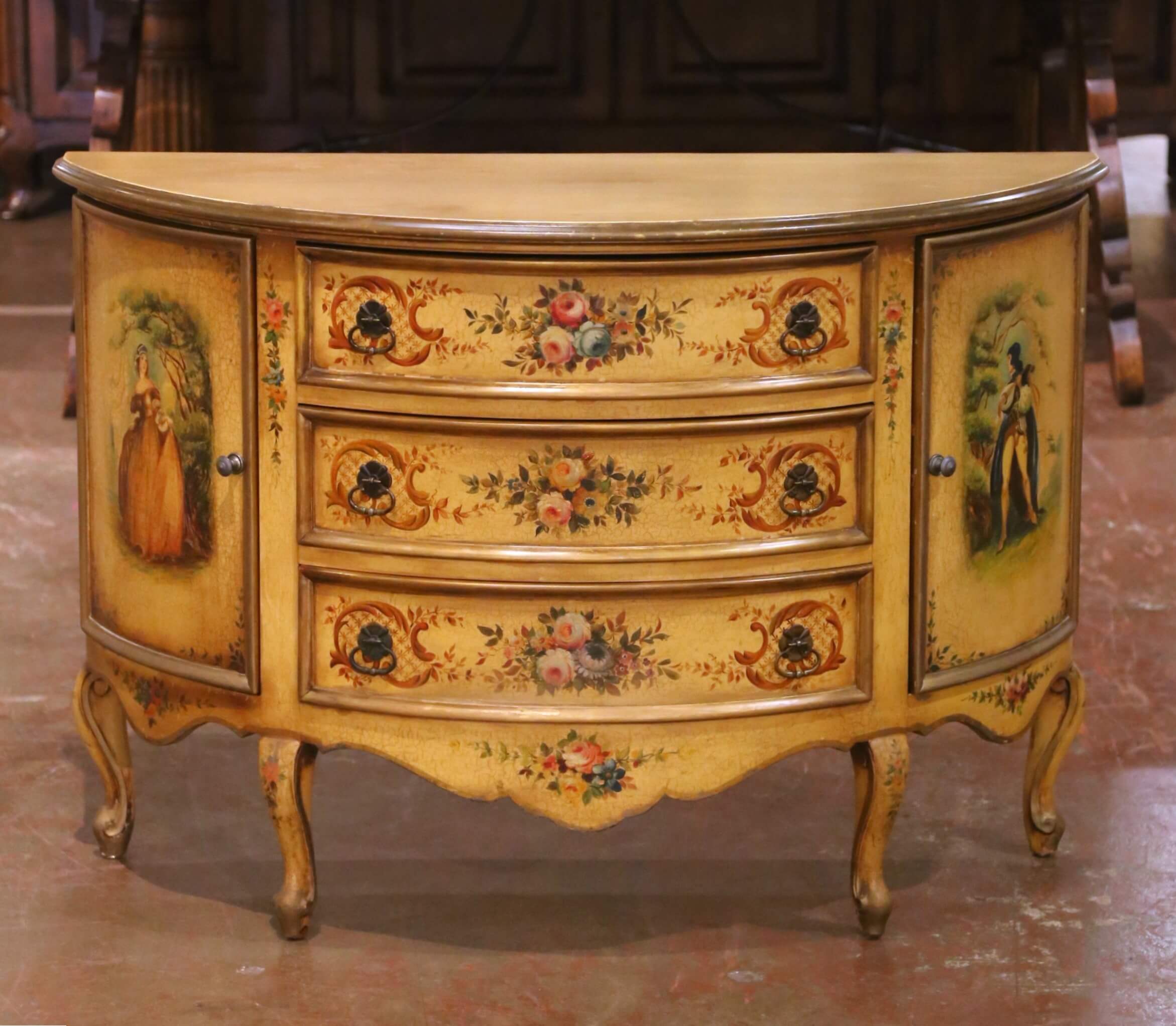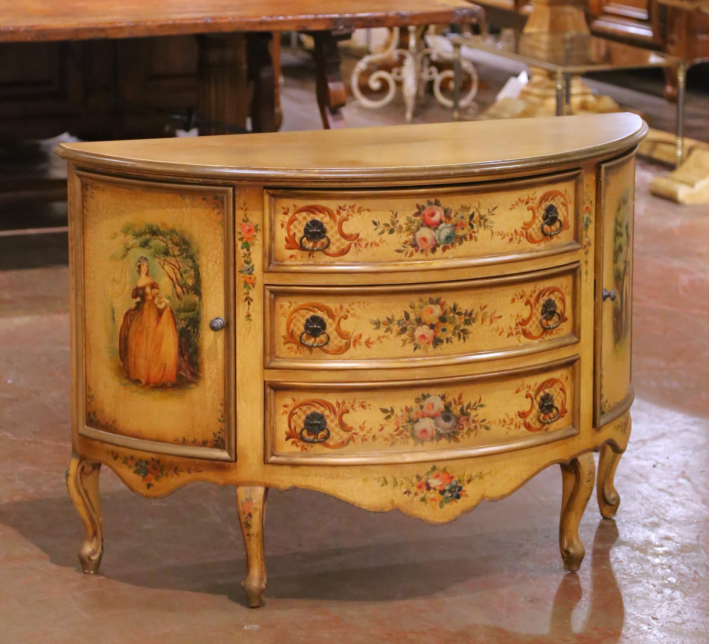 Mid-Century Italian Painted Demi-Lune Commode with Floral and Figural Panel