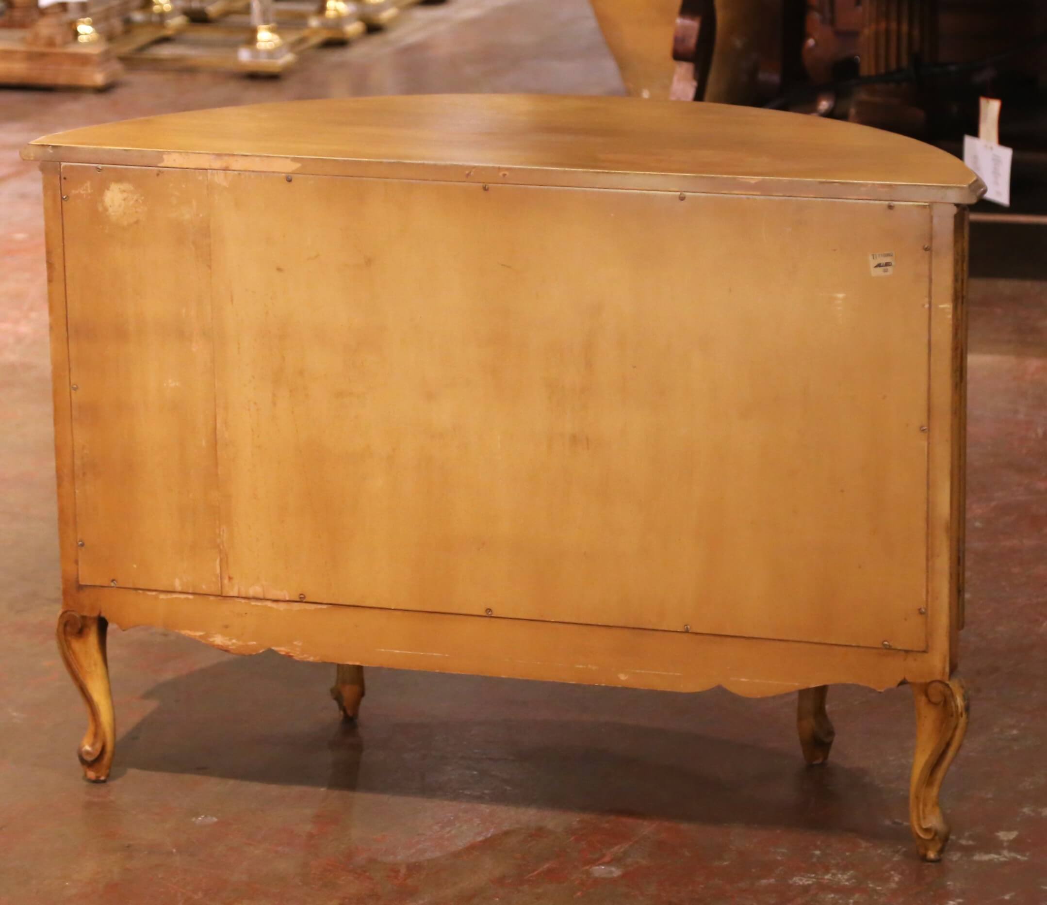 The top features a shaped front following the bombe silhouette and is finished in a complementary natural tone, creating a pleasing contrast with the painted base. Versatile in use, the commode could be placed in a bedroom, entry, or living space, and would also make a charming powder room vanity with the addition of a sink.