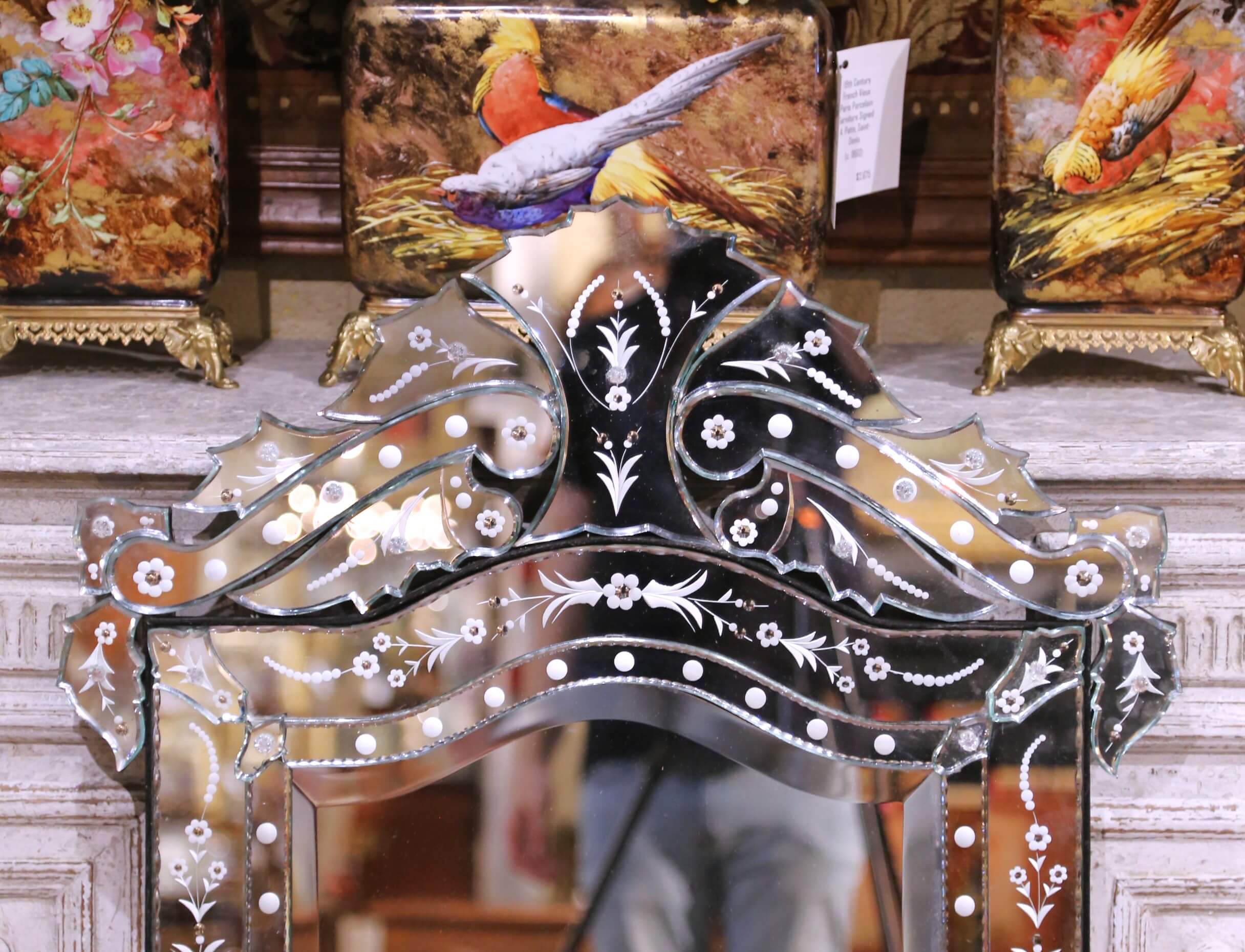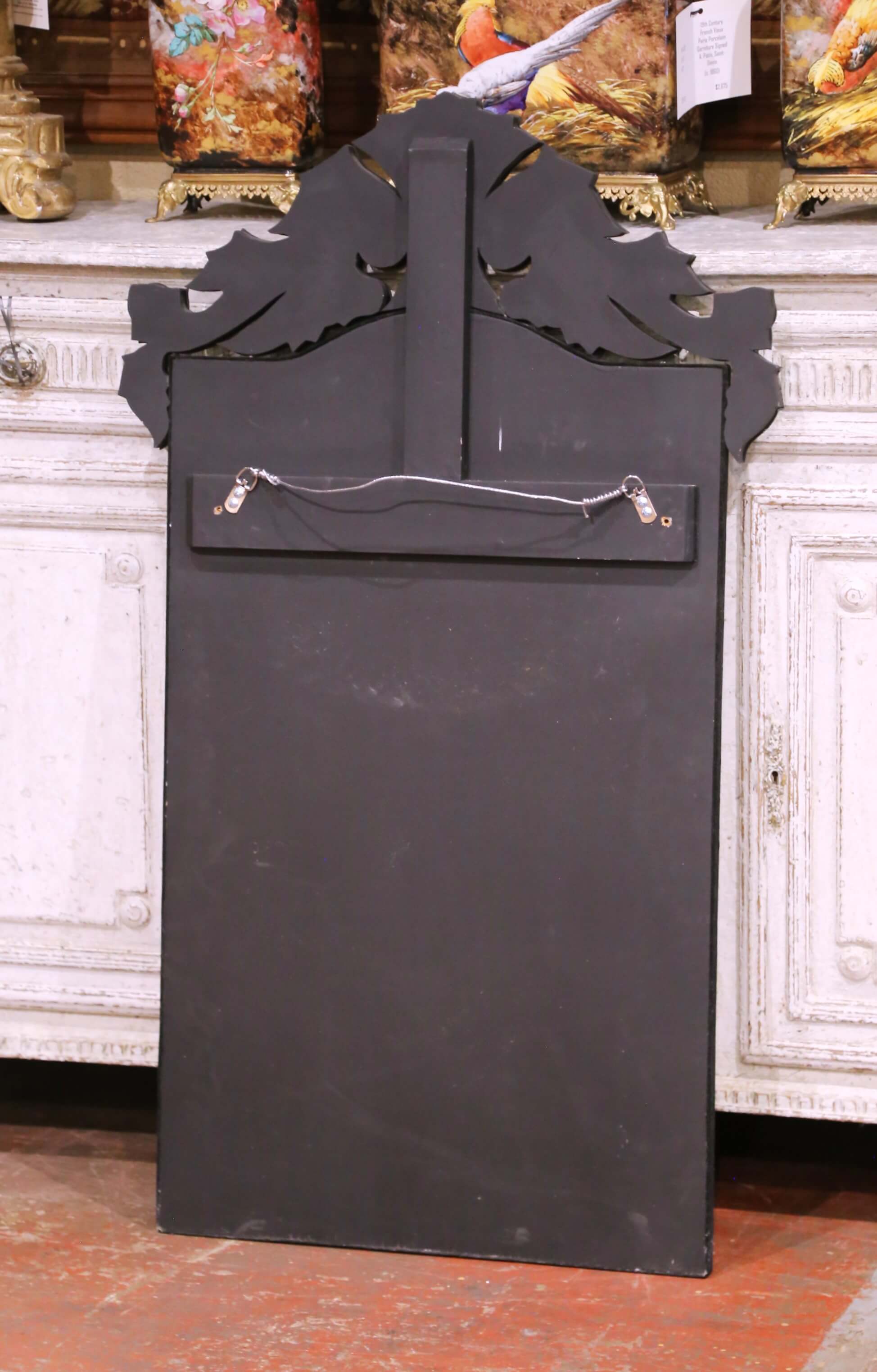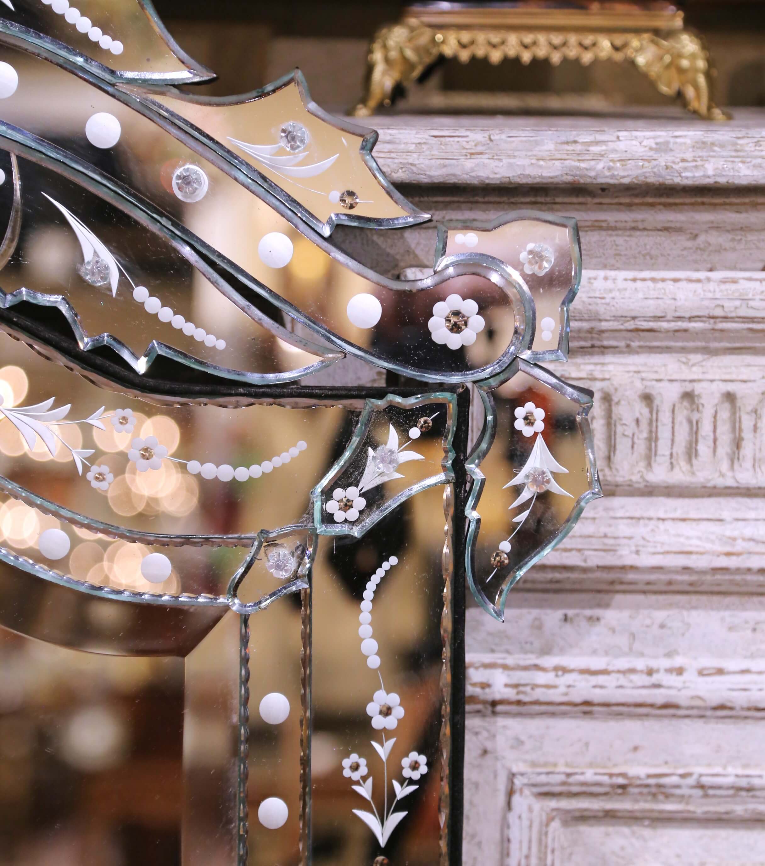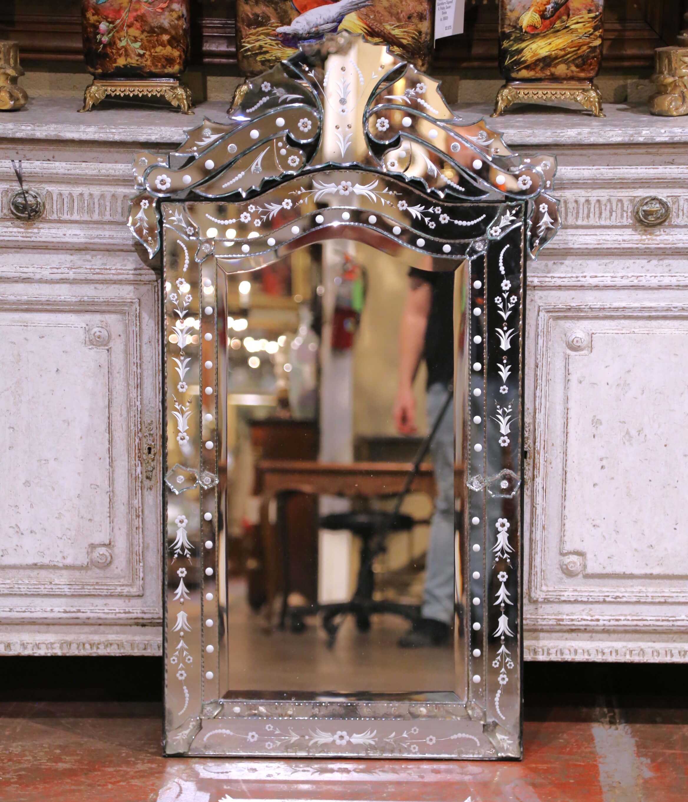 Crafted in Italy, circa 1970, this antique Venetian wall mirror showcases the refined artistry of mid-century Murano glasswork. The rectangular form is crowned with a beautifully shaped scalloped and crested pediment, composed of hand-cut mirrored glass panels assembled in the traditional Venetian manner over a wood backing. Each segment is delicately etched with stylized floral and foliate motifs, interspersed with dotted borders and accented by small rosette details, creating a light, decorative rhythm across the surface. The mirror features a beveled central plate framed by layered glass elements with softly undulating contours, adding depth and dimension. The etched decoration reflects the classic Venetian technique of hand-engraved ornamentation, long associated with decorative mirrors produced on the island of Murano. The overall composition balances traditional Venetian elegance with the cleaner, more restrained lines of the mid-20th century, making it highly versatile in both classic and contemporary interiors. The piece is in excellent condition commensurate with age and use, with light wear to the silvering and edges consistent with age. The back retains a later black-painted wood support with hanging hardware. This antique mirror would make a striking focal point above a commode, in a powder room, or layered into a gallery wall, bringing light, texture, and unmistakable Italian elegance to any space. Dimensions: 28.5″W x 48″H