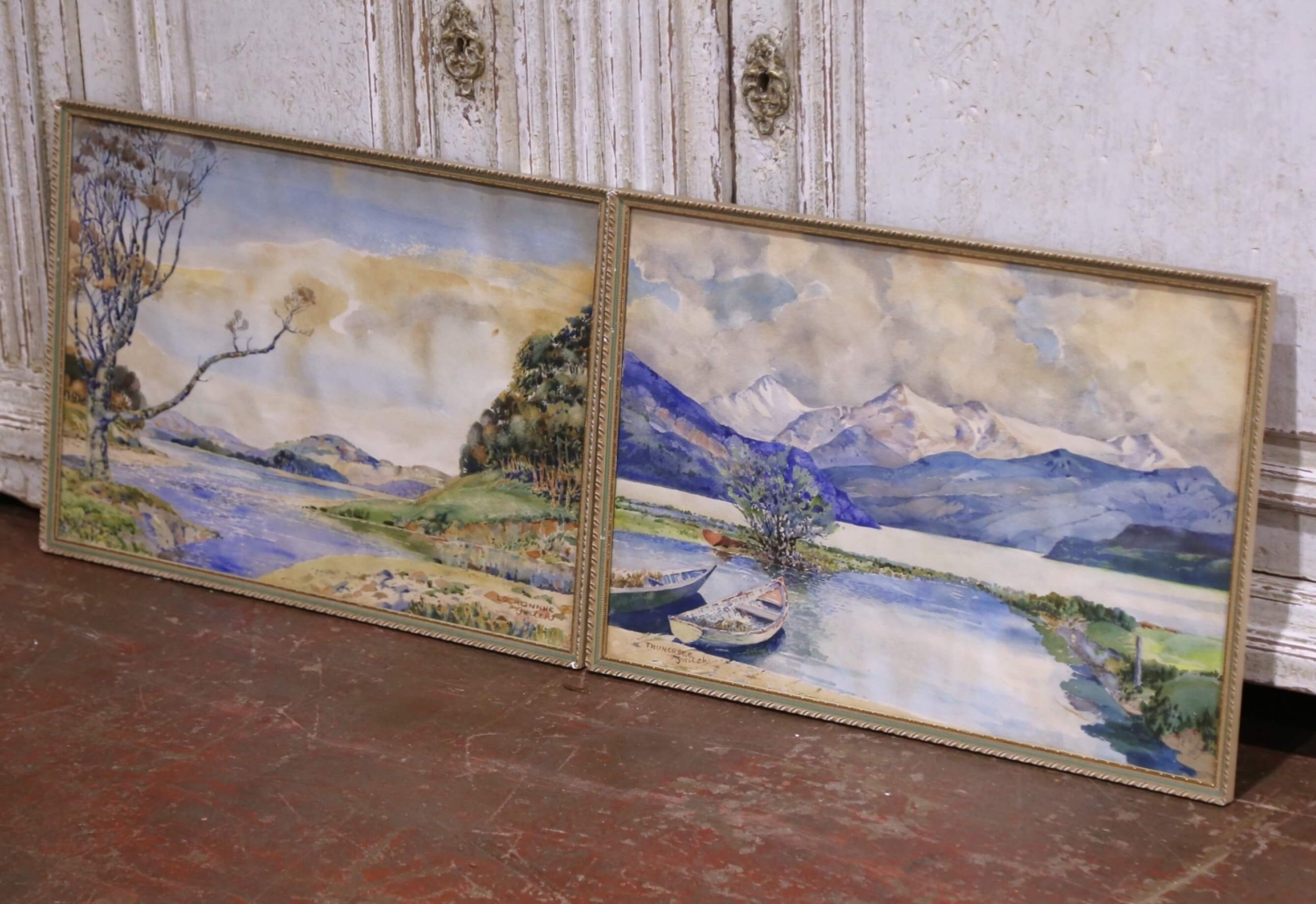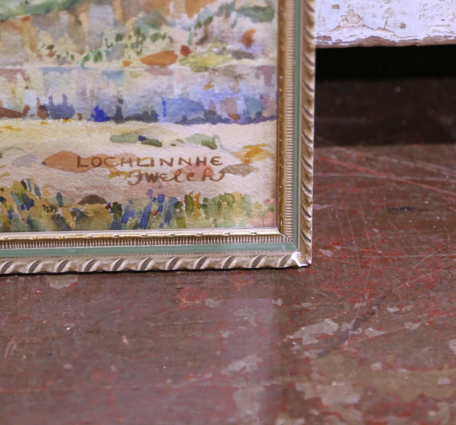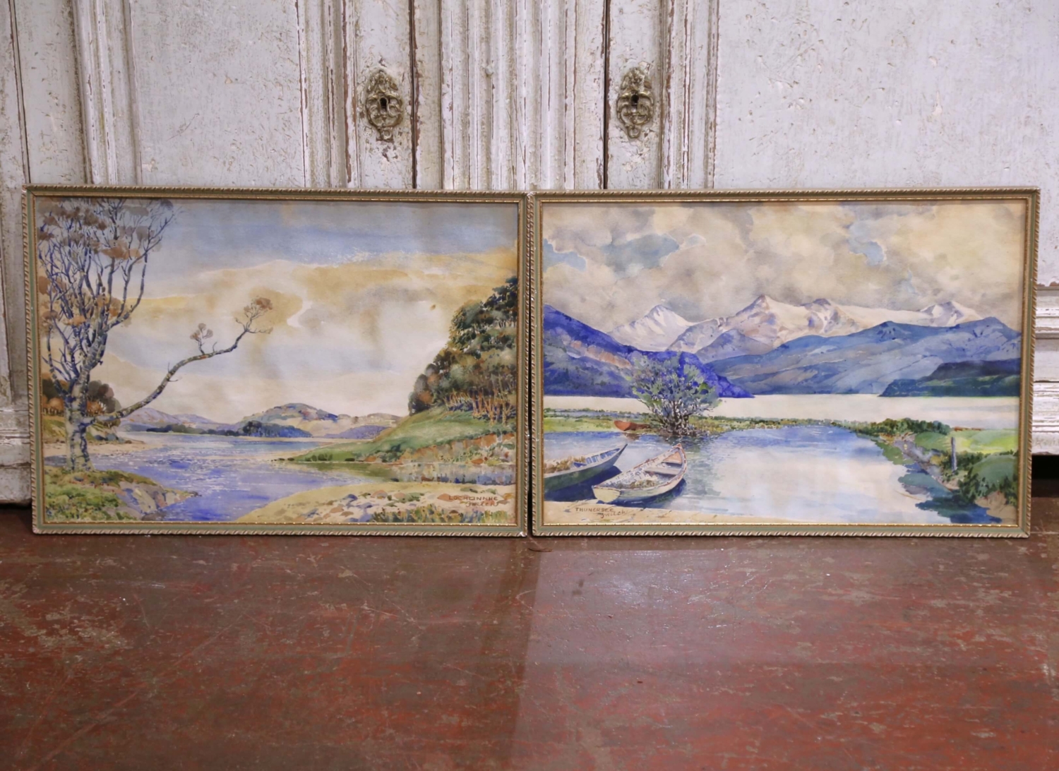 Bring color and tranquility to a living room, hallway, or study with this mid-century pair of European landscape watercolors, each signed Walch and beautifully rendered in luminous washes of blue, green, and earth tones. One watercolor depicts the serene shoreline of Thunersee in the Swiss Alps, complete with scattered boats and snow-topped peaks reflecting in the still water. Its companion painting portrays the softer rolling hills and tree-lined banks of the Scottish Highlands, inscribed Loch Annhe, capturing the warm, hazy light of a late summer afternoon. Executed with confident, impressionistic brushwork and a sensitivity to atmospheric light, the works exemplify the style associated with the mid-century European watercolorists whose paintings were created for galleries and resort towns across Switzerland and Scotland. The signature Walch appears on various Alpine and Highland subjects from the period, suggesting a regional artist active in the 1940s–1960s, known for lyrical landscapes and refined tonal gradations. Both watercolors are presented under glass in period giltwood frames with a twisted rope motif. They remain in very good condition commensurate with age and use. Measures (each): 20.75″ W x 14.75″ H.