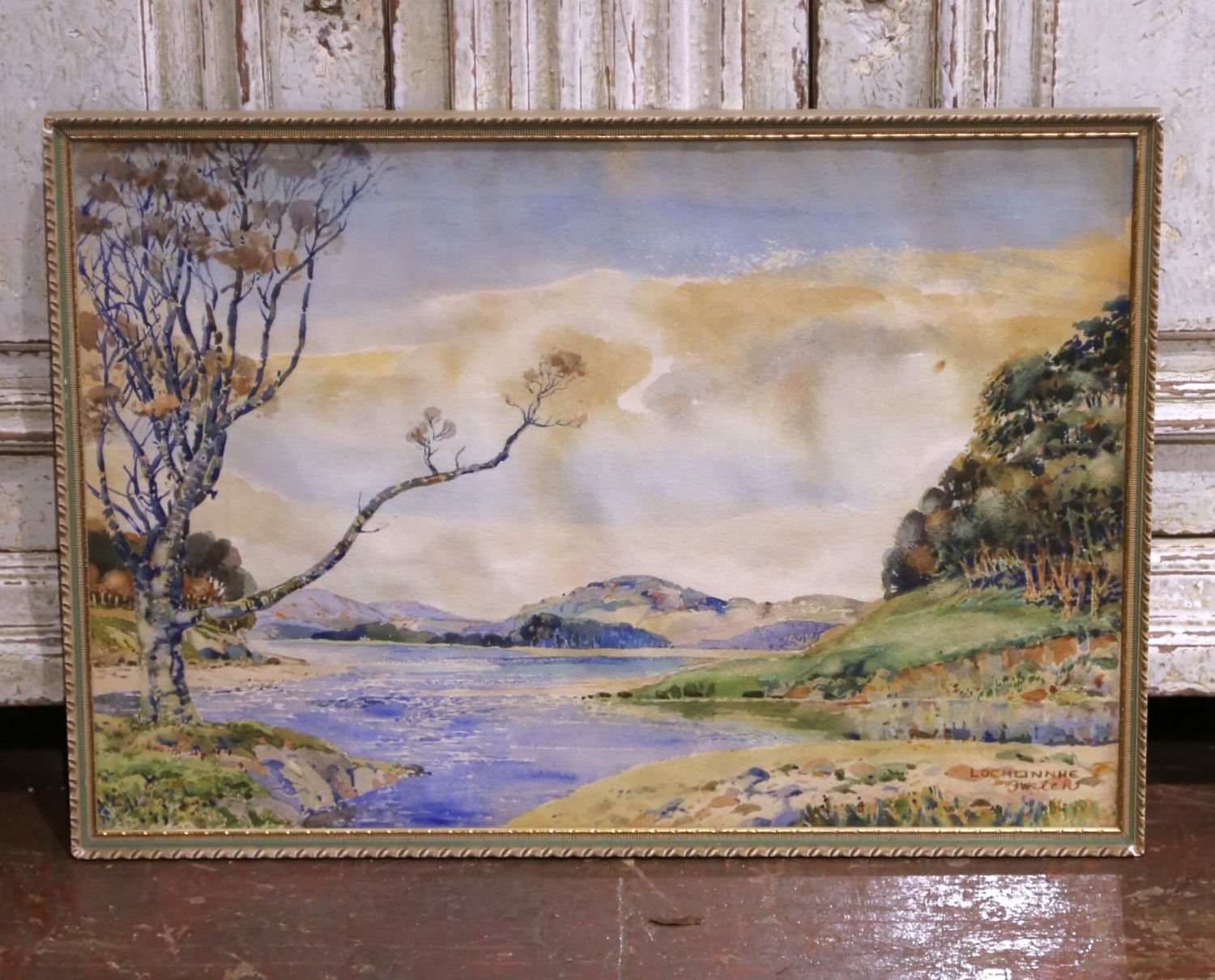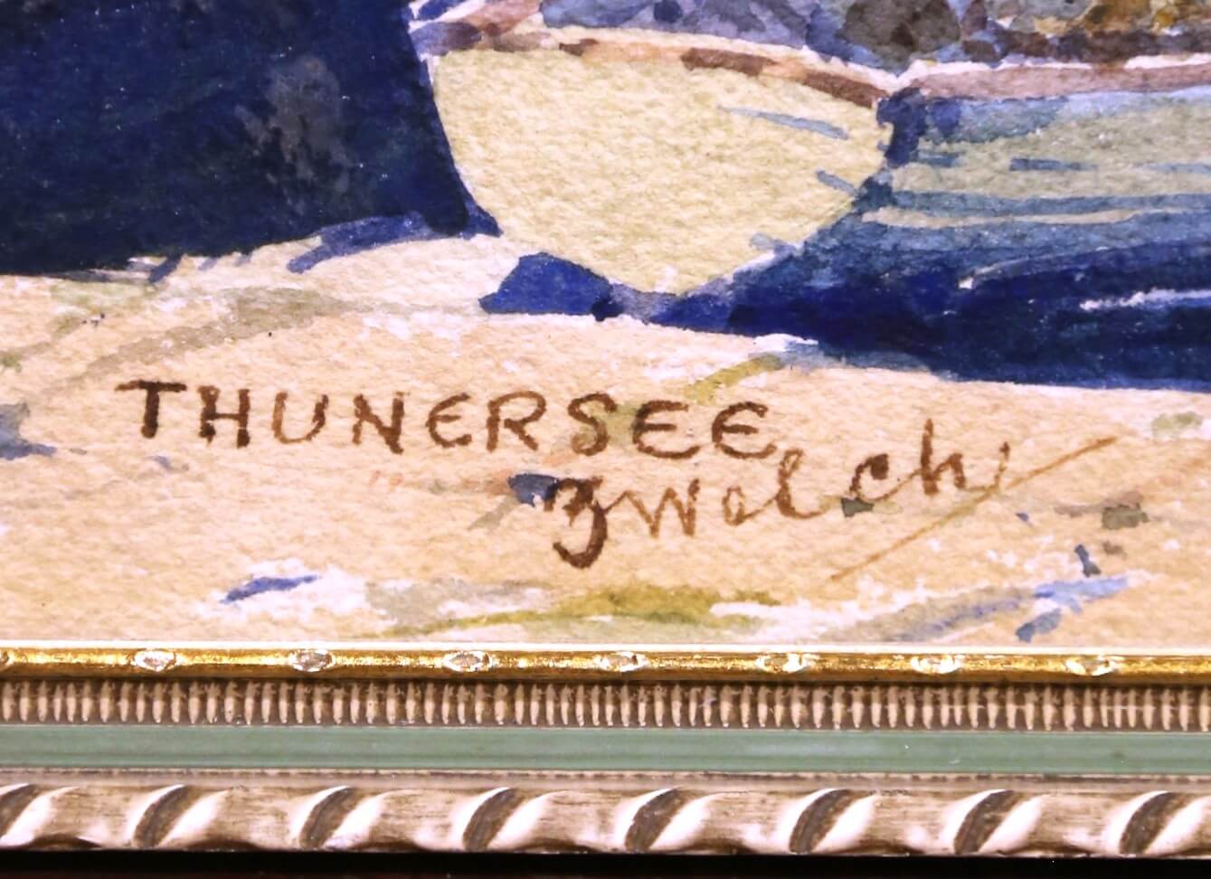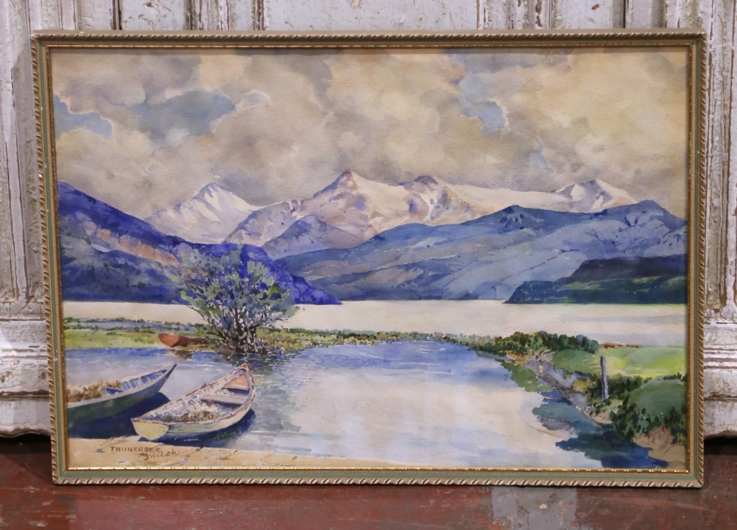 Bring color and tranquility to a living room, hallway, or study with this mid-century pair of European landscape watercolors, each signed Walch and beautifully rendered in luminous washes of blue, green, and earth tones. One watercolor depicts the serene shoreline of Thunersee in the Swiss Alps, complete with scattered boats and snow-topped peaks reflecting in the still water. Its companion painting portrays the softer rolling hills and tree-lined banks of the Scottish Highlands, inscribed Loch Annhe, capturing the warm, hazy light of a late summer afternoon. Executed with confident, impressionistic brushwork and a sensitivity to atmospheric light, the works exemplify the style associated with the mid-century European watercolorists whose paintings were created for galleries and resort towns across Switzerland and Scotland. The signature Walch appears on various Alpine and Highland subjects from the period, suggesting a regional artist active in the 1940s–1960s, known for lyrical landscapes and refined tonal gradations. Both watercolors are presented under glass in period giltwood frames with a twisted rope motif. They remain in very good condition commensurate with age and use. Measures (each): 20.75″ W x 14.75″ H.