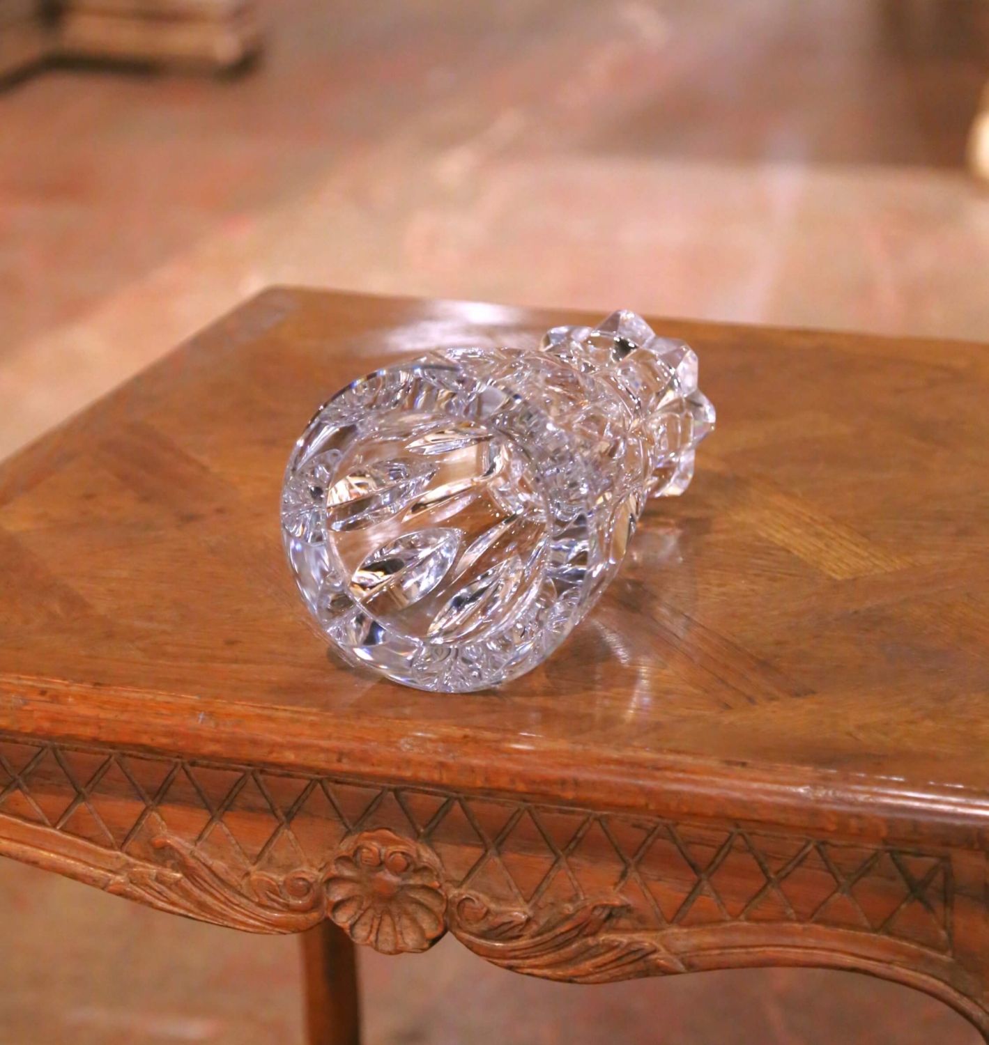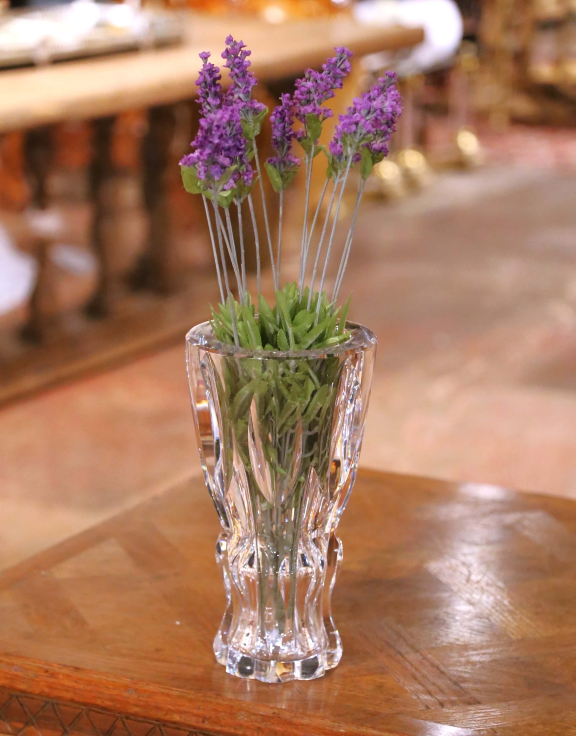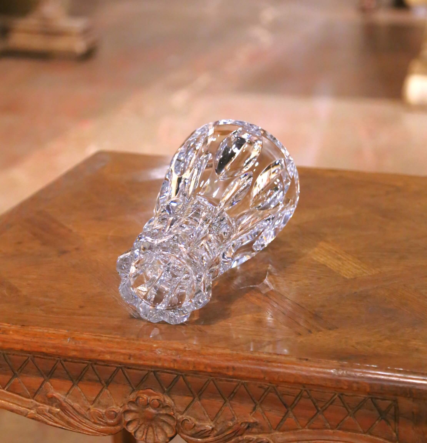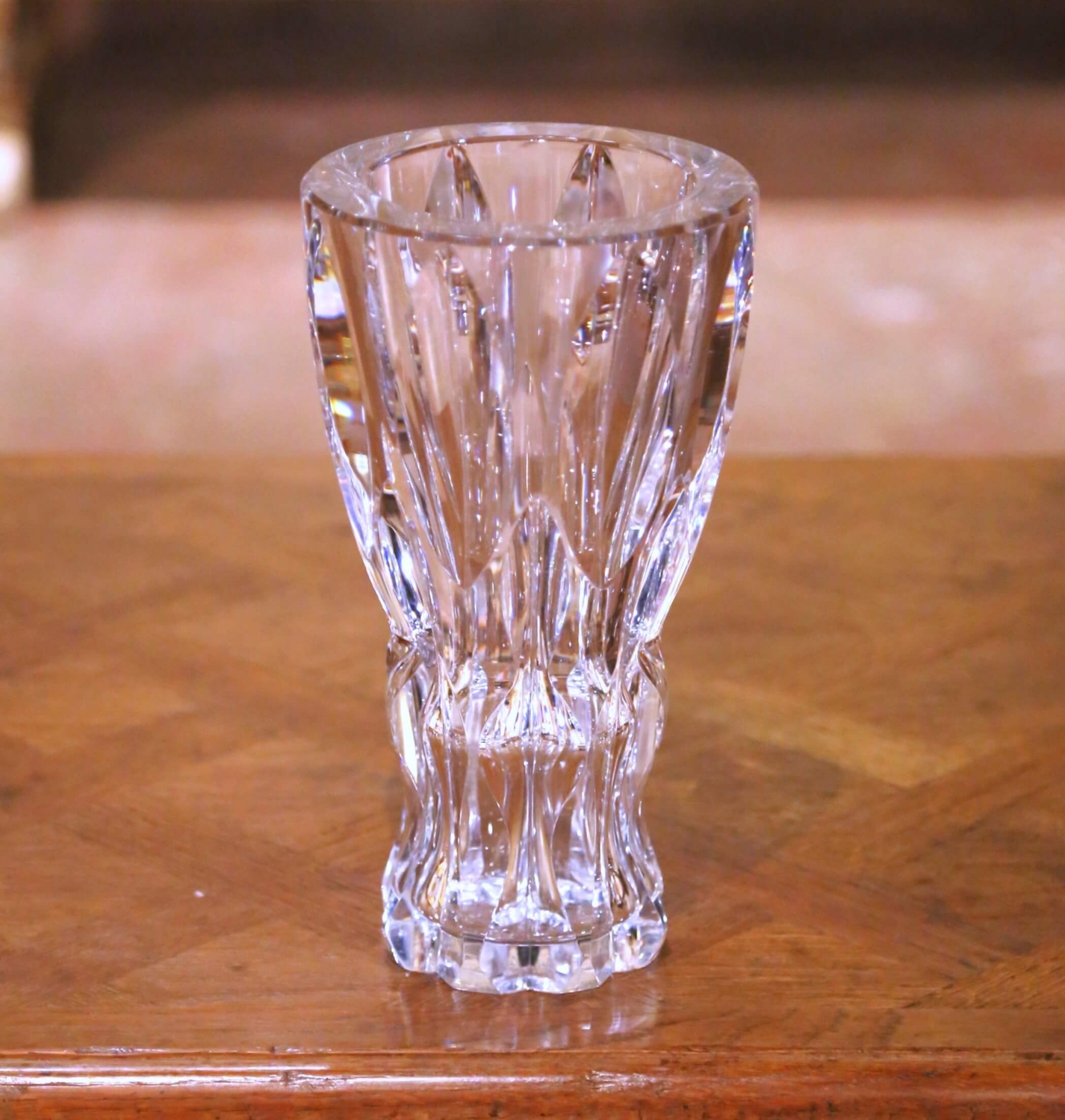 Add a refined accent to a tabletop or vignette with this elegant antique crystal bud vase, crafted in Belgium circa 1960 by the renowned Val Saint Lambert. The piece is expertly cut from clear, high-quality crystal, featuring a flared rim over a deeply faceted body with elongated vertical cuts that beautifully refract light. The sculptural silhouette is enhanced by a gently pinched waist rising from a geometric, weighted base, giving the vase both balance and visual presence.