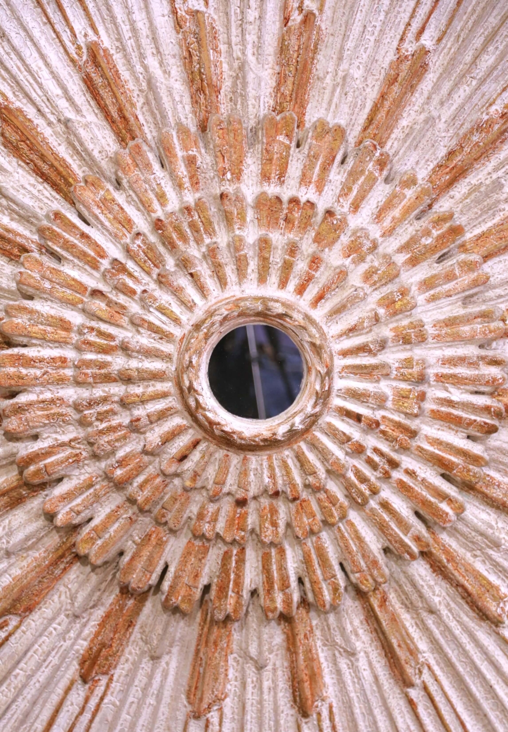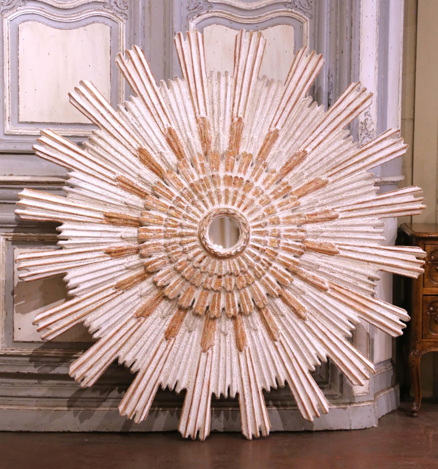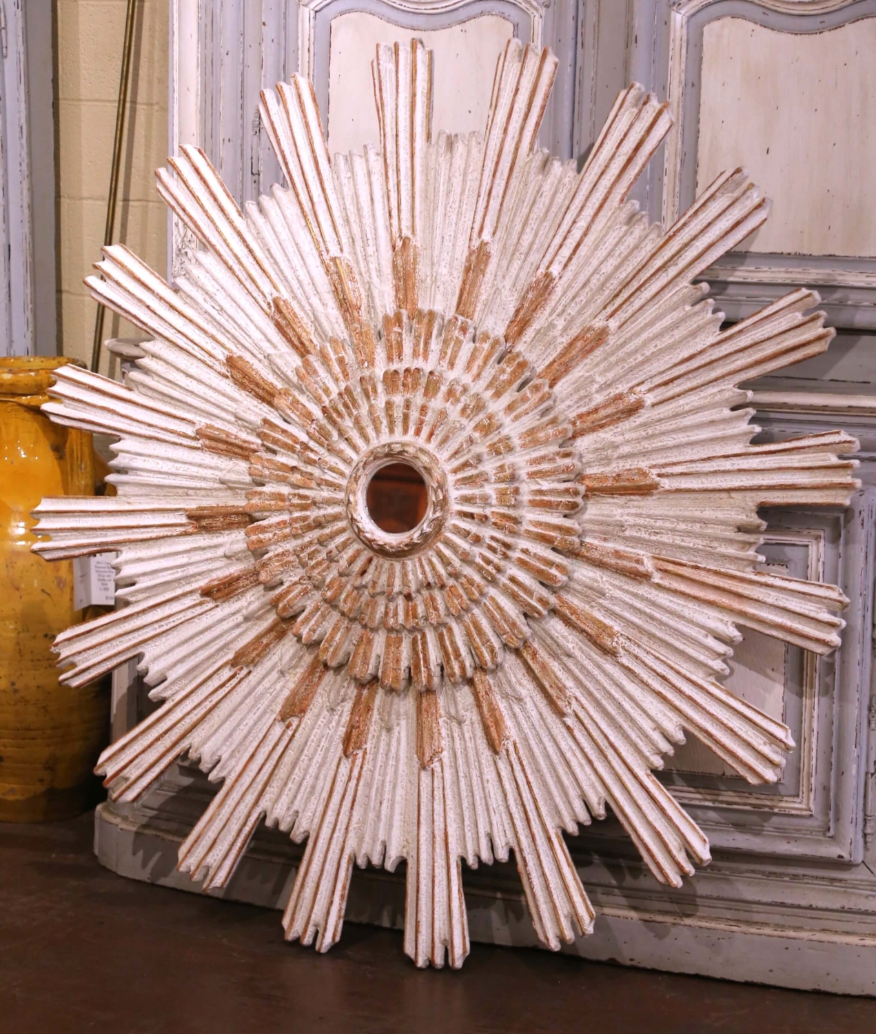 Add a radiant focal point to your interior with this large and eye-catching sun mirror. Crafted in Italy circa 2010 and measuring over five feet in diameter, the impressive vintage mirror features a classic sunbeam form with four-tier radiating rays. At the center, a circular mirror plate is encircled by a carved rope motif, adding subtle texture and refinement. Each outer ray is carved separately and arranged to create a dynamic sunburst effect, giving the piece striking sculptural depth. The decorative sunburst motif traces its origins to the radiant halos depicted in medieval religious art and later became a powerful symbol under Louis XIV, whose association with the sun reinforced its meaning of power and grandeur. This timeless design continues to evoke warmth, light, and elegance in both traditional and contemporary interiors. The mirror is in excellent condition commensurate with age and use, and adorns a rich antique patinated white and red painted finish with gilt accents. Versatile in placement, it would make a bold statement above a mantel, in a grand entryway, or as a centerpiece in a hallway or living space. Measures: 62″ diameter