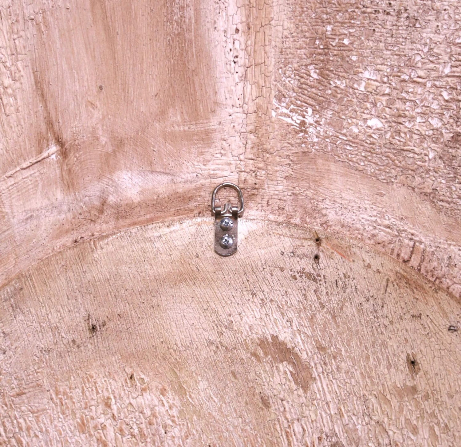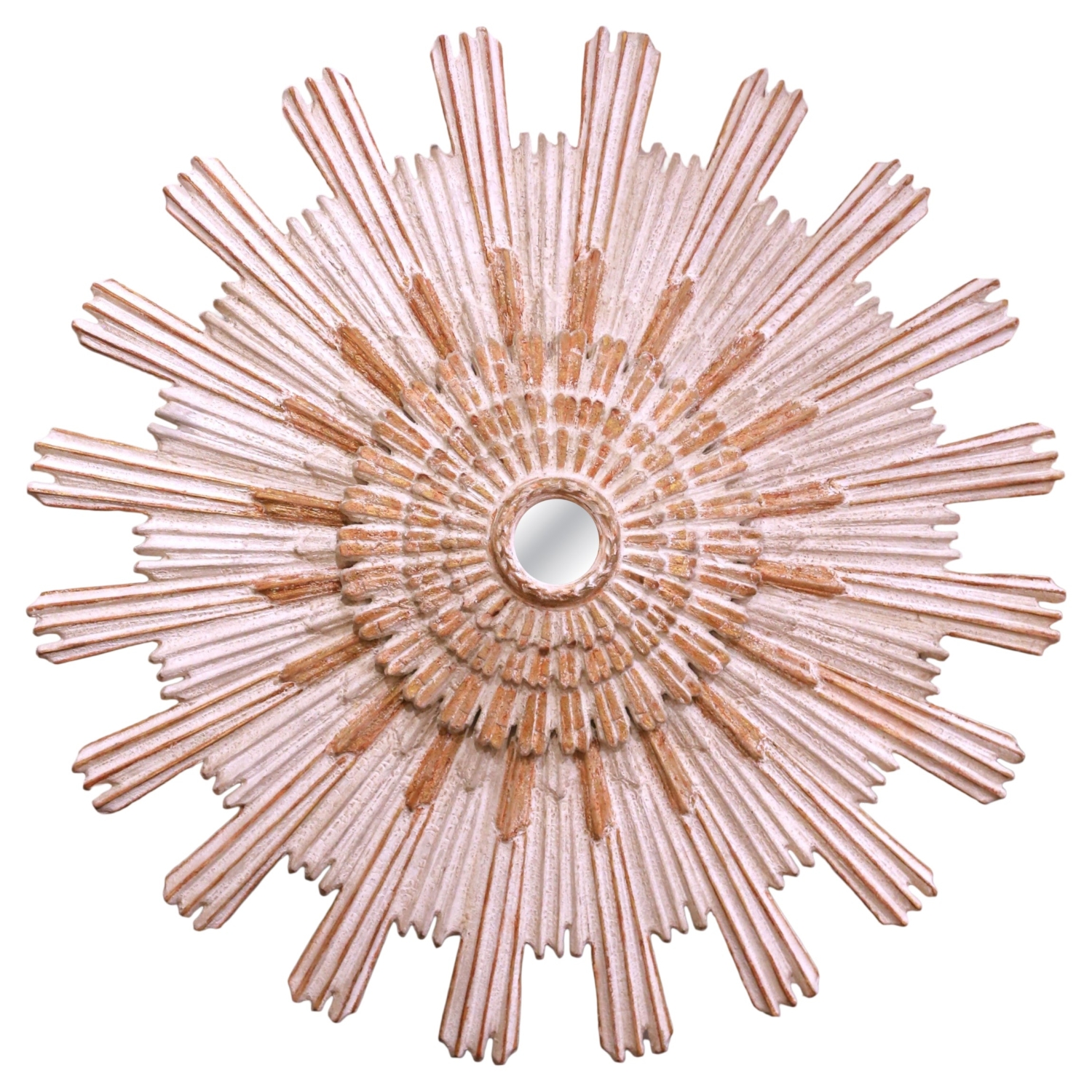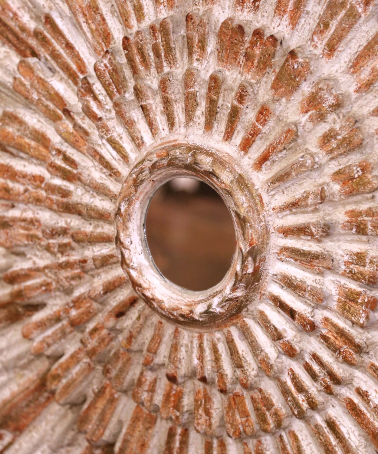 Add a radiant focal point to your interior with this large and eye-catching sun mirror. Crafted in Italy circa 2010 and measuring over five feet in diameter, the impressive vintage mirror features a classic sunbeam form with four-tier radiating rays. At the center, a circular mirror plate is encircled by a carved rope motif, adding subtle texture and refinement. Each outer ray is carved separately and arranged to create a dynamic sunburst effect, giving the piece striking sculptural depth. The decorative sunburst motif traces its origins to the radiant halos depicted in medieval religious art and later became a powerful symbol under Louis XIV, whose association with the sun reinforced its meaning of power and grandeur. This timeless design continues to evoke warmth, light, and elegance in both traditional and contemporary interiors. The mirror is in excellent condition commensurate with age and use, and adorns a rich antique patinated white and red painted finish with gilt accents. Versatile in placement, it would make a bold statement above a mantel, in a grand entryway, or as a centerpiece in a hallway or living space. Measures: 62″ diameter