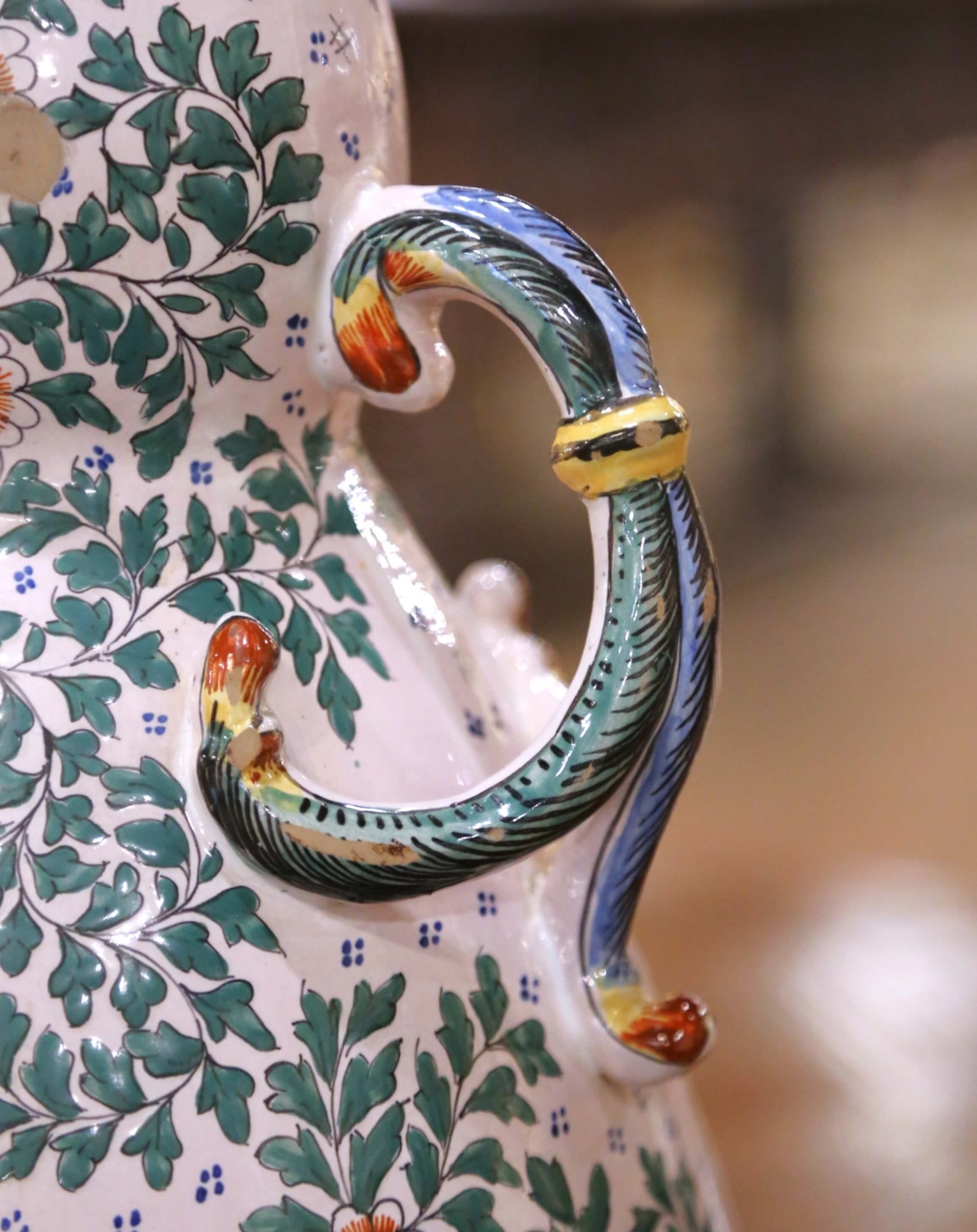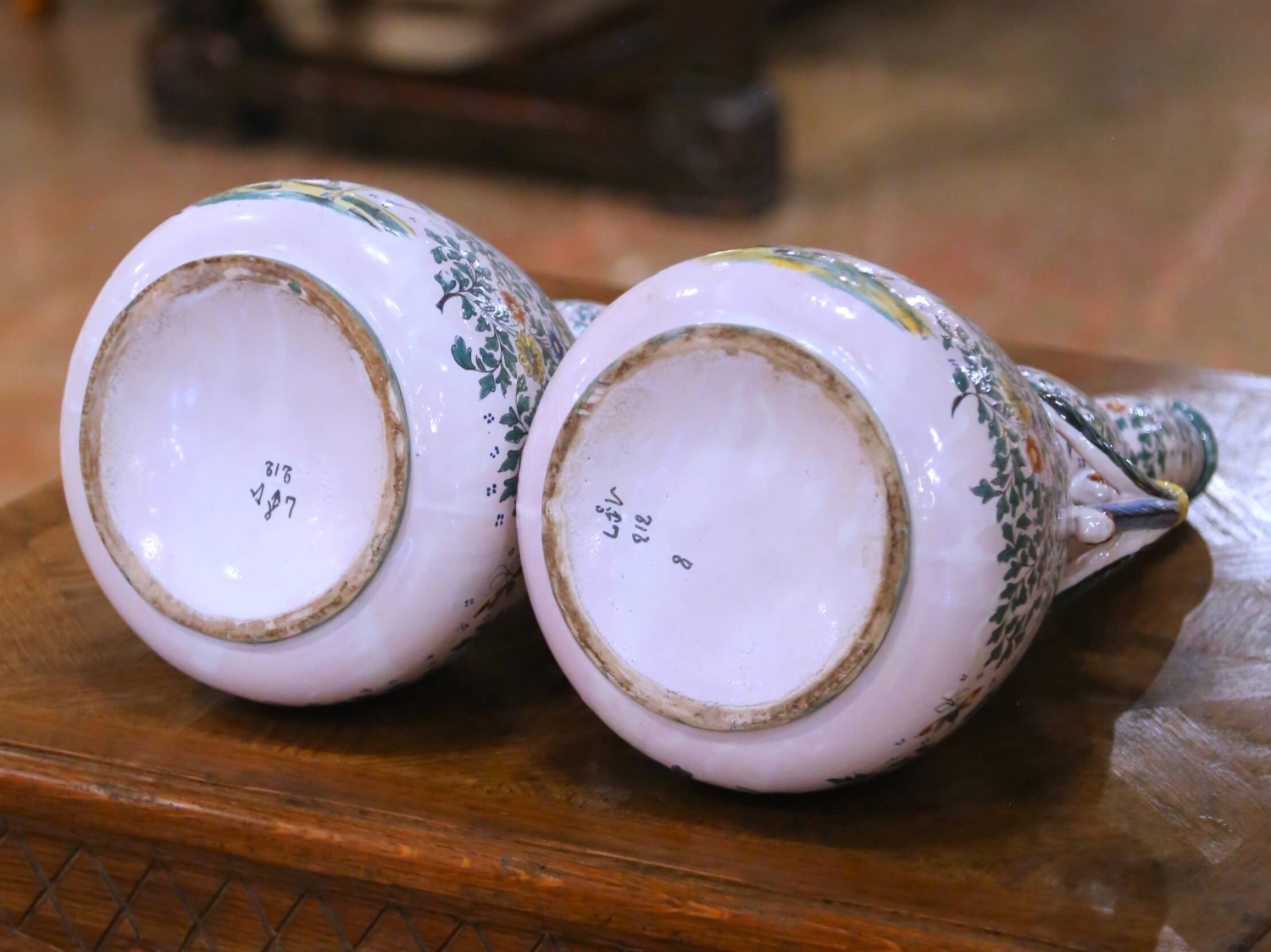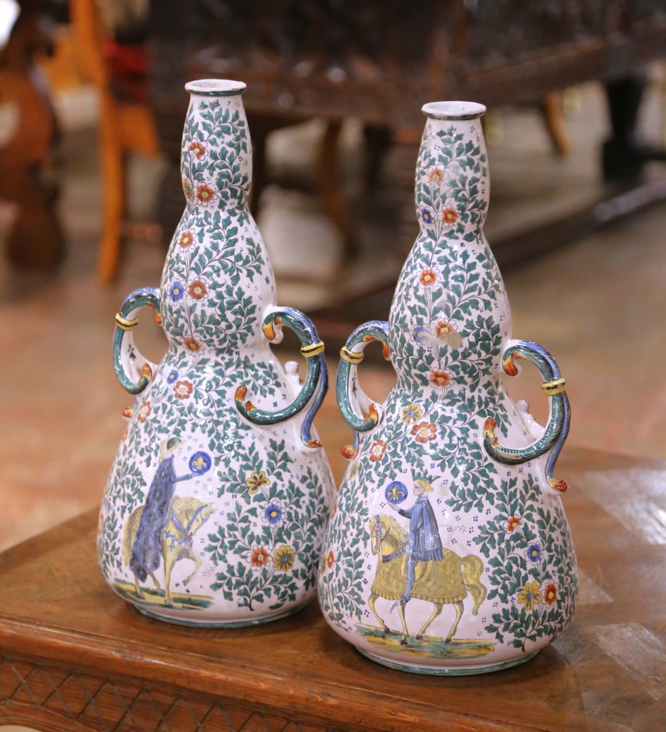This distinguished pair of antique French faience ewers dates to the mid-19th century, circa 1850, and was produced in the tradition of the renowned faience factories of Nevers, one of France’s most important historic centers of tin-glazed earthenware production. Nevers workshops were celebrated from the 17th century onward for their richly painted wares, and during the 19th century experienced a revival that favored historicist themes inspired by royal, courtly, and chivalric imagery. Each ewer is finely hand-painted on a luminous white tin-glazed ground with dense scrolling green foliate rinceaux, accented by polychrome floral motifs in blue, ochre, and iron red, along with delicate insect details characteristic of Nevers revival decoration. The bodies are centered with figural equestrian scenes depicting Henri IV and Marie de’ Medici, rendered as romanticized historical figures in the decorative tradition rather than strict portraiture. Henri IV appears as the mounted cavalier, while Marie de’ Medici is shown as the elegant lady rider, together evoking the royal nostalgia and courtly symbolism favored by Nevers decorators of the period. Each vessel is further enriched with sculptural applied loop handles highlighted in blue and ochre glazes, demonstrating skilled hand-modeling and confident painterly execution. The antique tin-glazed surfaces display light craquelure and gentle wear consistent with age and use. Hand-painted workshop marks and a pattern number appear to the undersides, typical of mid-19th century Nevers faience factory production. The antique tin-glazed surfaces display light craquelure and minor wear, and the pair is in excellent condition commensurate with age and use. Decorative in nature, these impressive Nevers ewers were intended for display and make a commanding statement when presented as a pair on a console, mantel, or in a vitrine. Dimensions: 9″ Dia. x 17.5″H