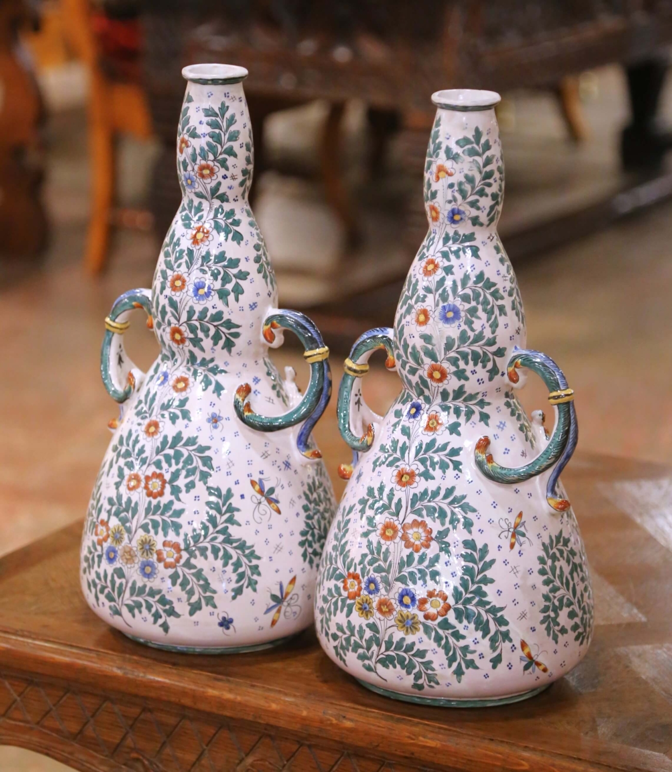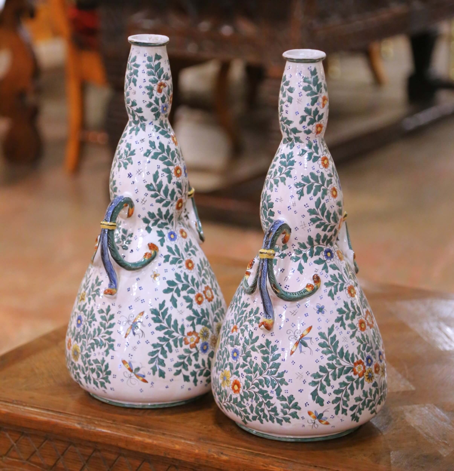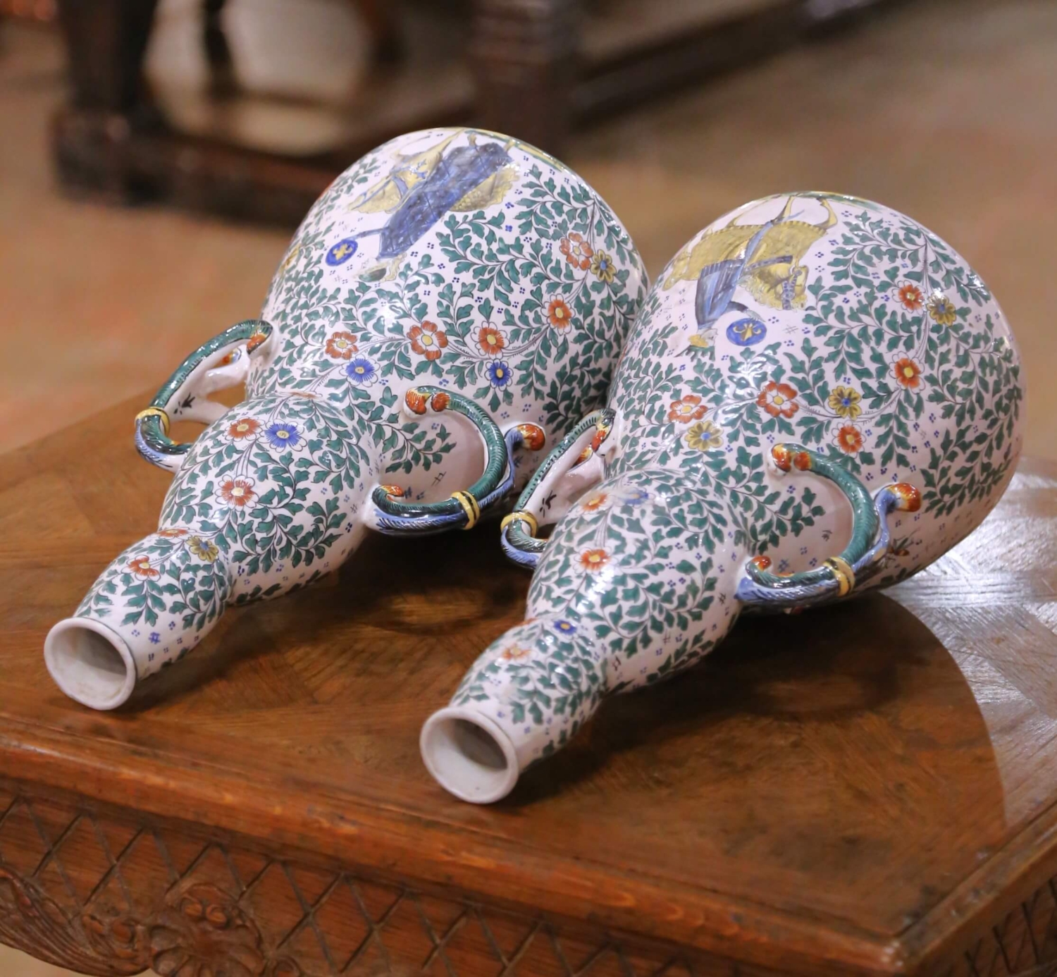 This distinguished pair of antique French faience ewers dates to the mid-19th century, circa 1850, and was produced in the tradition of the renowned faience factories of Nevers, one of France’s most important historic centers of tin-glazed earthenware production. Nevers workshops were celebrated from the 17th century onward for their richly painted wares, and during the 19th century experienced a revival that favored historicist themes inspired by royal, courtly, and chivalric imagery. Each ewer is finely hand-painted on a luminous white tin-glazed ground with dense scrolling green foliate rinceaux, accented by polychrome floral motifs in blue, ochre, and iron red, along with delicate insect details characteristic of Nevers revival decoration. The bodies are centered with figural equestrian scenes depicting Henri IV and Marie de’ Medici, rendered as romanticized historical figures in the decorative tradition rather than strict portraiture. Henri IV appears as the mounted cavalier, while Marie de’ Medici is shown as the elegant lady rider, together evoking the royal nostalgia and courtly symbolism favored by Nevers decorators of the period. Each vessel is further enriched with sculptural applied loop handles highlighted in blue and ochre glazes, demonstrating skilled hand-modeling and confident painterly execution. The antique tin-glazed surfaces display light craquelure and gentle wear consistent with age and use. Hand-painted workshop marks and a pattern number appear to the undersides, typical of mid-19th century Nevers faience factory production. The antique tin-glazed surfaces display light craquelure and minor wear, and the pair is in excellent condition commensurate with age and use. Decorative in nature, these impressive Nevers ewers were intended for display and make a commanding statement when presented as a pair on a console, mantel, or in a vitrine. Dimensions: 9″ Dia. x 17.5″H