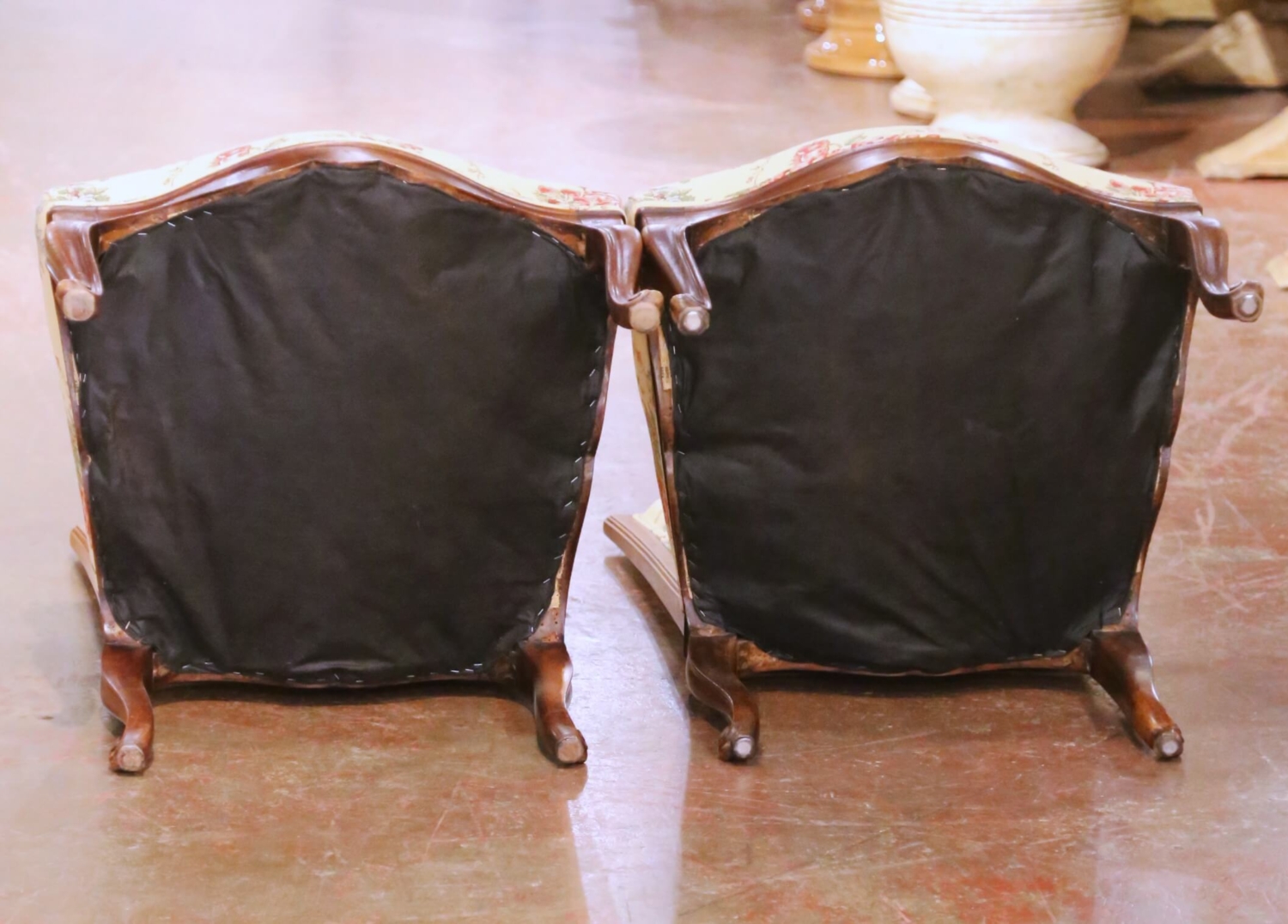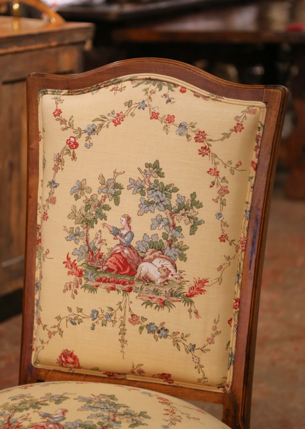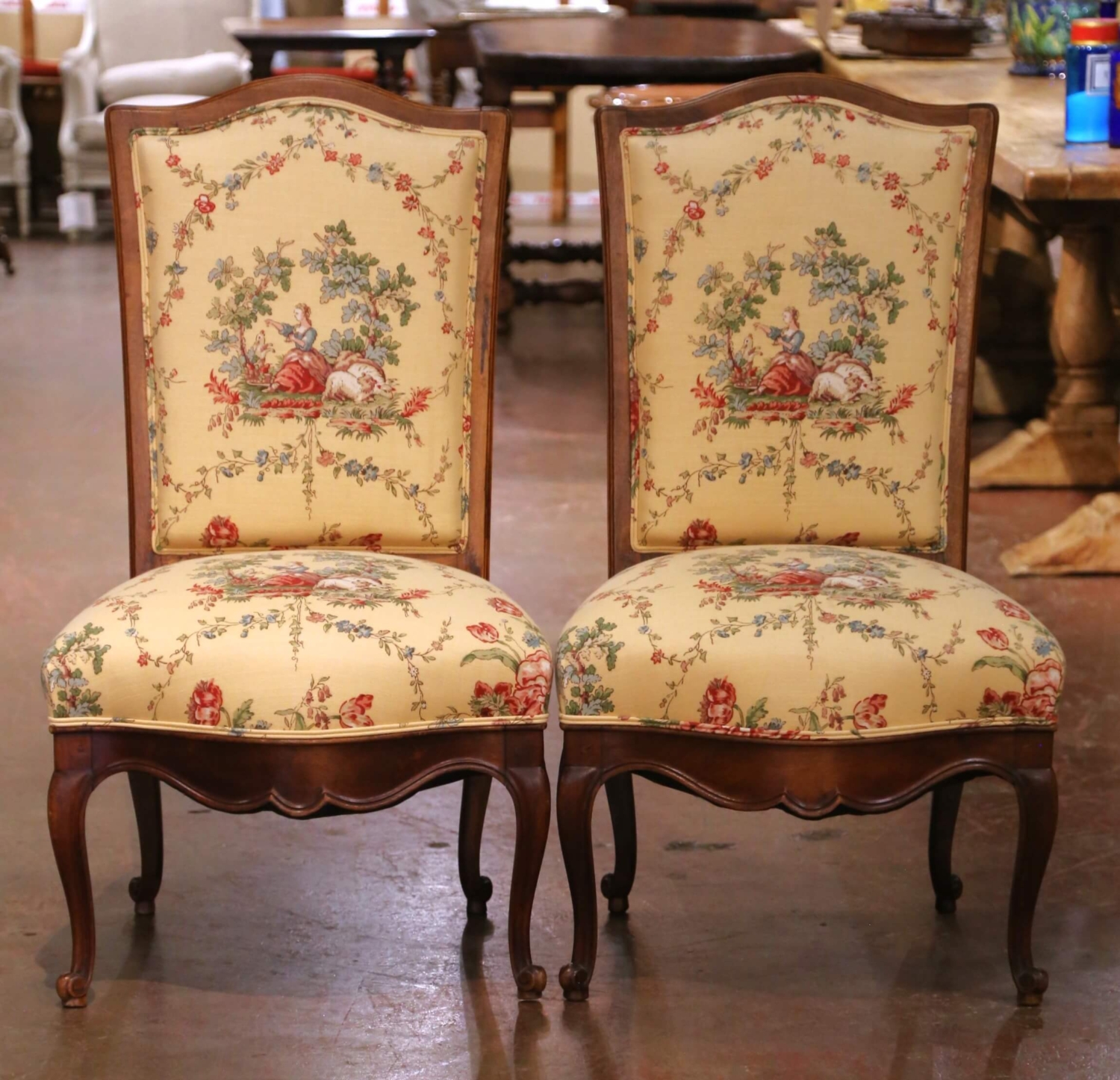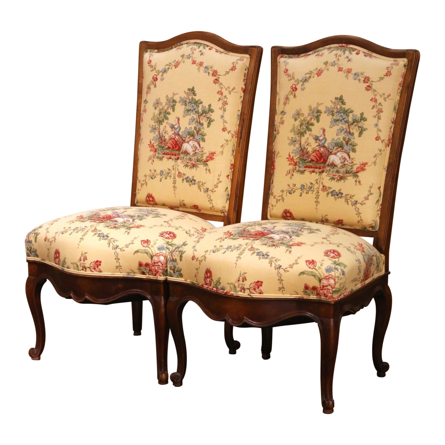 This elegant pair of antique French side chairs was crafted in walnut circa 1870 and reflects the refined curves and lightness associated with the Louis XV style. The frames feature softly contoured backs, serpentine aprons, and gracefully cabriole legs terminating in delicate scrolled feet, all showcasing a warm, rich walnut patina developed over time. The chairs retain their upholstered backs and seats, newly covered in a Provençal-inspired textile decorated with pastoral scenes, flowering garlands, and floral sprays in soft tones of rose, blue, and green against a light ground. The fabric evokes classic French country aesthetics while complementing the movement and proportions of the carved walnut frames. Generously shaped seats and supportive backs provide both visual charm and comfortable seating, making the pair suitable for use as side chairs, accent chairs, or occasional seating in a bedroom, living room, or refined country interior. Both chairs are in excellent condition commensurate with age and use, with sturdy construction, sound joinery, and upholstery presenting beautifully. This antique pair offers a harmonious blend of elegance, comfort, and decorative appeal, ideal for interiors inspired by French country, Louis XV, or Provençal style. Dimensions: 23”W x 20”D x 40.5”H Seat Height: 17.5”H