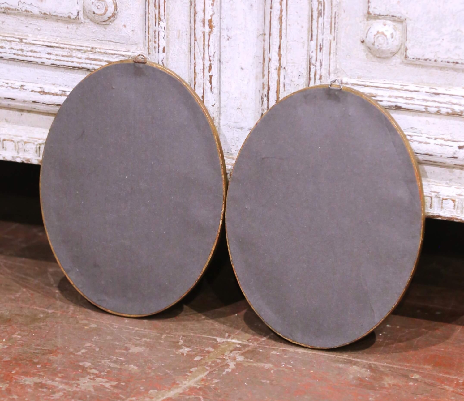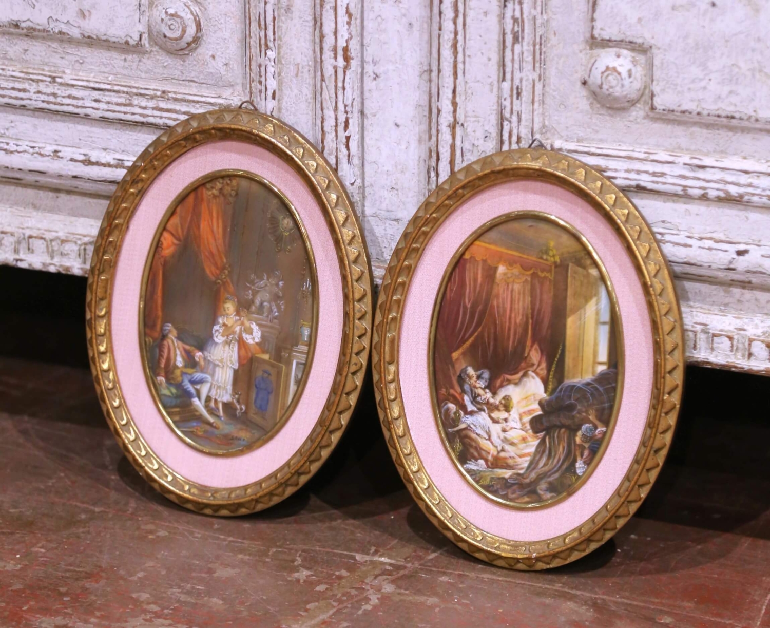 Pair Mid-Century French Painted Genre Scene Oval Glass Pendants in Gilt Frames