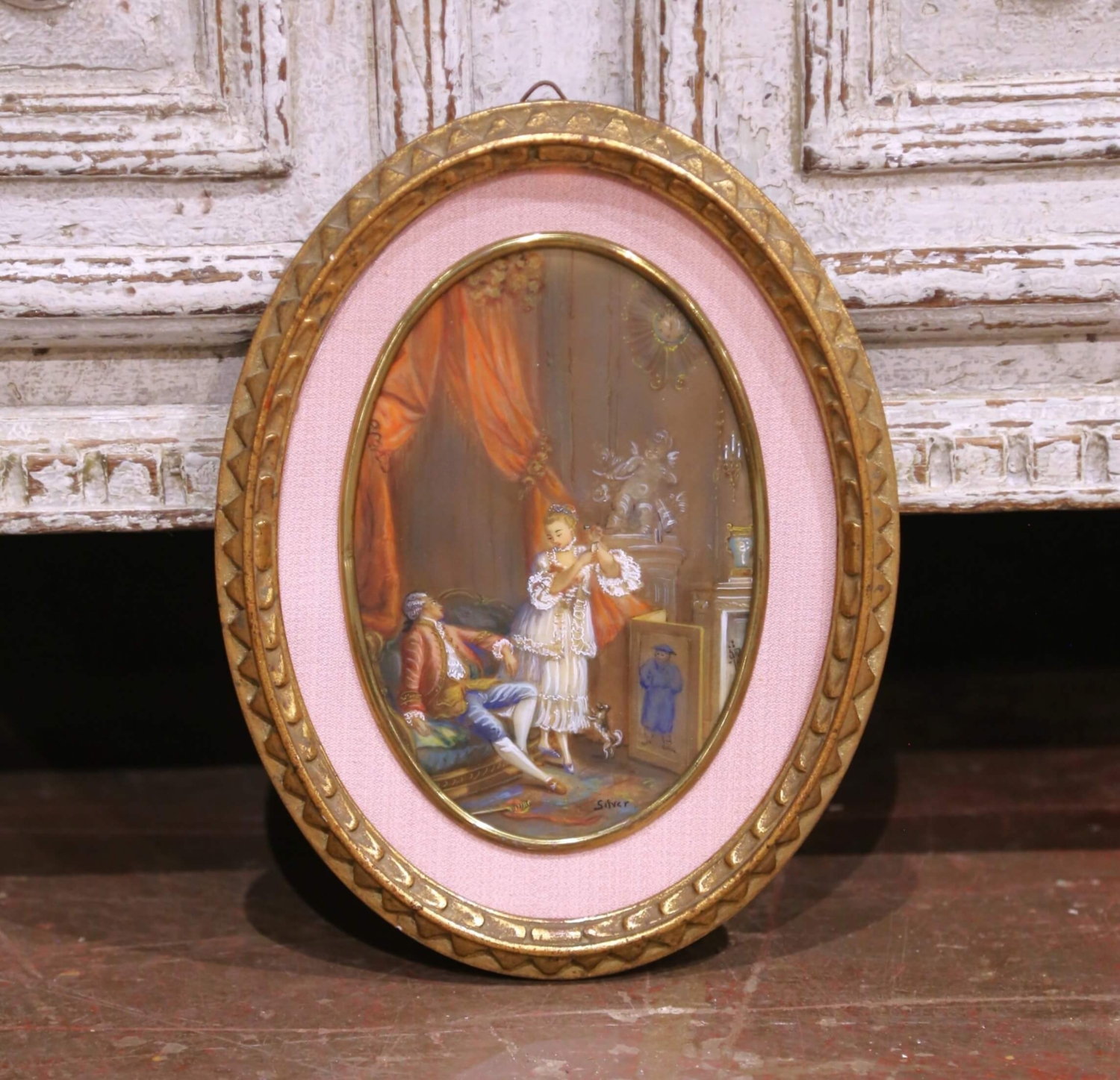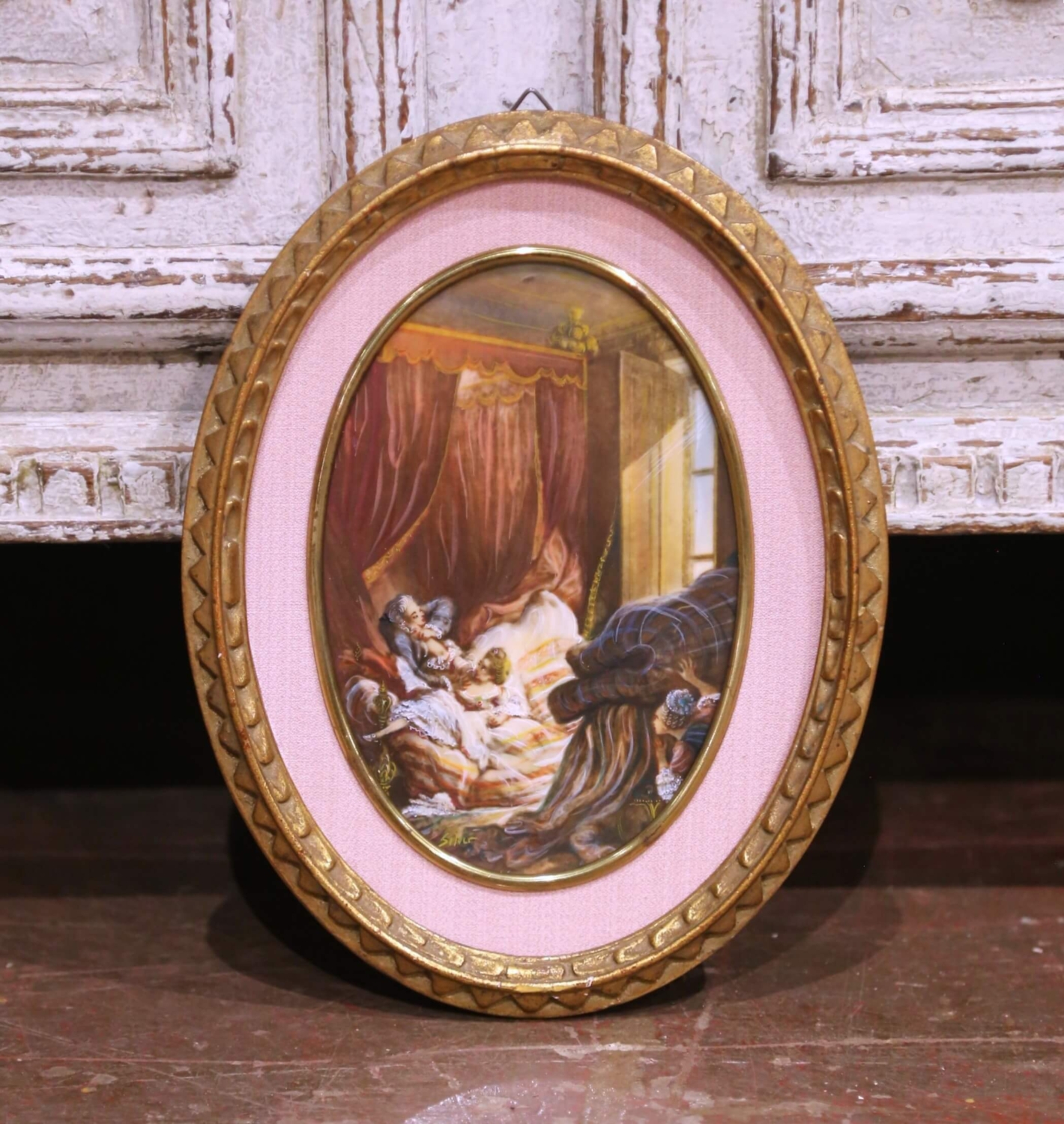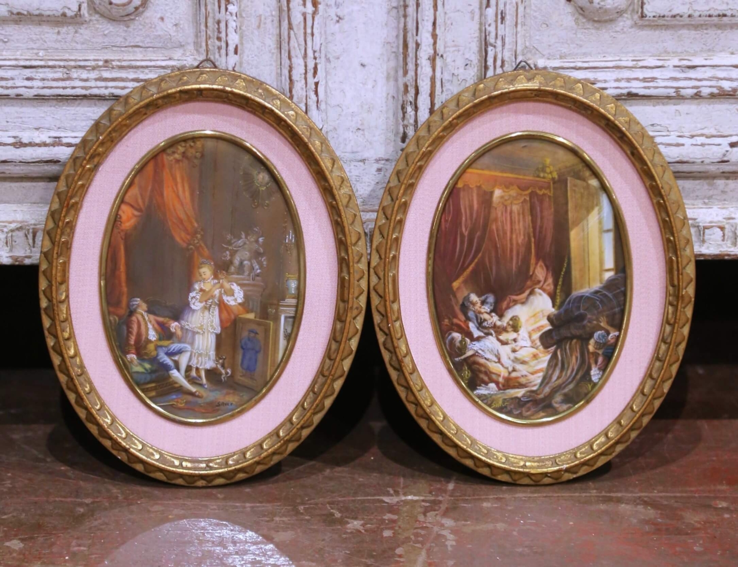 This elegant pair of antique wall pendants was crafted in France circa 1960 and features hand-painted genre scenes rendered under convex glass in the Rococo revival, Louis XV style. Each oval composition depicts an intimate interior scene inspired by 18th century French life, with finely dressed figures, draped textiles, and playful narrative details executed in a delicate and softly nuanced palette. The paintings are executed in a refined hand-painted technique on the reverse of the glass, creating a luminous surface quality reminiscent of verre églomisé decoration. One scene portrays a standing female figure attending to a reclining gentleman in a richly appointed salon, while the companion piece depicts a resting figure within a curtained bedroom interior, both compositions filled with movement, texture, and period charm. Each work is signed in the lower register, the signature appearing indistinct but consistent with decorative studio production of the period. The pendants are presented in their original oval gilt frames, accented with textured fabric matting and molded borders that enhance their classical presentation and warm aged patina. These antique pendants remain under glass and are in excellent condition commensurate with age and use, with light surface wear consistent with age. A refined and highly decorative pair, ideal for flanking a mirror, doorway, or mantel in a traditional interior. Dimensions: 8″W x 1″D x 10.5″H each