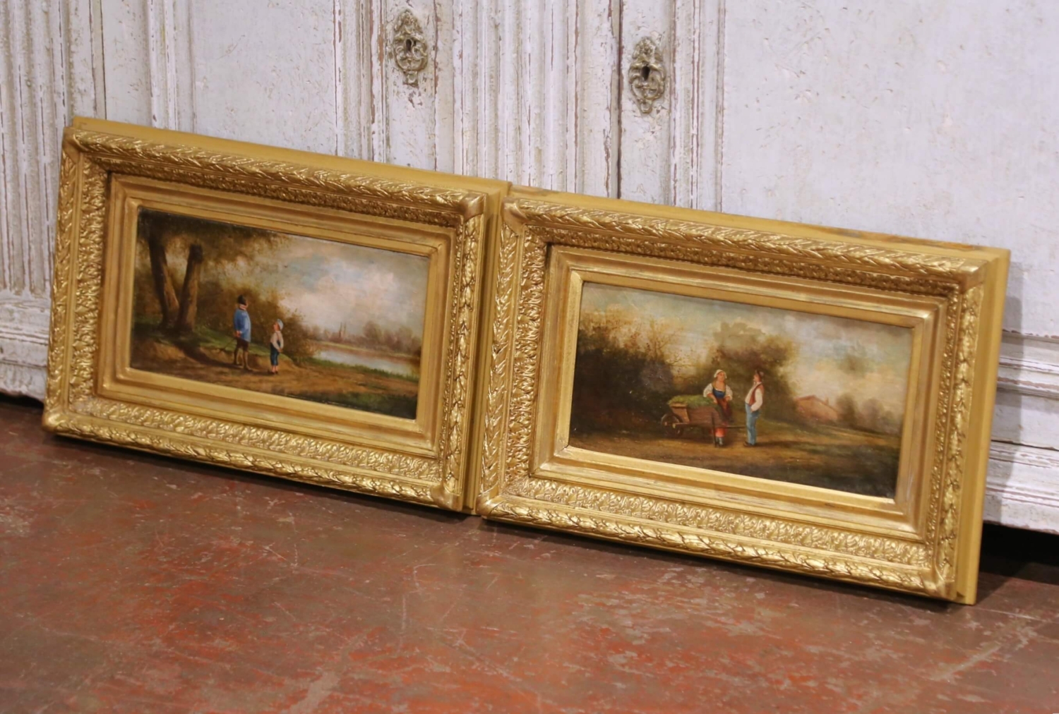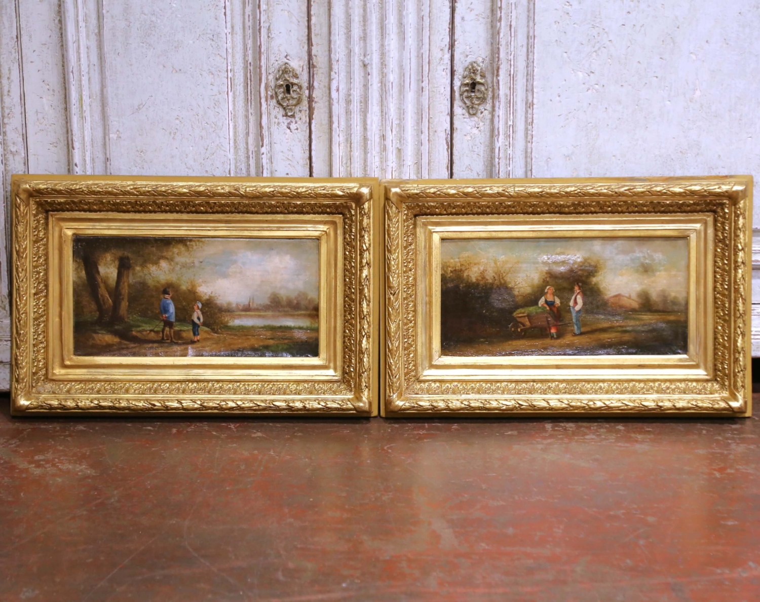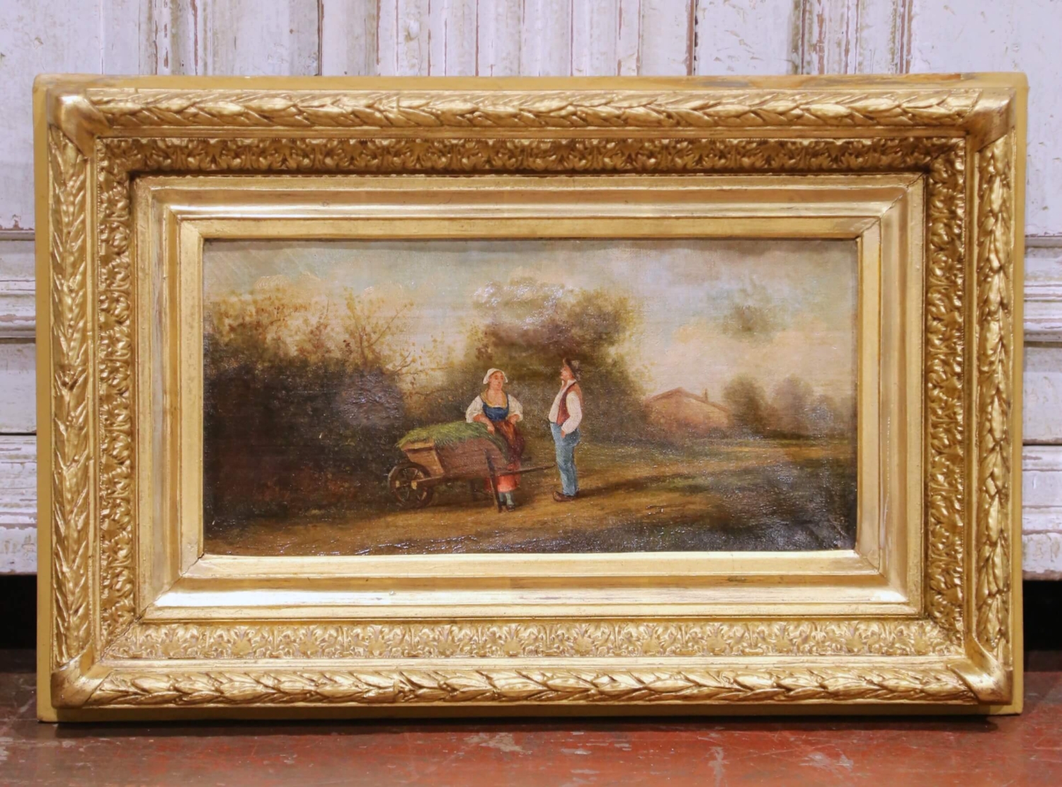 This refined pair of 18th-century French pastoral pendant paintings depicts idyllic rural scenes populated by figures engaged in quiet moments of daily life. Painted in oil on canvas and dating to circa 1780, each composition reflects the pastoral ideal favored during the late Louis XVI period, combining narrative charm with a soft, atmospheric handling of landscape. One scene portrays two children pausing along a country path, while the companion painting shows a man and woman conversing beside a wheelbarrow, their gestures and stances subtly echoing one another to create a harmonious visual dialogue between the works. Executed with fine, controlled brushwork in the figures and looser, more impressionistic treatment in the surrounding foliage and skies, the paintings feature a warm, earthy palette softened by silvery, diffused light. The figures are dressed in traditional rural attire, reinforcing their genre subject and period authenticity. The two works are conceived as true pendants, balanced in scale, tone, and composition, and were likely intended for architectural placement as overdoor or panel paintings. Both canvases remain housed in their original carved and gilt wood frames, richly ornamented with classical moldings and floral detailing. The frames retain a warm, aged gilded patina consistent with their age. The paintings are in good antique condition, with light surface wear and gentle craquelure commensurate with age and use, and no apparent later overpainting visible. Decorative, evocative, and richly atmospheric, this elegant pair would be well suited for installation above doors, flanking a window, or displayed together in a salon, library, or refined country interior. 20.5″W x 13.5″H