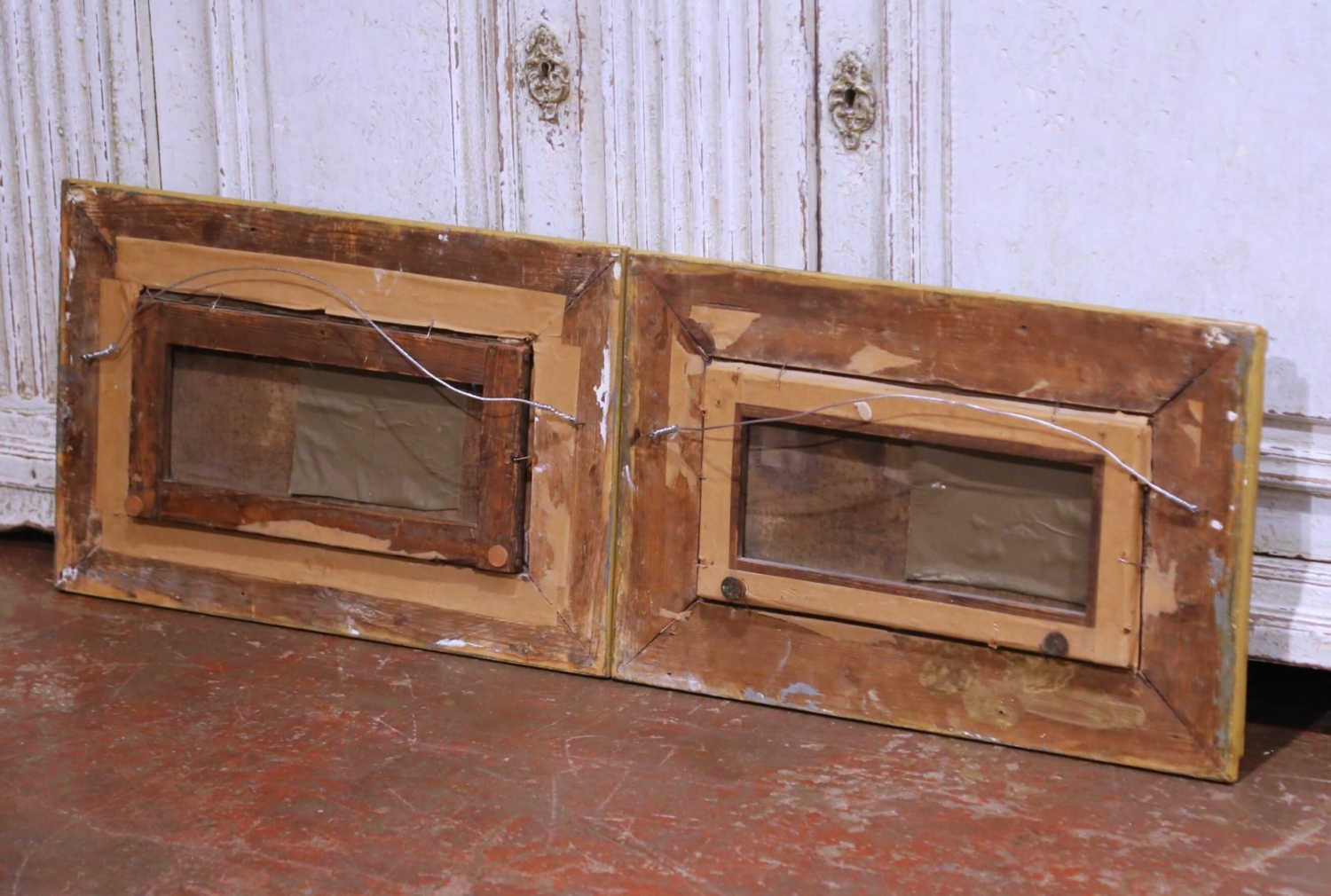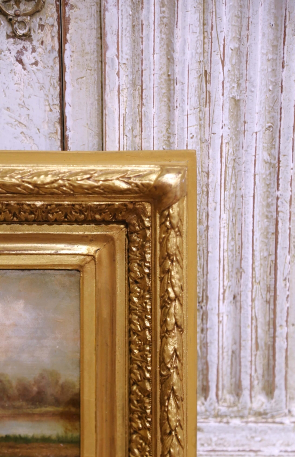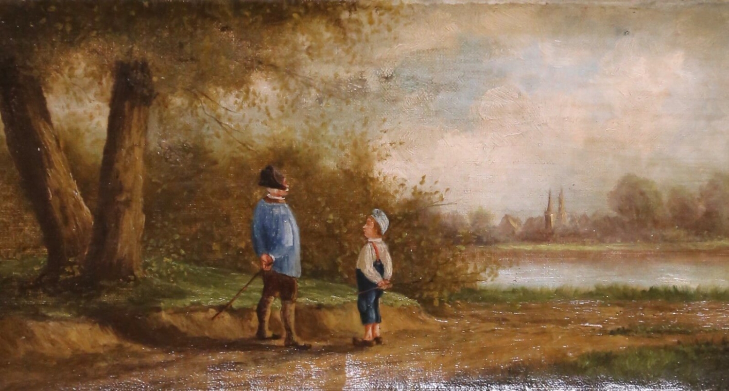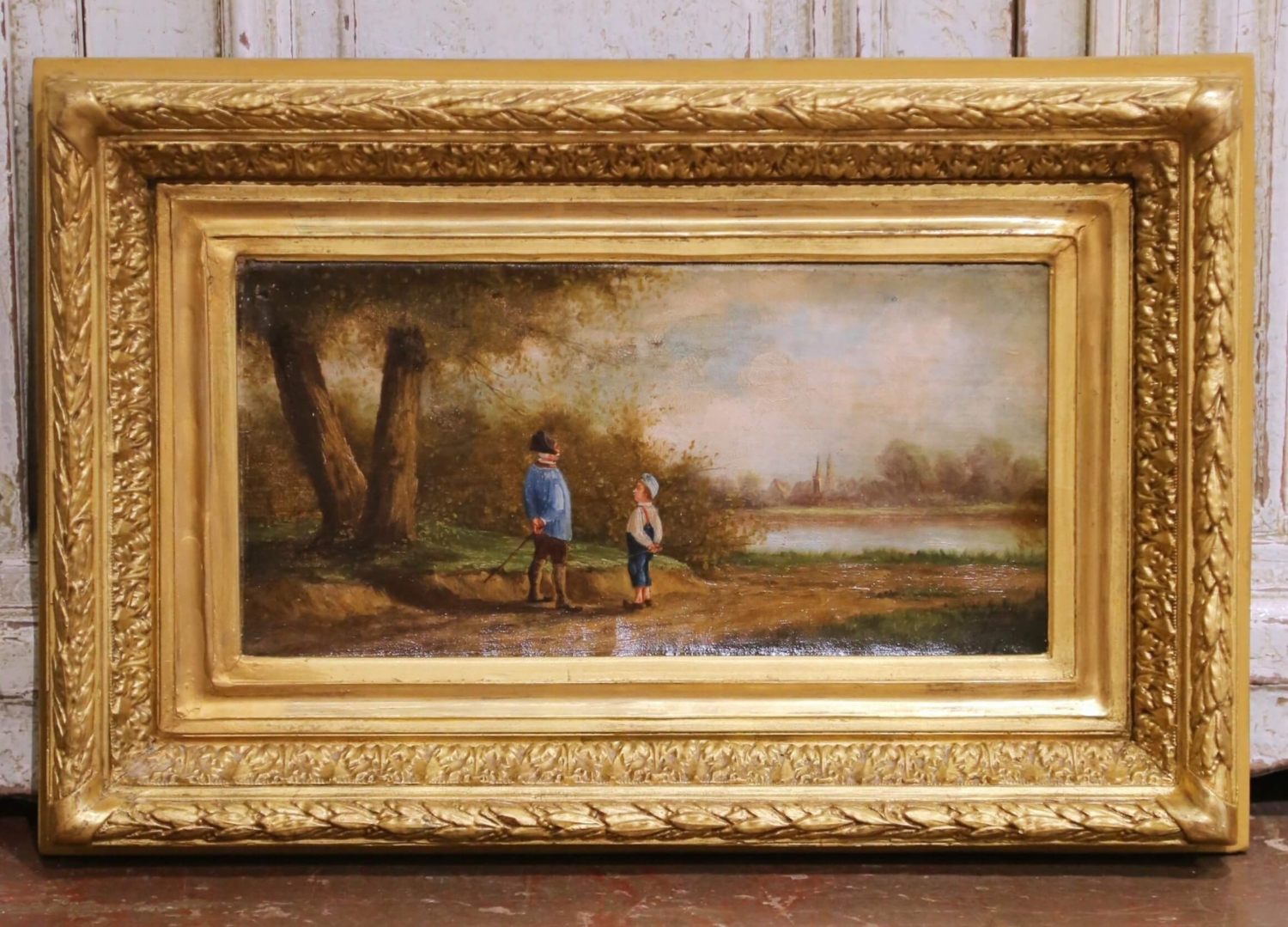 This refined pair of 18th-century French pastoral pendant paintings depicts idyllic rural scenes populated by figures engaged in quiet moments of daily life. Painted in oil on canvas and dating to circa 1780, each composition reflects the pastoral ideal favored during the late Louis XVI period, combining narrative charm with a soft, atmospheric handling of landscape. One scene portrays two children pausing along a country path, while the companion painting shows a man and woman conversing beside a wheelbarrow, their gestures and stances subtly echoing one another to create a harmonious visual dialogue between the works. Executed with fine, controlled brushwork in the figures and looser, more impressionistic treatment in the surrounding foliage and skies, the paintings feature a warm, earthy palette softened by silvery, diffused light. The figures are dressed in traditional rural attire, reinforcing their genre subject and period authenticity. The two works are conceived as true pendants, balanced in scale, tone, and composition, and were likely intended for architectural placement as overdoor or panel paintings. Both canvases remain housed in their original carved and gilt wood frames, richly ornamented with classical moldings and floral detailing. The frames retain a warm, aged gilded patina consistent with their age. The paintings are in good antique condition, with light surface wear and gentle craquelure commensurate with age and use, and no apparent later overpainting visible. Decorative, evocative, and richly atmospheric, this elegant pair would be well suited for installation above doors, flanking a window, or displayed together in a salon, library, or refined country interior. 20.5″W x 13.5″H