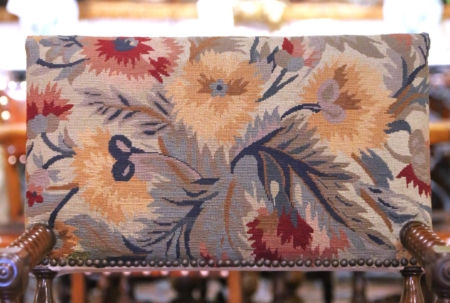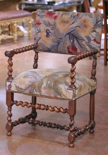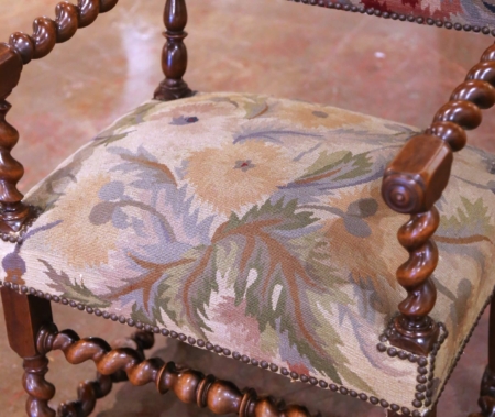 Pair of 19th C. French Louis XIII Walnut Armchairs with Aubusson Upholstery