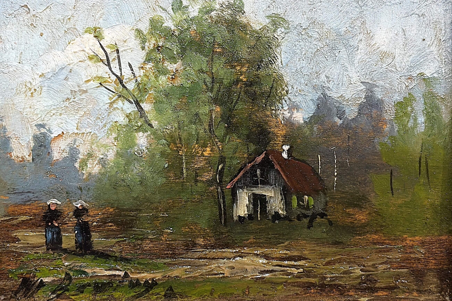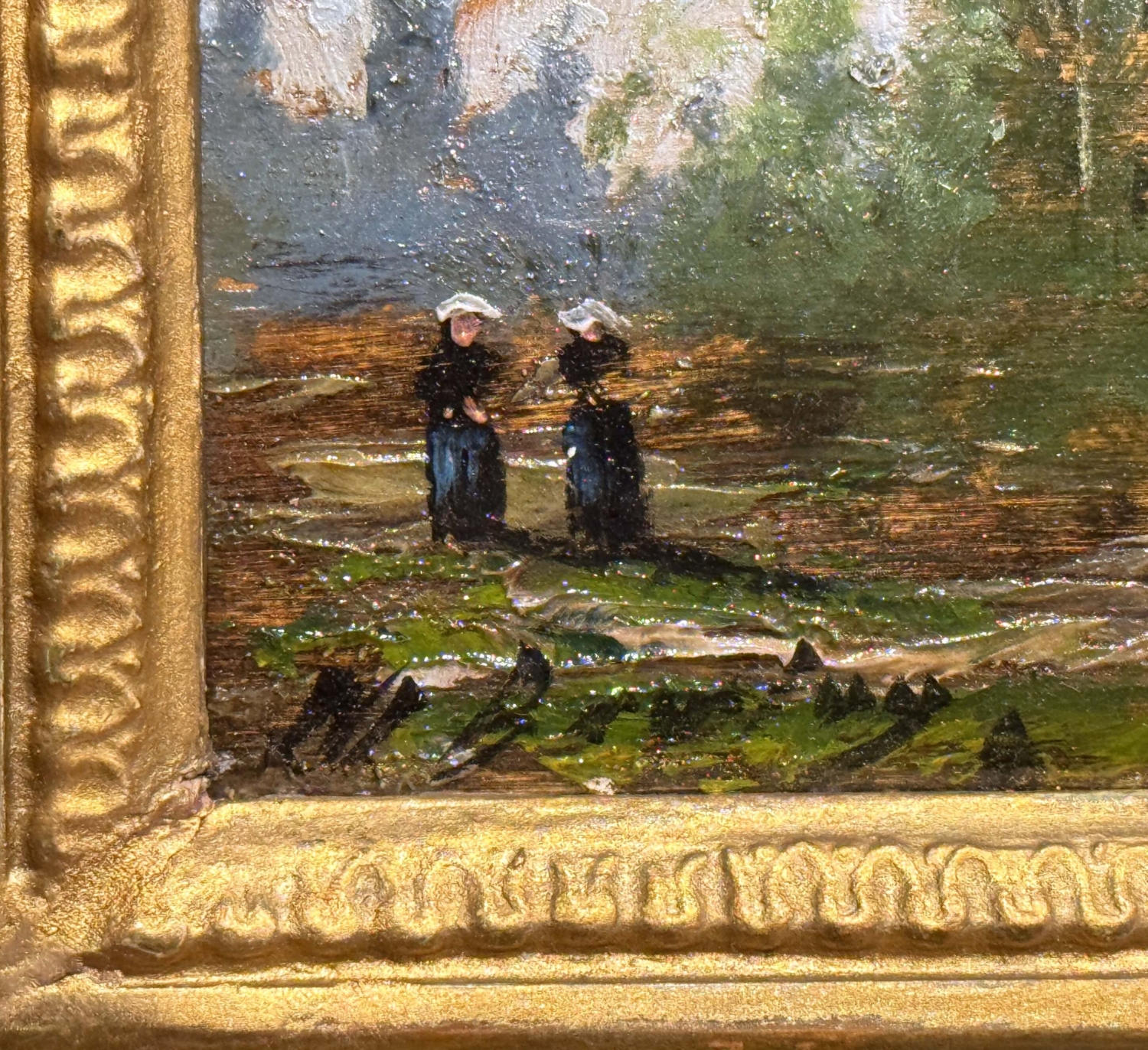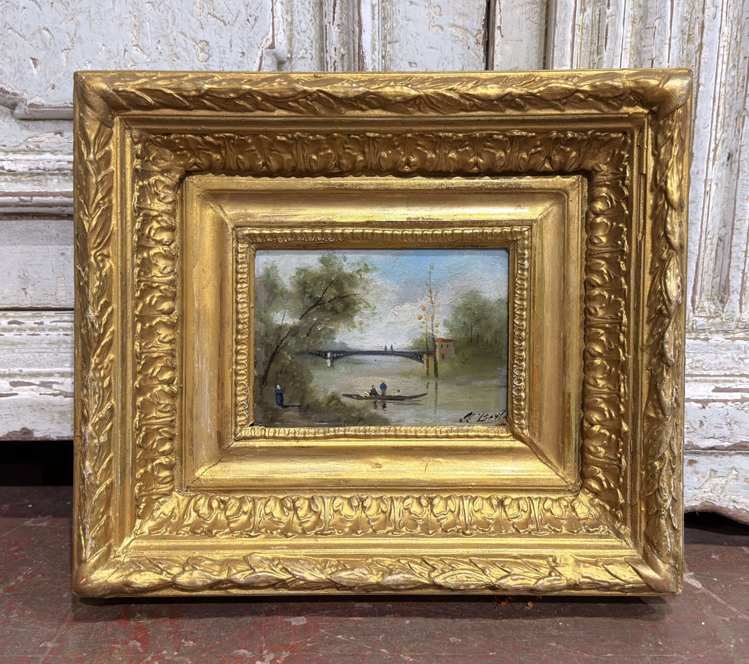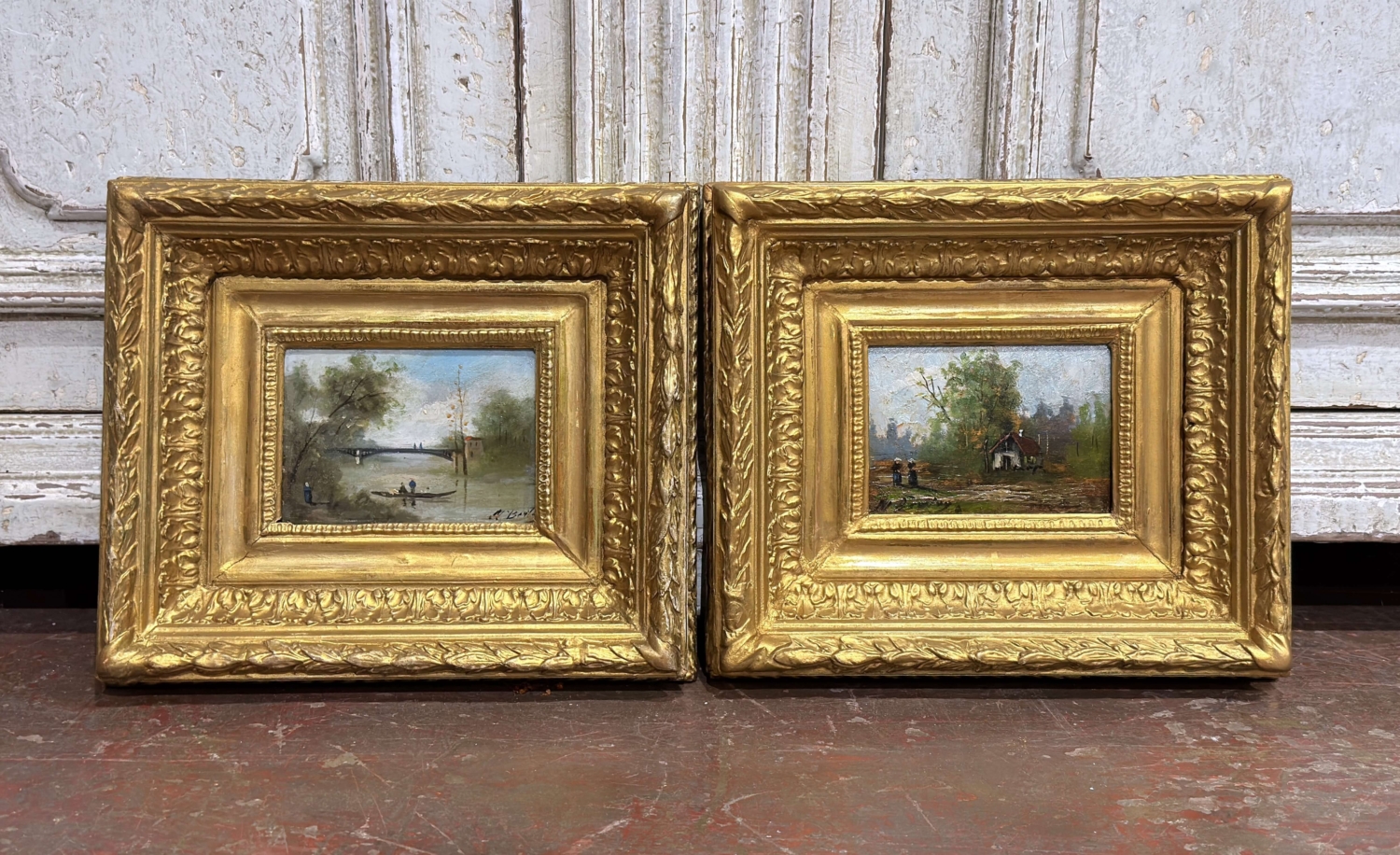 This evocative pair of antique French cabinet-scale oil paintings dates to circa 1870 and reflects the influence of the Barbizon School, known for its naturalistic depictions of rural life and landscape. Painted in oil on panel, each composition captures a tranquil countryside scene rendered with loose, atmospheric brushwork and a soft, tonal palette characteristic of mid-19th-century French painting. One painting depicts figures in a small boat along a calm river beneath a distant bridge, while the companion scene shows figures walking near a rustic cottage framed by trees and open sky. The intimate scale and balanced compositions suggest these works were intended as decorative cabinet pictures, ideal for close viewing in refined interiors. Both paintings retain their original giltwood frames, richly molded with classical leaf and scroll ornamentation. The frames present a warm, time-softened gilt patina that enhances the pastoral imagery and underscores their authentic antique character. Each painting is signed in the lower corner; the signature appears to read possibly “M. Bruluy,” though the artist has not been definitively identified, and the works are therefore offered as Barbizon-style, reflecting artistic influence rather than a named hand. The pair is in excellent condition commensurate with age and use, with light surface wear and gentle patina consistent with authentic antique works. Dimensions (each, framed): 12.5”W x 11”H
