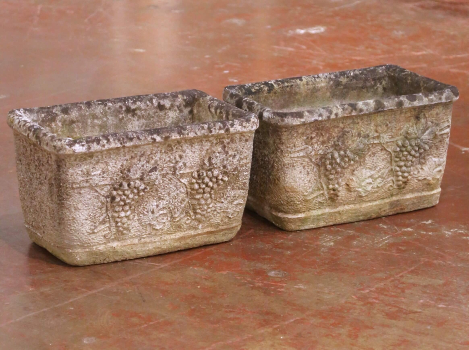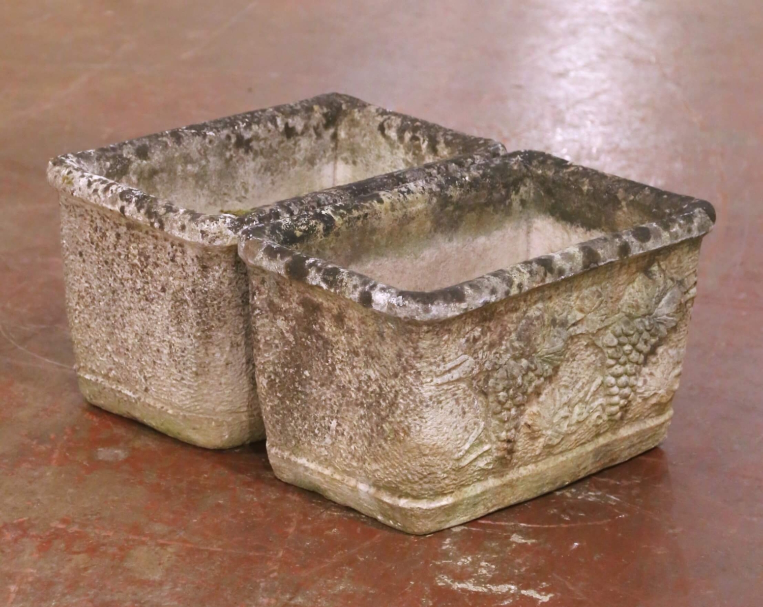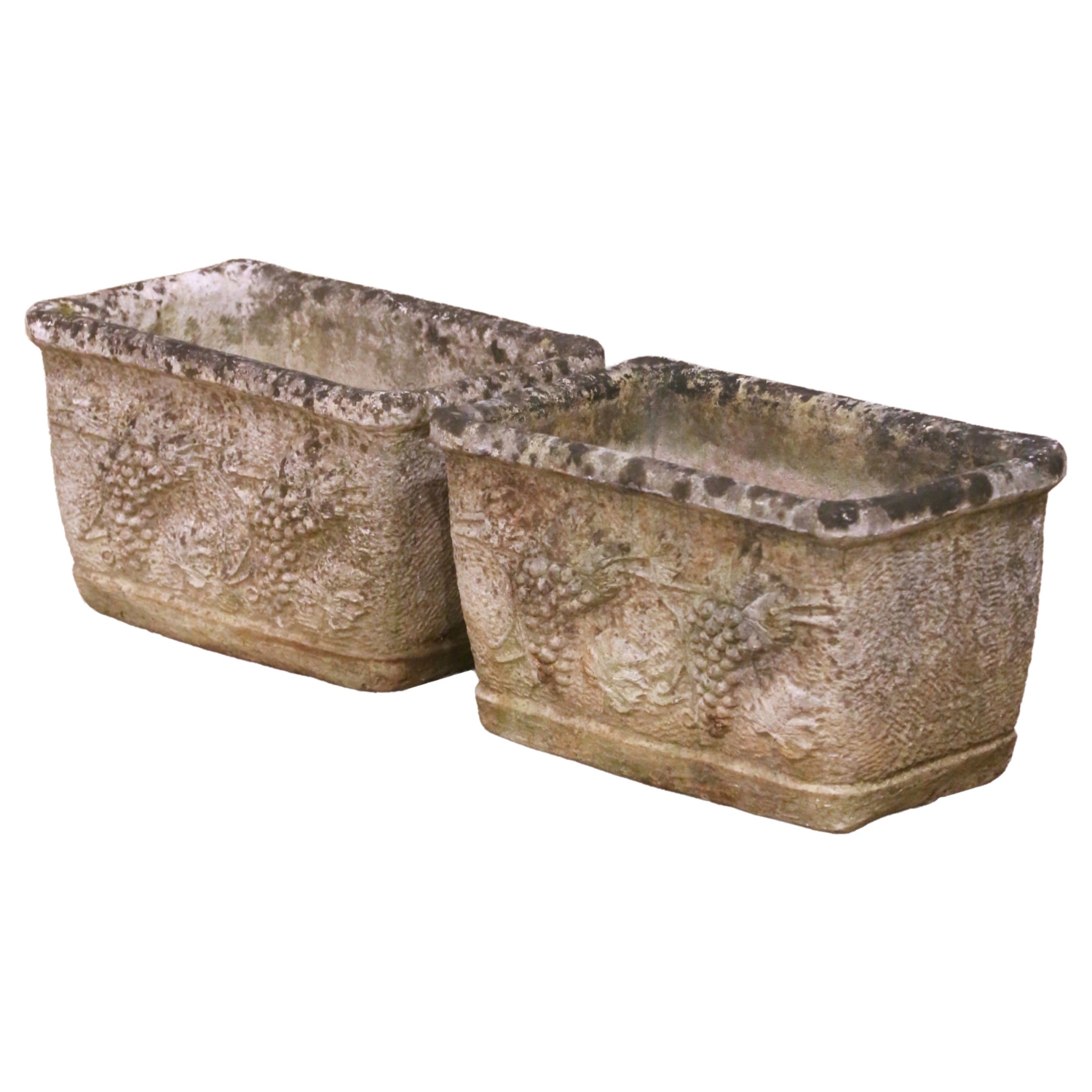 Crafted in France circa 1880, this handsome pair of antique cast stone jardinieres features a classic rectangular form enriched with sculptural grapevine decoration. Each planter is molded with raised clusters of grapes and trailing leaves across the façade, evoking the vineyard traditions of the French countryside and lending the pieces a refined yet rustic garden character. The thick, rounded rims frame deep planting wells, and the surfaces display a beautifully weathered patina developed over time. Natural lichen, moss staining, and tonal variation enhance their authentic antique presence and confirm their intended outdoor use. The softly textured sides and subtly molded base add depth and structure while maintaining a restrained, architectural silhouette. Substantial in weight at 68 pounds each, these antique French planters are well suited for exterior placement on a terrace, flanking an entry, anchoring a garden wall, or defining a courtyard vignette. They may also be used indoors in a conservatory or garden room for a strong European statement. The pair is in excellent antique condition commensurate with age and outdoor exposure, with surface wear and weathering that contribute to their timeworn charm. Dimensions: 20.5”W x 13”D x 12”H Weight: 68 lbs each
