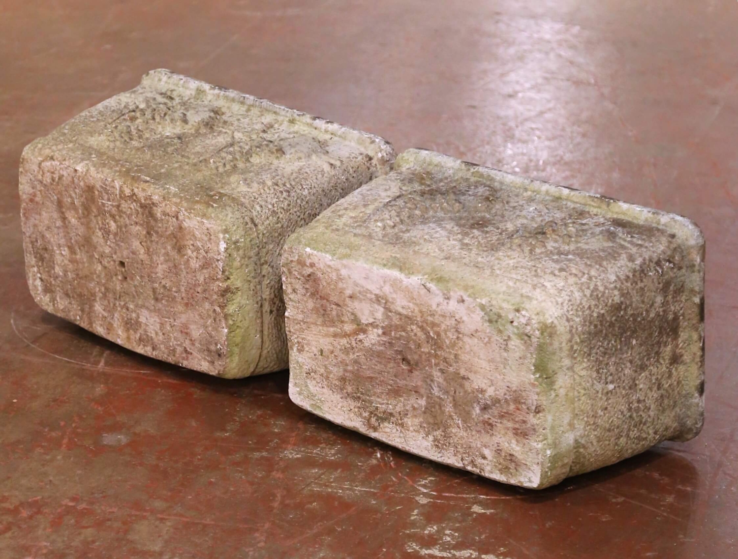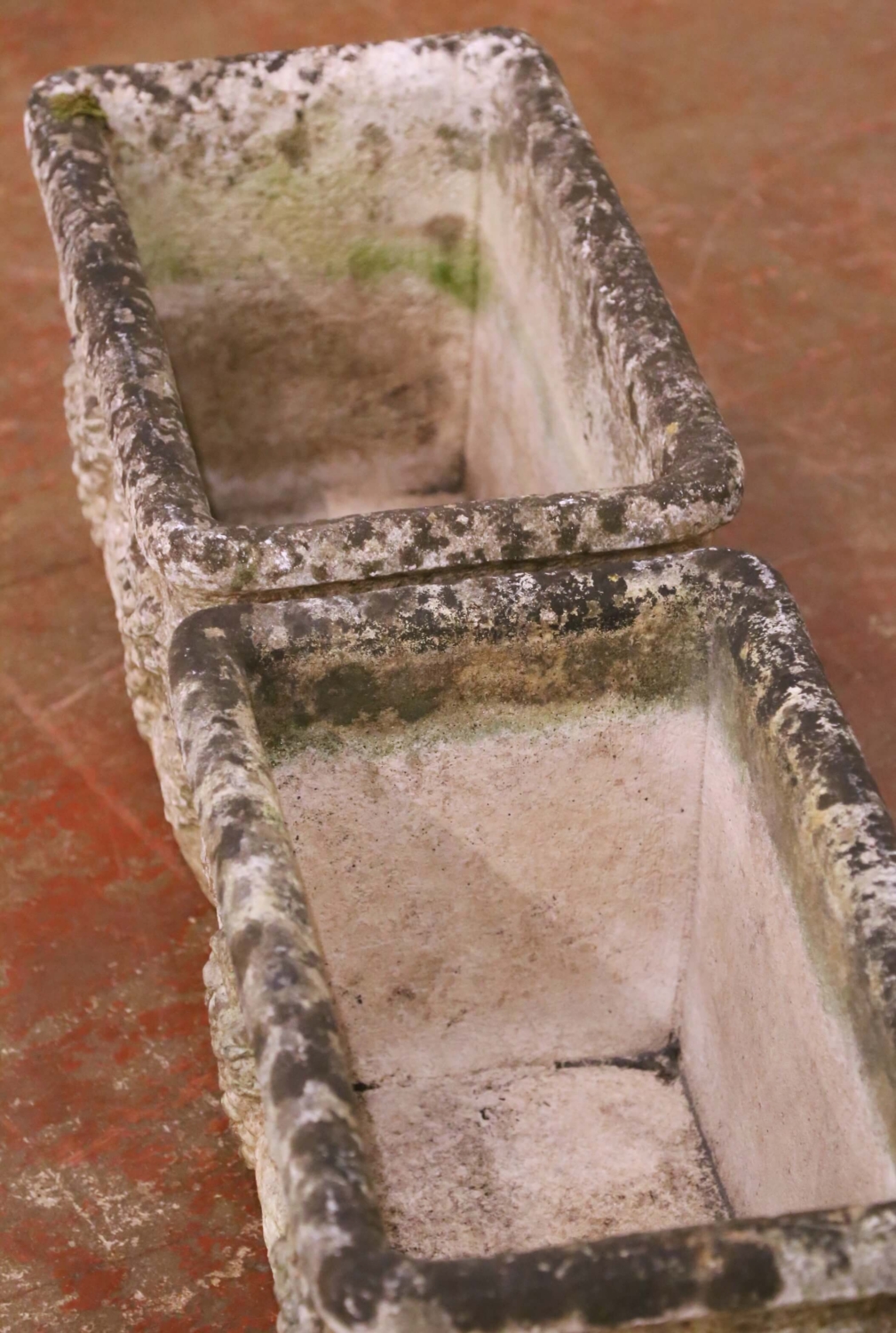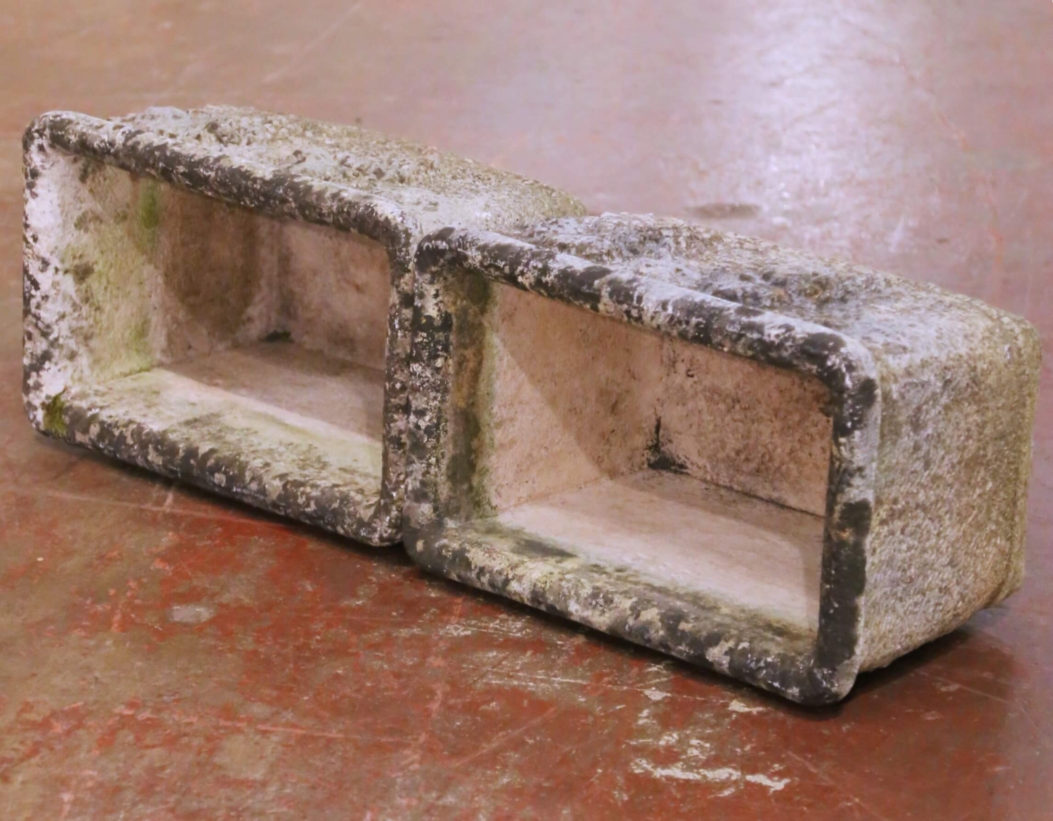 Crafted in France circa 1880, this handsome pair of antique cast stone jardinieres features a classic rectangular form enriched with sculptural grapevine decoration. Each planter is molded with raised clusters of grapes and trailing leaves across the façade, evoking the vineyard traditions of the French countryside and lending the pieces a refined yet rustic garden character. The thick, rounded rims frame deep planting wells, and the surfaces display a beautifully weathered patina developed over time. Natural lichen, moss staining, and tonal variation enhance their authentic antique presence and confirm their intended outdoor use. The softly textured sides and subtly molded base add depth and structure while maintaining a restrained, architectural silhouette. Substantial in weight at 68 pounds each, these antique French planters are well suited for exterior placement on a terrace, flanking an entry, anchoring a garden wall, or defining a courtyard vignette. They may also be used indoors in a conservatory or garden room for a strong European statement. The pair is in excellent antique condition commensurate with age and outdoor exposure, with surface wear and weathering that contribute to their timeworn charm. Dimensions: 20.5”W x 13”D x 12”H Weight: 68 lbs each