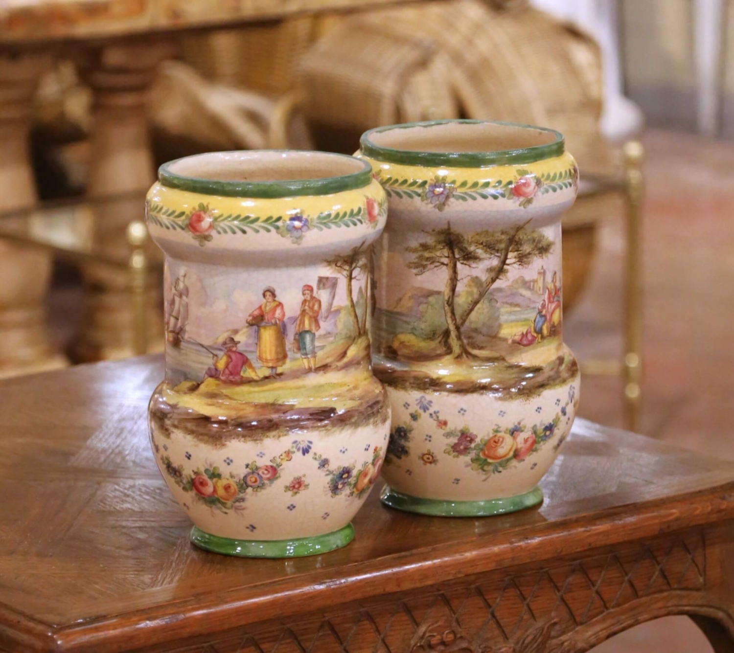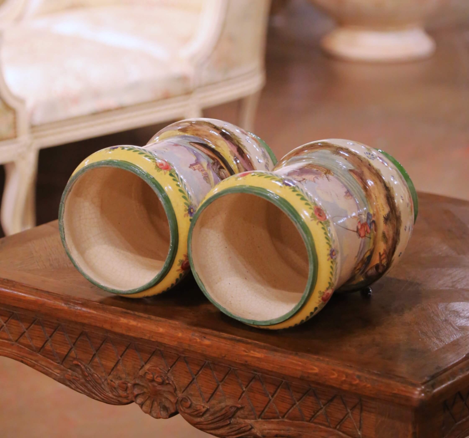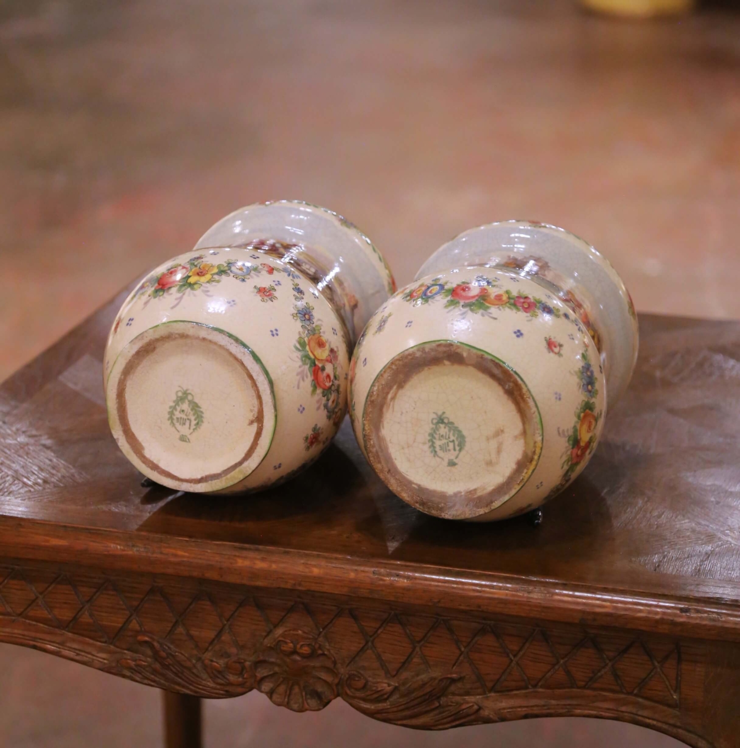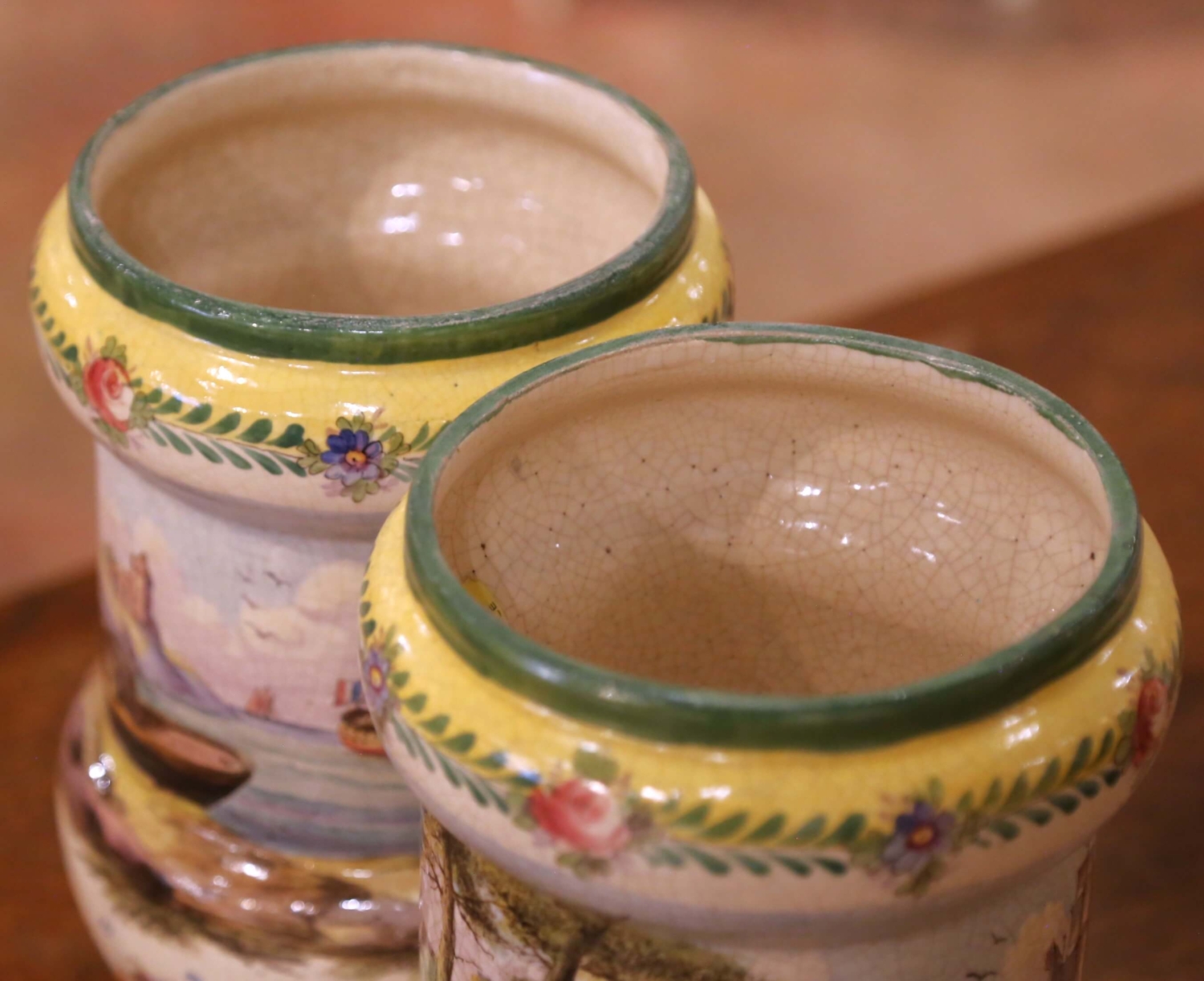 This elegant pair of antique French faience vases was crafted in Lille circa 1850 and reflects the romantic revival of northern France’s celebrated ceramic tradition. Each vessel features a softly waisted baluster form with a gently flared rim and rounded shoulder, raised on a green-glazed circular foot. At 11 inches high, their proportions are more consistent with decorative vases than cachepots, giving them a graceful vertical presence ideal for display. The bodies are richly hand-painted with continuous pastoral and maritime scenes, including fishermen along the shoreline, figures gathered near rustic architecture, and sailing vessels moving across tranquil waters. The landscapes are rendered in soft, atmospheric tones with delicate perspective and careful brushwork, framed by scattered floral bouquets and a warm yellow band beneath the rim adorned with stylized roses and leafy garlands. The painterly treatment and romantic subject matter are characteristic of mid-19th century French revival faience. The glossy tin-glazed surface exhibits fine, even craquelure throughout, consistent with 19th century production. The undersides bear a laurel wreath mark reading “Lille 1767,” a historic reference honoring Lille’s 18th century heritage rather than indicating an earlier manufacture. The glaze quality, form, and decoration firmly support a circa 1850 dating. Both antique vases remain in excellent condition commensurate with age and use, with light surface wear and natural glaze variation that enhance their authenticity and charm. A refined and colorful pair, ideal for a mantel, console, or dining room enfilade, and equally beautiful displayed alone or filled with fresh seasonal stems. Dimensions: 7”Diameter x 11”H each