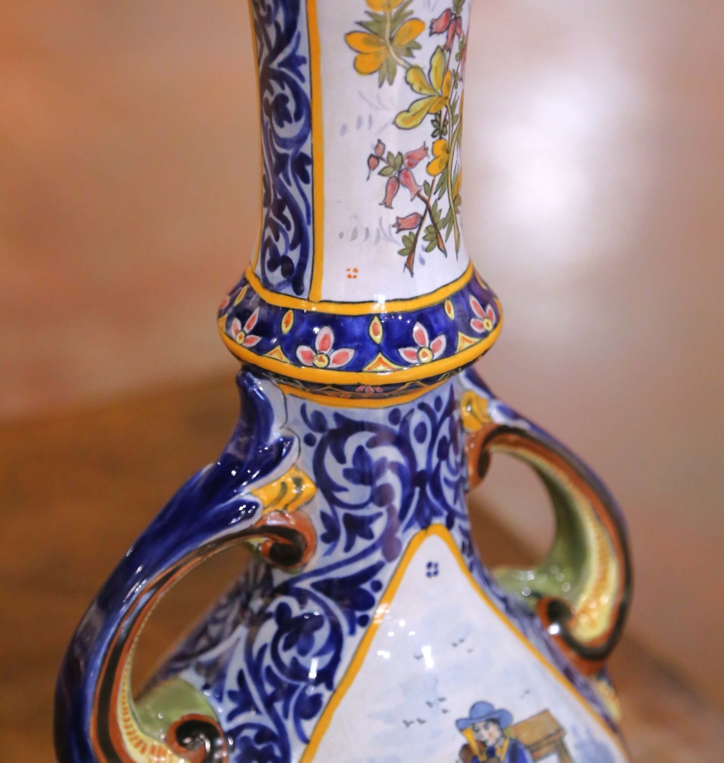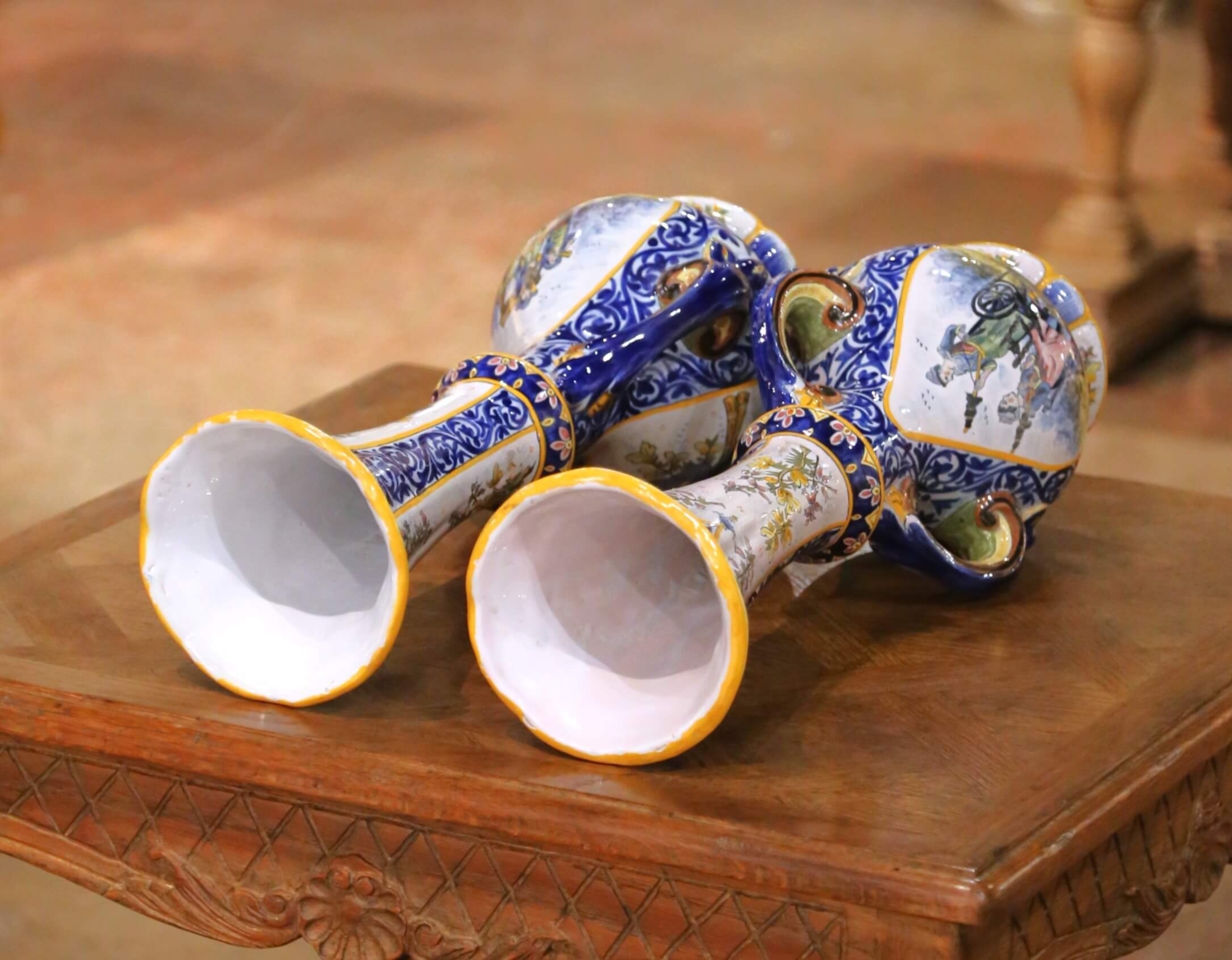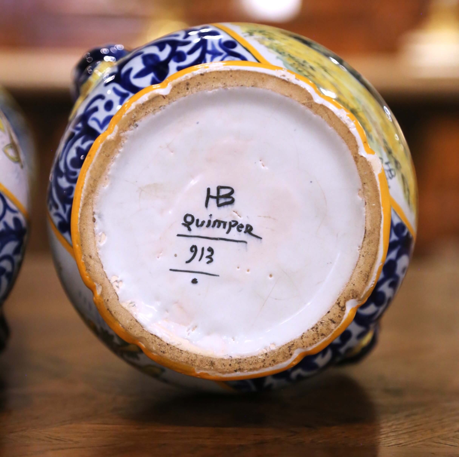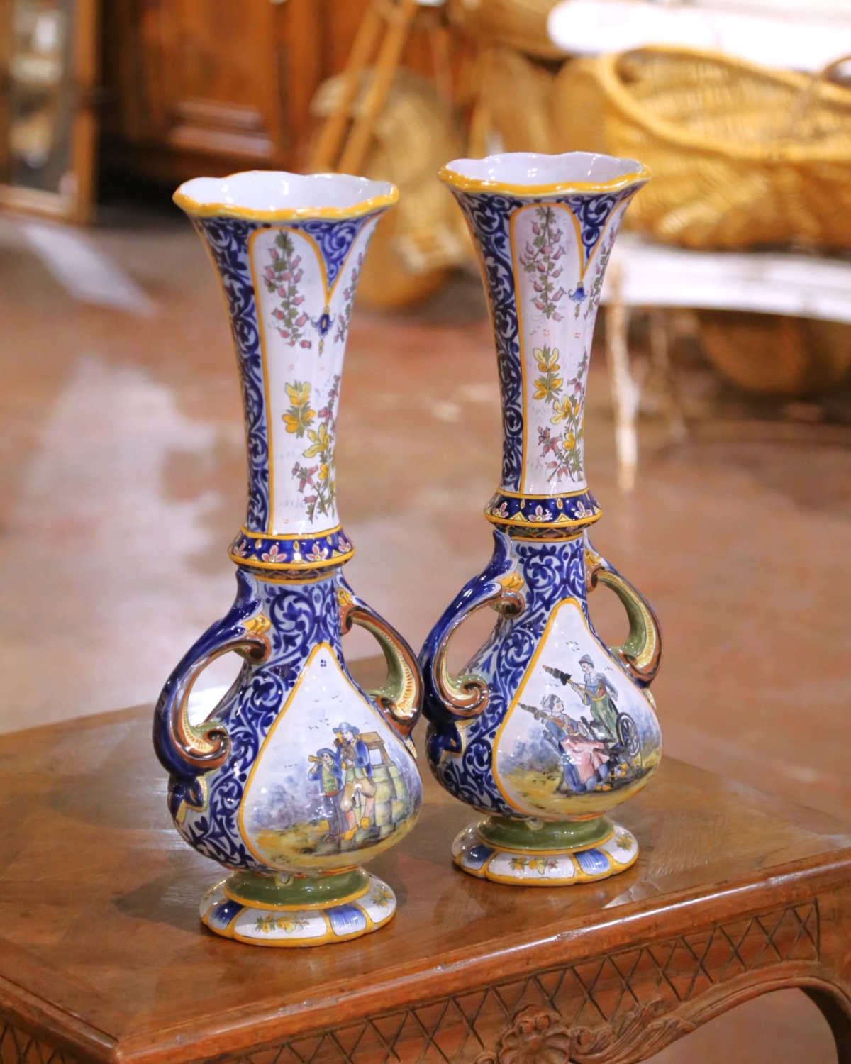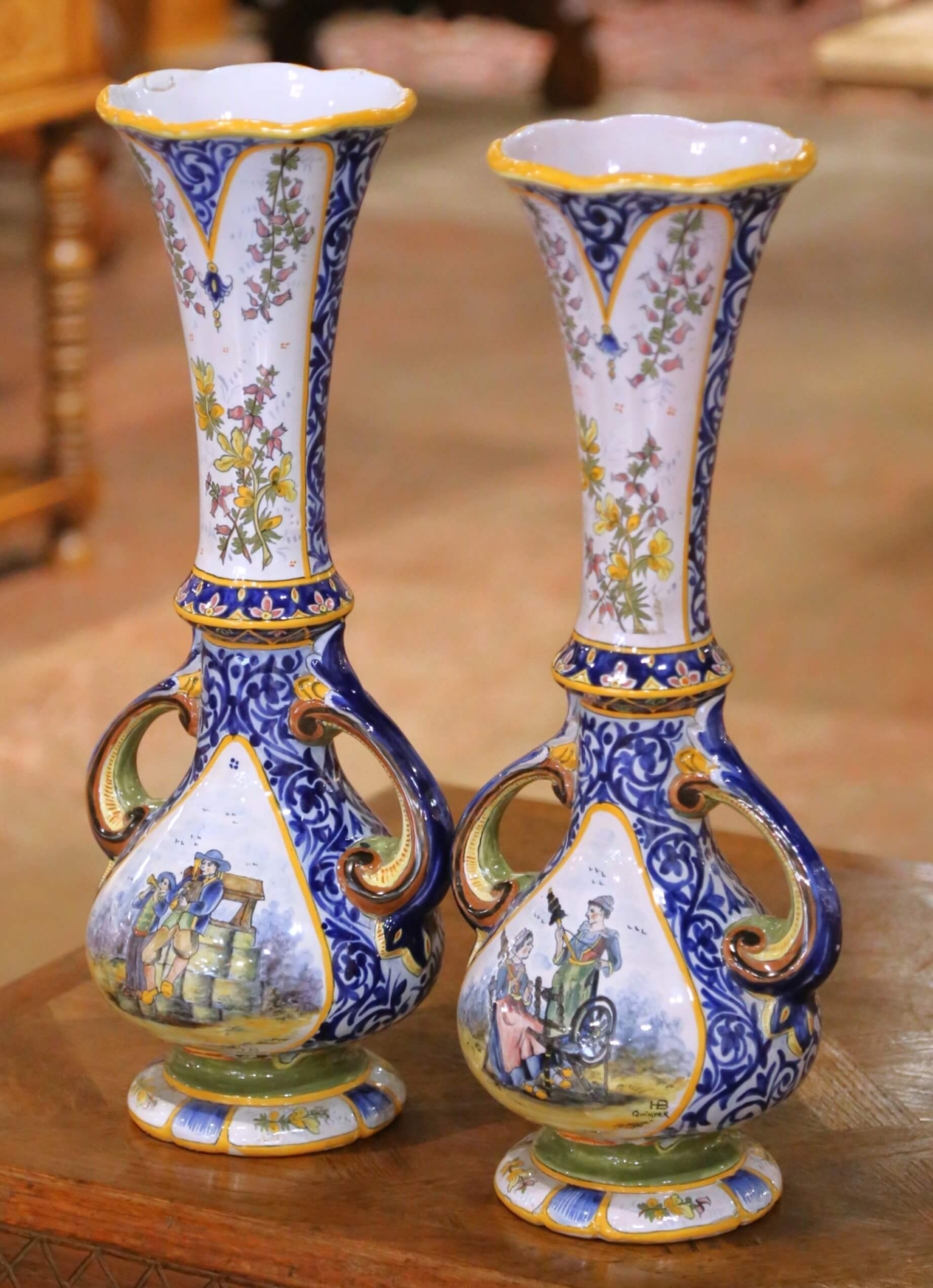 Crafted in Quimper, France circa 1880, this elegant pair of antique faience vases showcases the refined artistry of HB Quimper. Each vase features a graceful tall neck rising from a bulbous body, flanked by scrolled handles and resting on a shaped pedestal base. The sculptural silhouette is both decorative and balanced, ideal for a mantel, console, or dining table centerpiece. Hand-painted in the traditional Breton style, the reserves depict charming scenes of peasants in regional dress. One vignette illustrates a seated woman at her spinning wheel beside a standing companion, while the other features two figures playing traditional instruments near a stone well. The vibrant palette of cobalt blue, soft green, golden yellow, and warm ochre is framed by intricate foliate scrollwork and floral garlands. The tall necks are decorated with delicate botanical motifs, enhancing the vertical elegance of the form. Both pieces are marked on the front Quimper and underside “HB Quimper” with model number 913, confirming their late 19th century production. The vases are in excellent antique condition commensurate with age and use, with rich glaze and crisp hand-painted detail throughout. Quimper pottery has been produced in Brittany since the late 17th century. The HB (Hubaudière-Bousquet) factory, founded in 1685, became one of the most prominent makers of tin-glazed faience, renowned for its Breton figures and floral decoration. Alongside Porquier and Henriot, HB helped establish Quimper as one of France’s most celebrated ceramic centers. Dimensions: 9″W x 7″D x 21.25″H