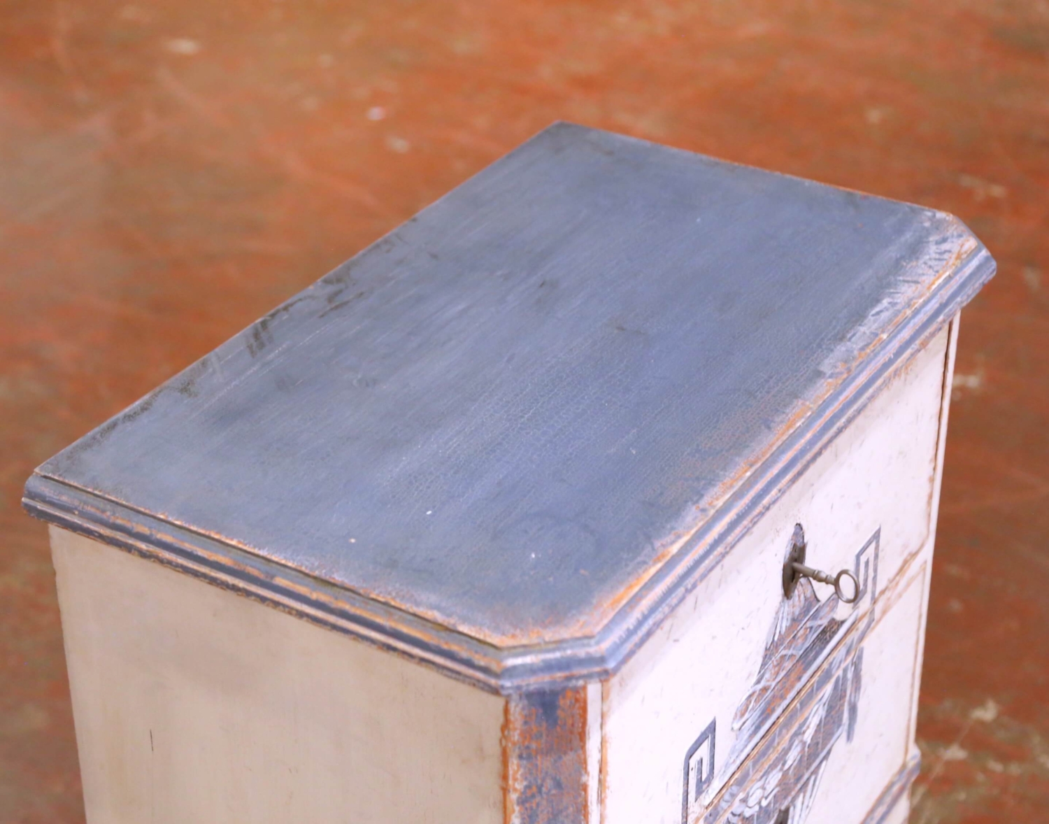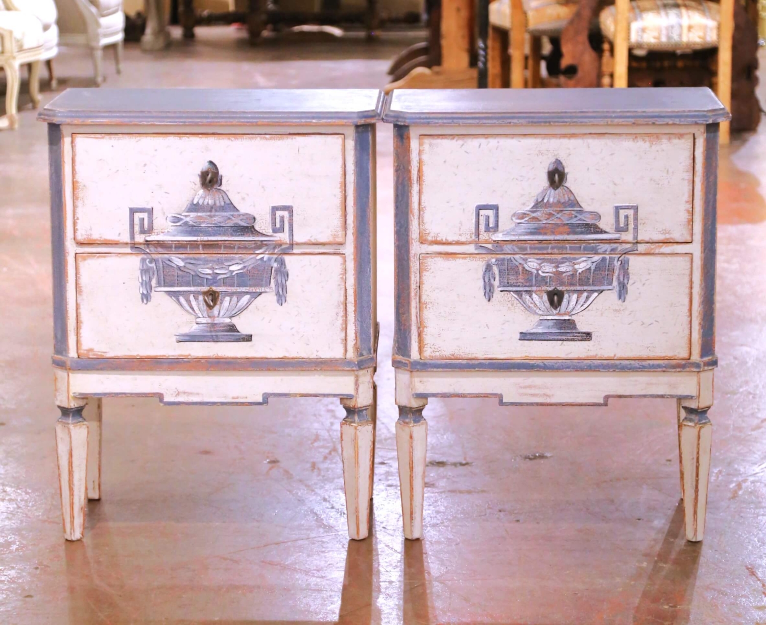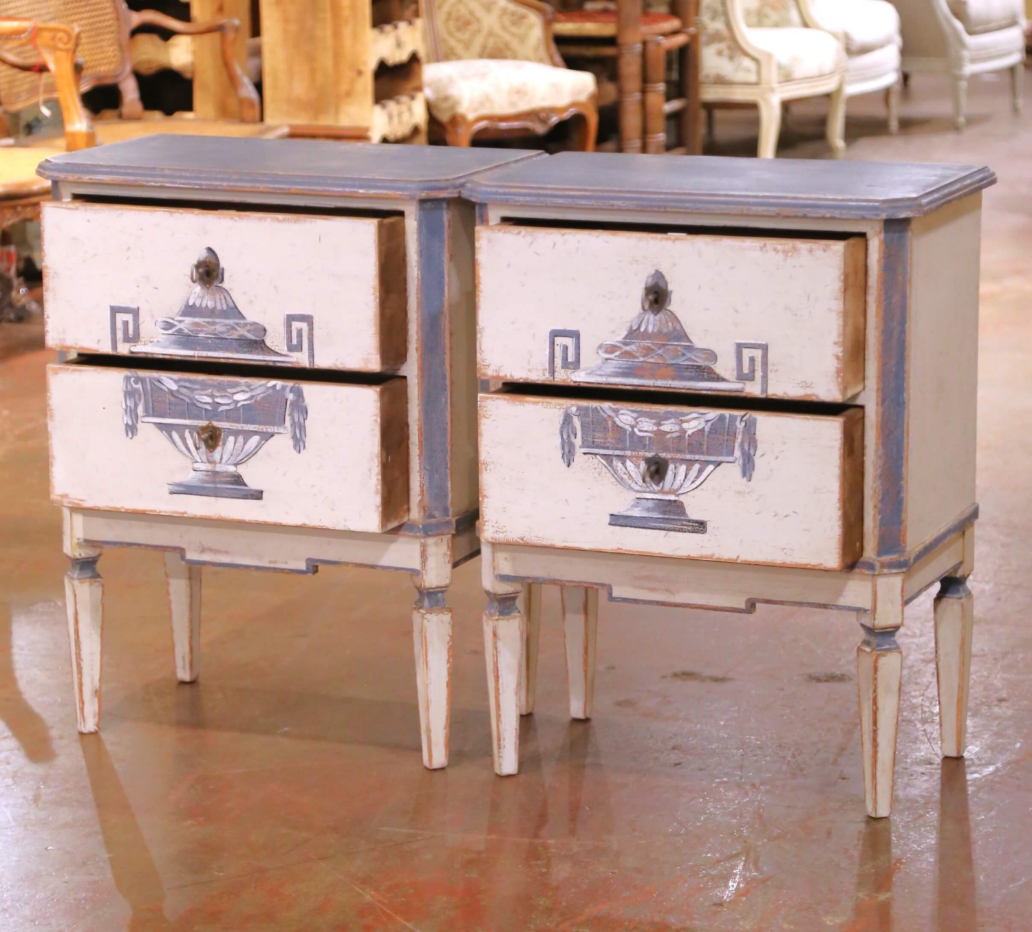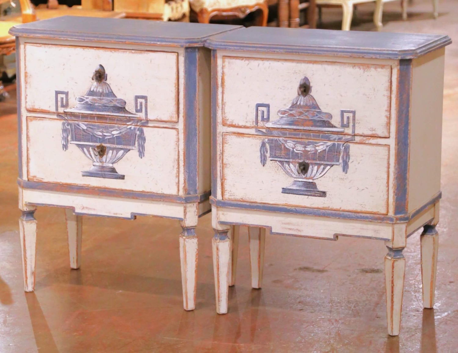 Pair of 19th Century French Louis-Philippe painted nightstands or small commodes, crafted in France circa 1890 and built of pine, reflecting the restrained elegance of Louis-Philippe domestic furniture. Each antique cabinet features a clean, rectilinear case raised on square tapered legs and fitted with two drawers. The drawer fronts are hand-painted with classical urn motifs and Greek key accents, a neoclassical decorative reference interpreted in a provincial Louis-Philippe manner. The surfaces retain a softly distressed cream ground with blue-grey accents and rubbed edges, revealing a desirable aged patina throughout. The tops are finished in a complementary blue-grey tone with chamfered corners, and the drawers are fitted with original iron ring pulls. Solid pine construction is evident to the interiors and backs, consistent with 19th-century French craftsmanship. These antique French cabinets are in excellent condition commensurate with age and use, with attractive wear that enhances their character without affecting function. Ideal as bedside tables, end tables, or small accent commodes, they bring understated French elegance to a bedroom or living space. Dimensions (each): 23.5″W x 14″D x 30.5″H