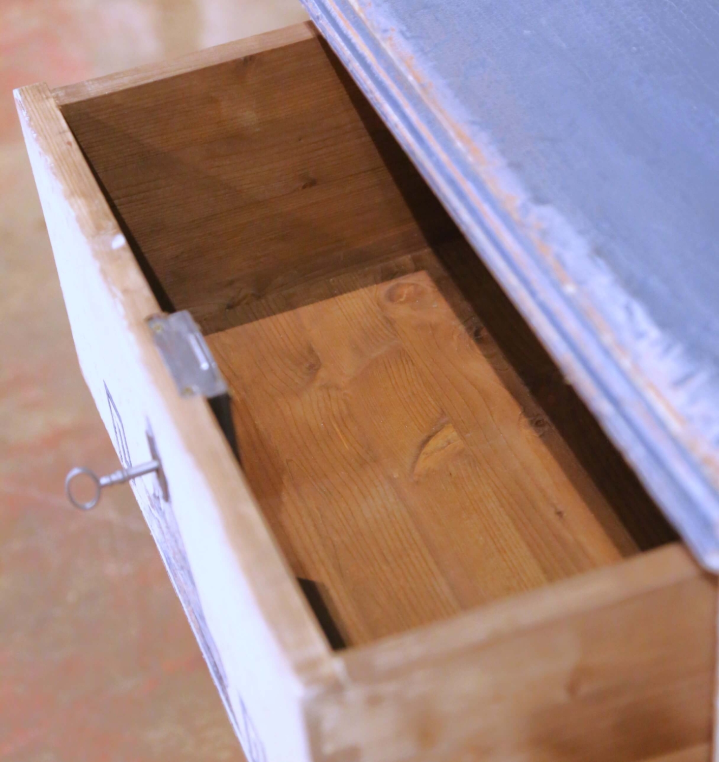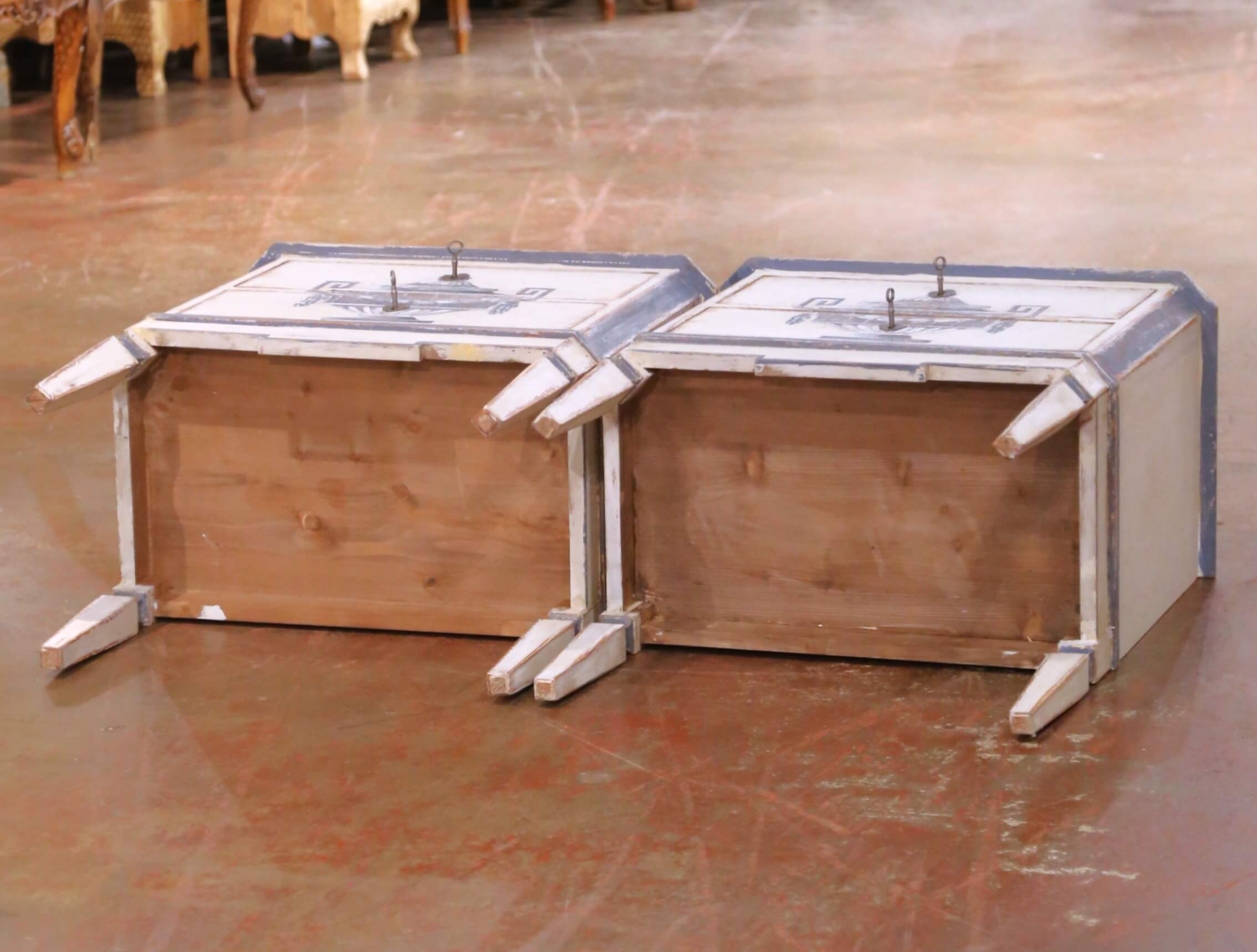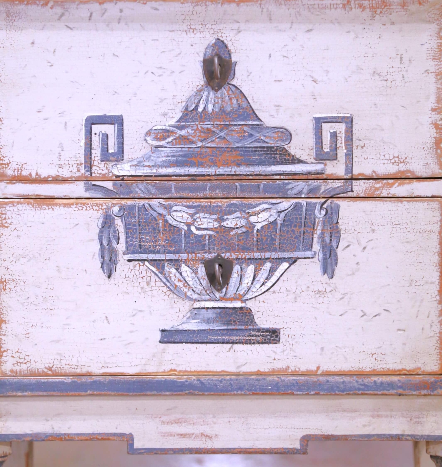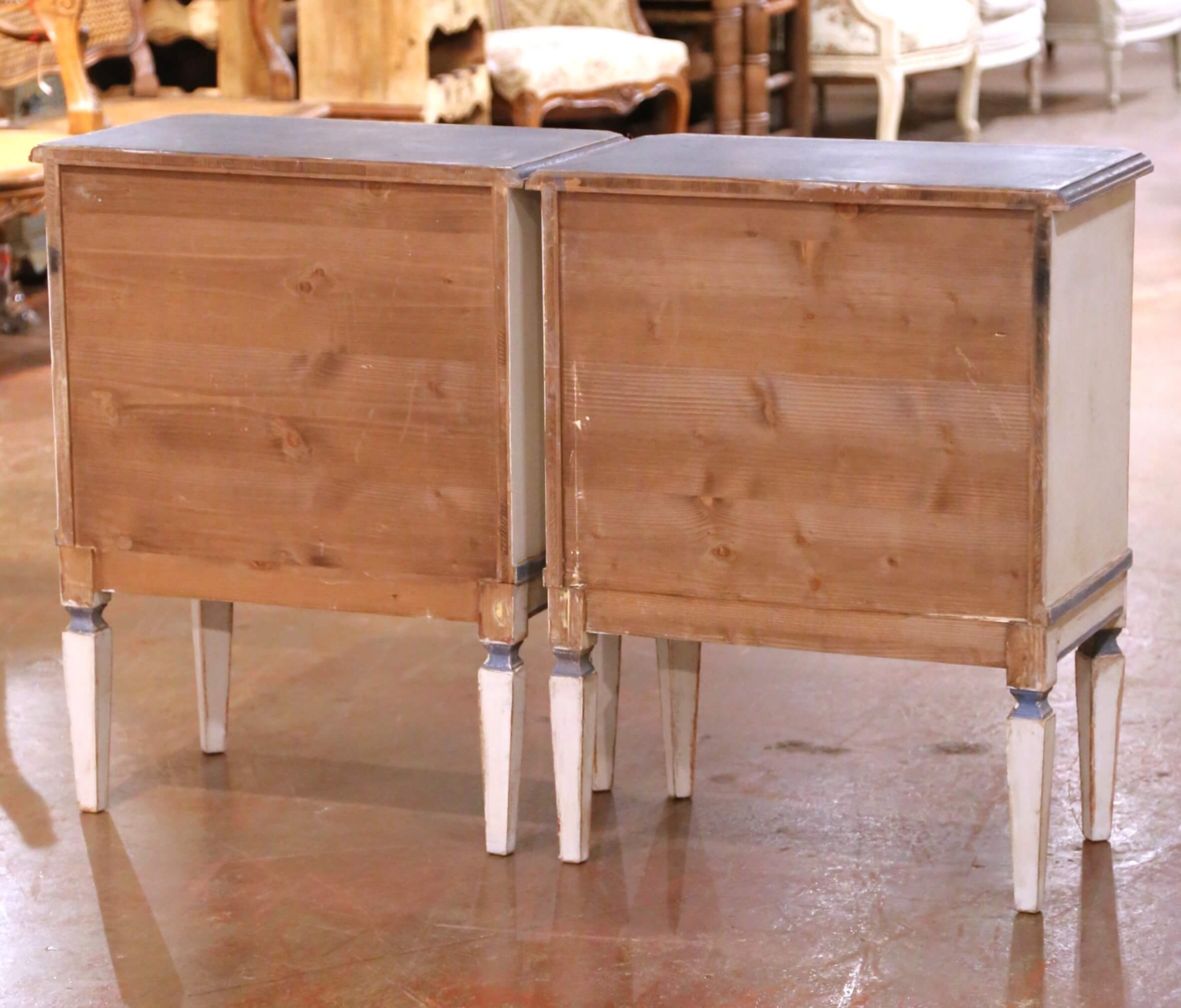 Pair of 19th Century French Louis-Philippe painted nightstands or small commodes, crafted in France circa 1890 and built of pine, reflecting the restrained elegance of Louis-Philippe domestic furniture. Each antique cabinet features a clean, rectilinear case raised on square tapered legs and fitted with two drawers. The drawer fronts are hand-painted with classical urn motifs and Greek key accents, a neoclassical decorative reference interpreted in a provincial Louis-Philippe manner. The surfaces retain a softly distressed cream ground with blue-grey accents and rubbed edges, revealing a desirable aged patina throughout. The tops are finished in a complementary blue-grey tone with chamfered corners, and the drawers are fitted with original iron ring pulls. Solid pine construction is evident to the interiors and backs, consistent with 19th-century French craftsmanship. These antique French cabinets are in excellent condition commensurate with age and use, with attractive wear that enhances their character without affecting function. Ideal as bedside tables, end tables, or small accent commodes, they bring understated French elegance to a bedroom or living space. Dimensions (each): 23.5″W x 14″D x 30.5″H