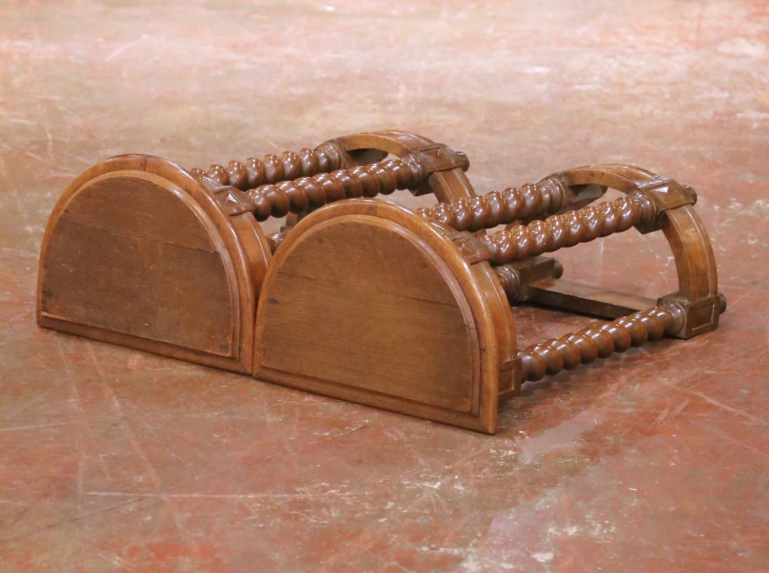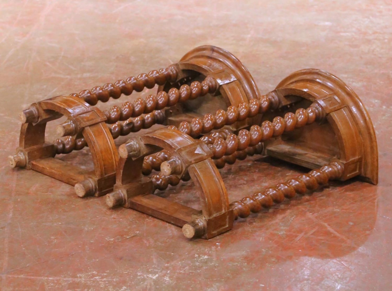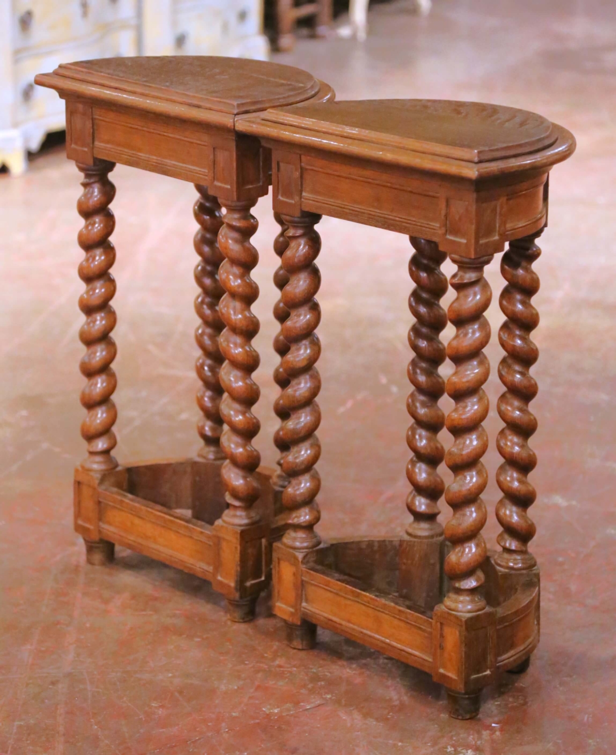 This elegant pair of antique French demi-lune console tables was crafted in oak in the late 19th century, circa 1880, in the Louis XIII style. Designed to rest against a wall, each console features a refined half-moon form with a molded top above a restrained architectural apron accented by subtle geometric paneling. Each table is supported by four finely turned barley-twist legs, a defining characteristic of Louis XIII furniture, joined by a shaped lower stretcher that echoes the demi-lune silhouette and adds both visual balance and structural stability. The oak displays a warm, richly developed patina, highlighting the depth of the turning and the quality of the craftsmanship. The pair is in excellent condition consistent with age and use, contributing to their authentic character. Their narrow depth and elegant vertical proportions make them ideal for use as console tables in an entry hall, flanking a doorway, or as architectural accent pieces in a living room or corridor. Dimensions (each): 17.5″W x 12.25″D x 29.25″H