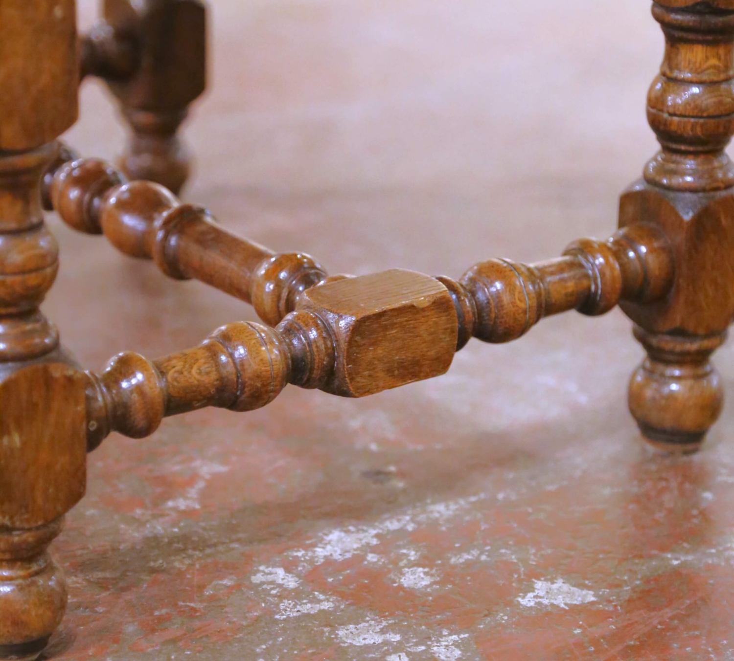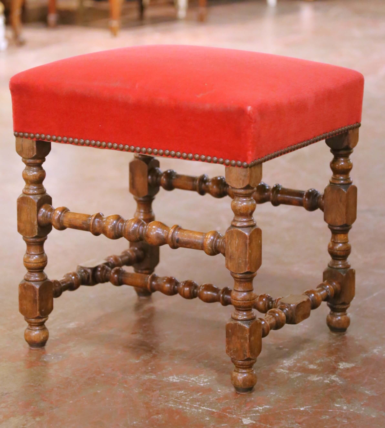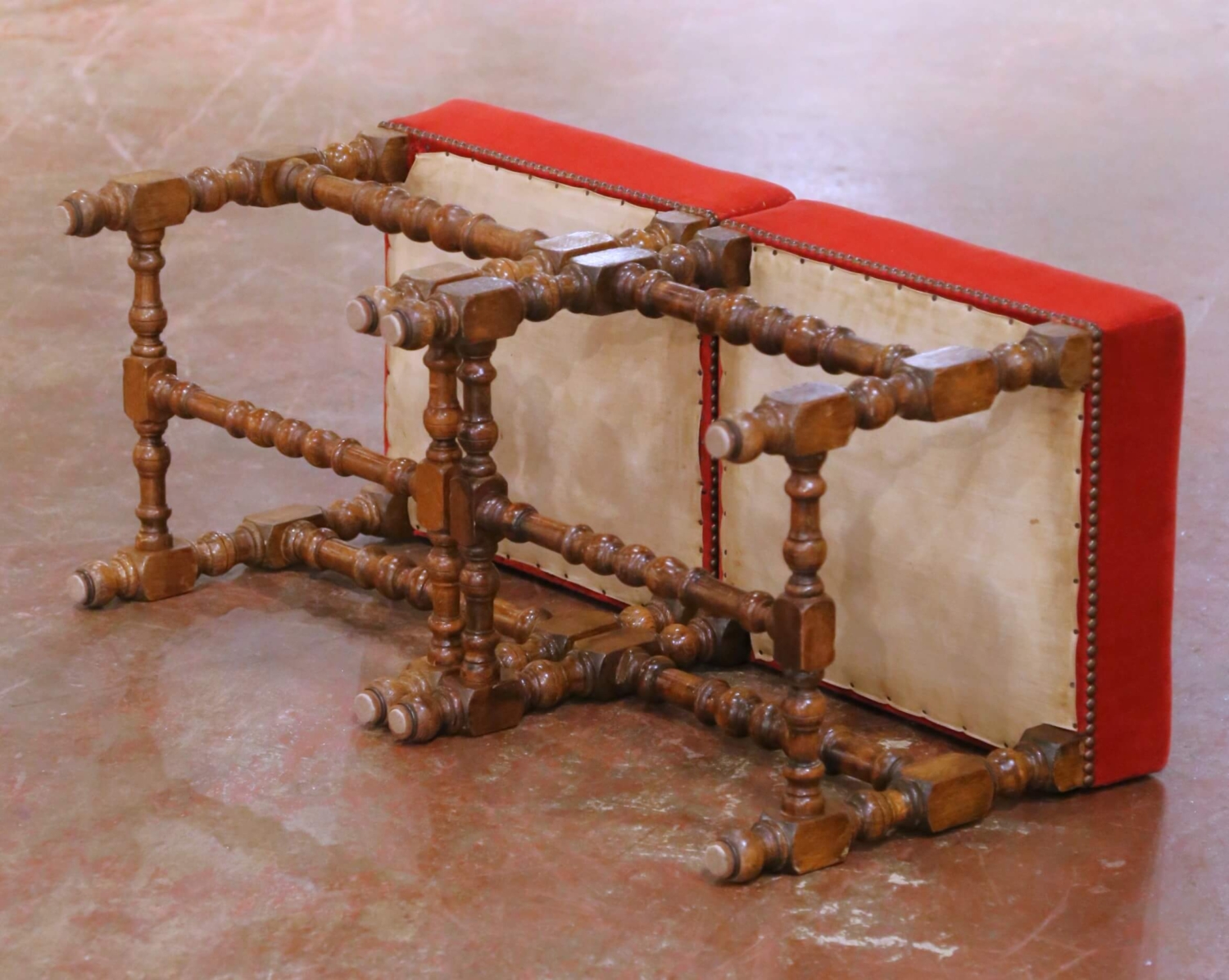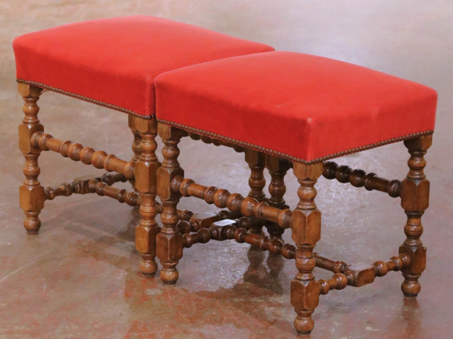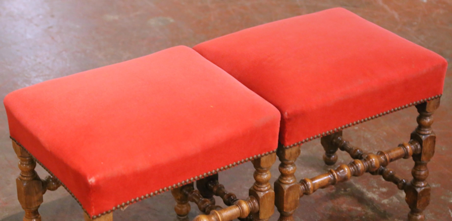 This handsome pair of antique French stools was crafted circa 1890, in the Louis XIII style. Built of solid walnut, each stool stands on robust turned legs joined by matching turned stretchers, a hallmark of Louis XIII–inspired seating. The warm, rich walnut patina highlights the depth of the wood and the honest wear consistent with age and use. Both stools are upholstered in deep red velvet, finished with decorative brass nailhead trim along the apron. The upholstery shows some visible staining (see photos), which has been reflected in the condition and contributes to their authentic antique character. These stools work beautifully as footstools, extra seating, fireside accents, or at the foot of a bed, and they also pair well with larger Louis XIII or rustic French furnishings. Dimensions: 19.5″W x 16.5″D x 20″H.