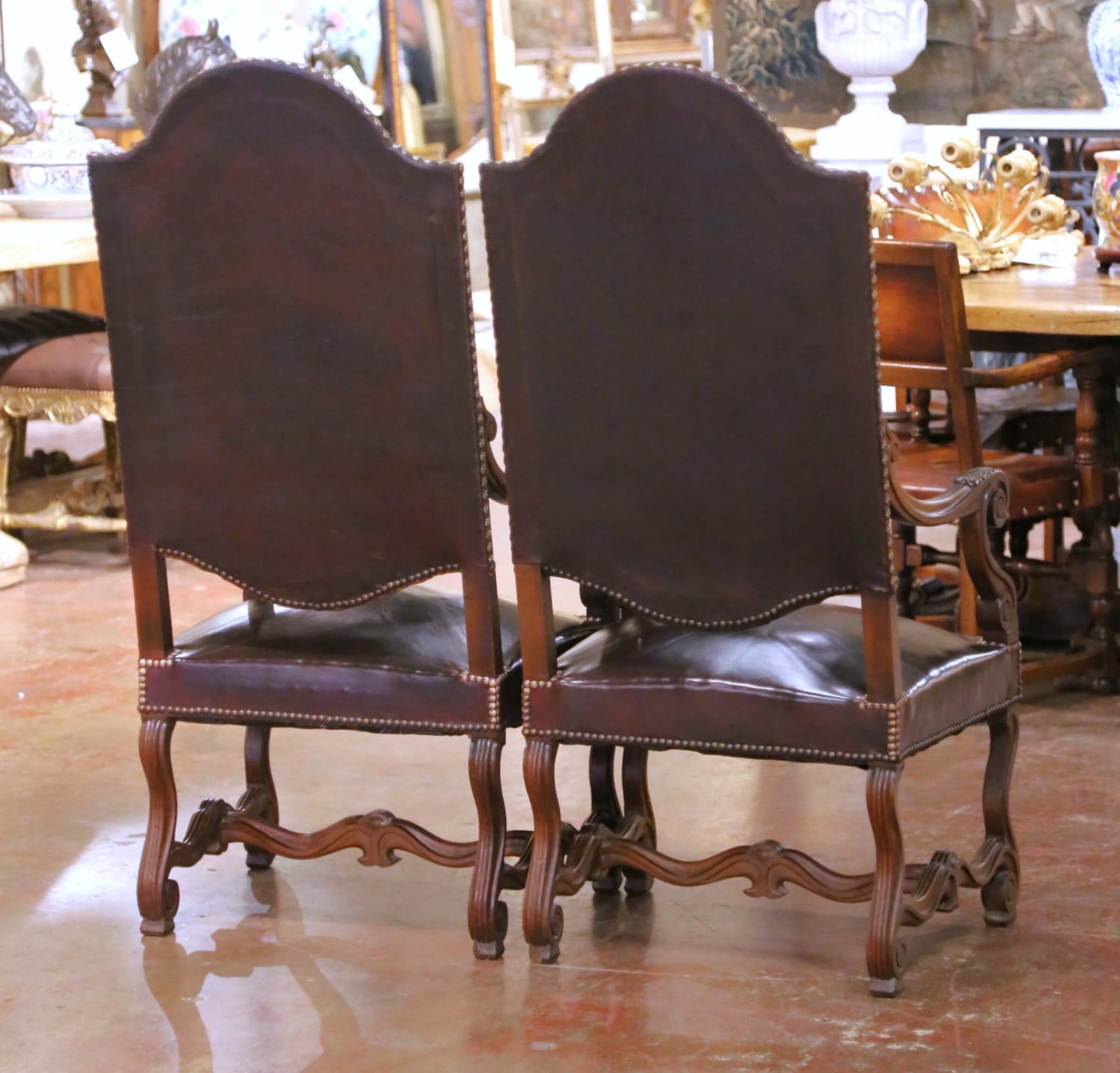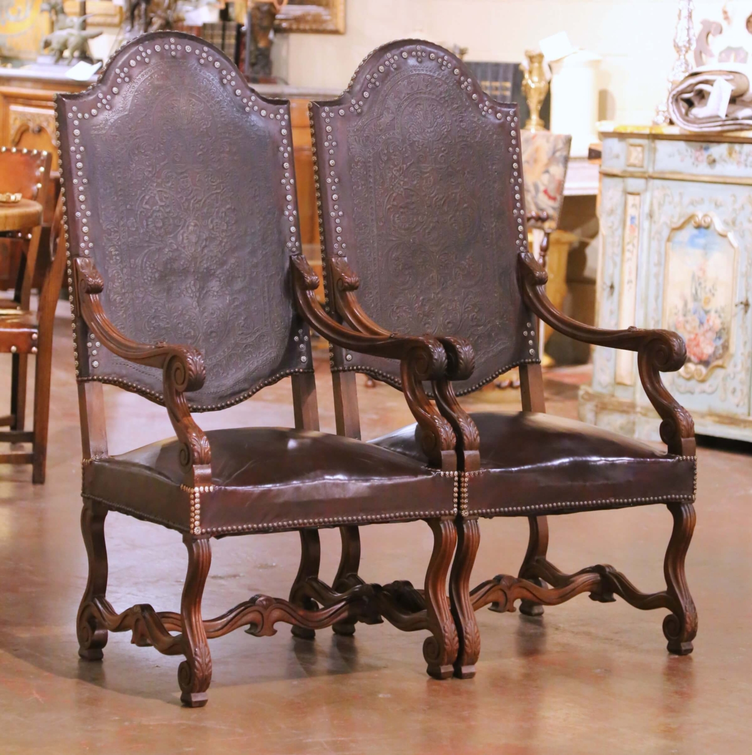 Bring stately French character to a study, dining room, or library with this pair of antique Louis XIII–style armchairs, crafted in France circa 1870 from solid walnut. Each generous fauteuil features a tall arched back framed with large decorative nailheads and upholstered in richly embossed leather displaying elegant foliate and scroll motifs. The sculpted walnut arms terminate in acanthus carvings, while the wide leather seats rest on turned legs connected by a shaped serpentine stretcher characteristic of Louis XIII design. The walnut exhibits a warm and inviting patina that complements the deep texture of the embossed leather panels. Strong, architectural proportions and finely executed carving speak to the quality of late 19th century French craftsmanship. These antique armchairs remain sturdy, comfortable, and in excellent condition commensurate with age and use, ideal for anchoring a formal seating area or adding presence to a refined interior. Dimensions: 24.25″ W x 24″ D x 50.75″ H; seat height 19″