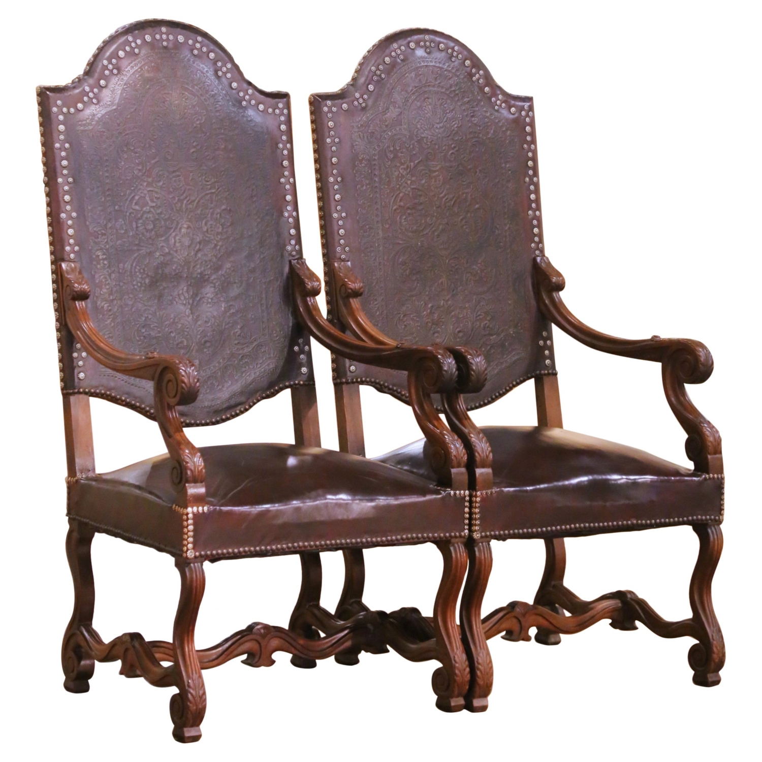 Pair of 19th Century French Louis XIII Walnut Armchairs with Embossed Leather