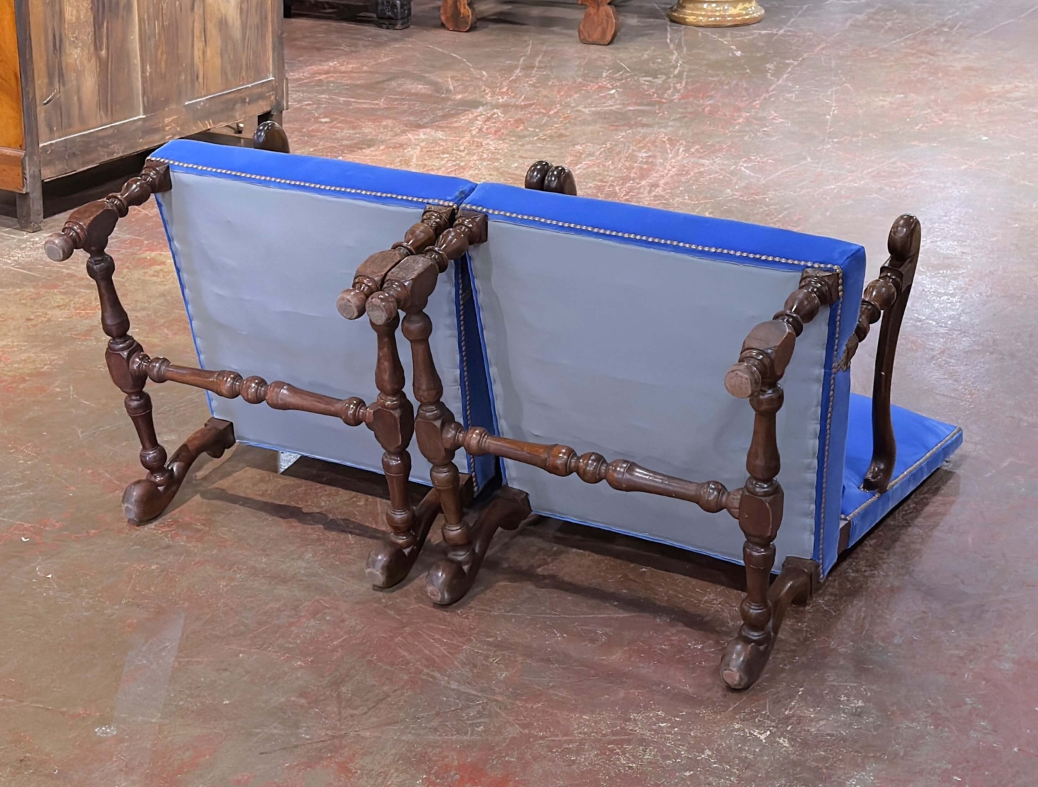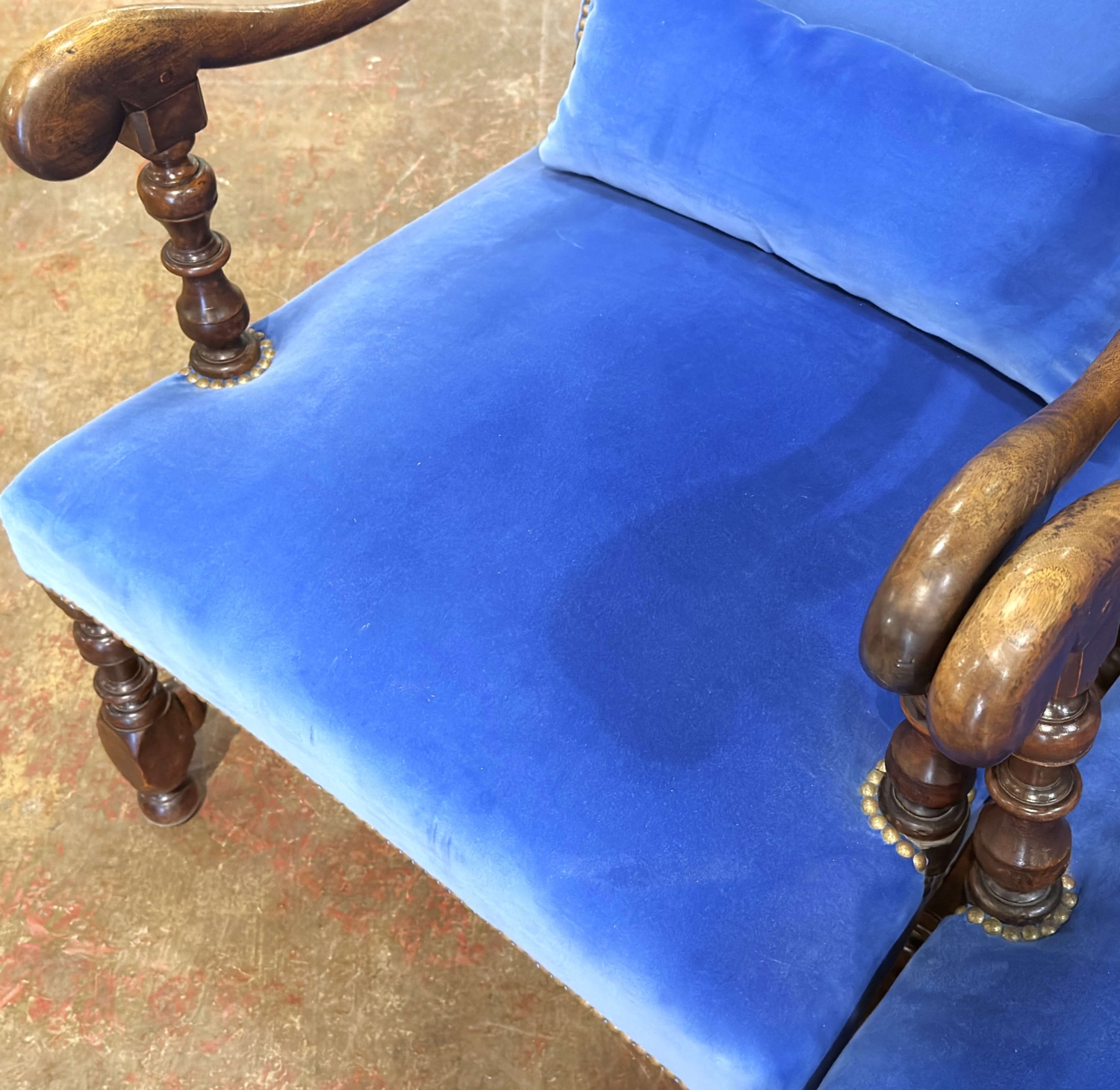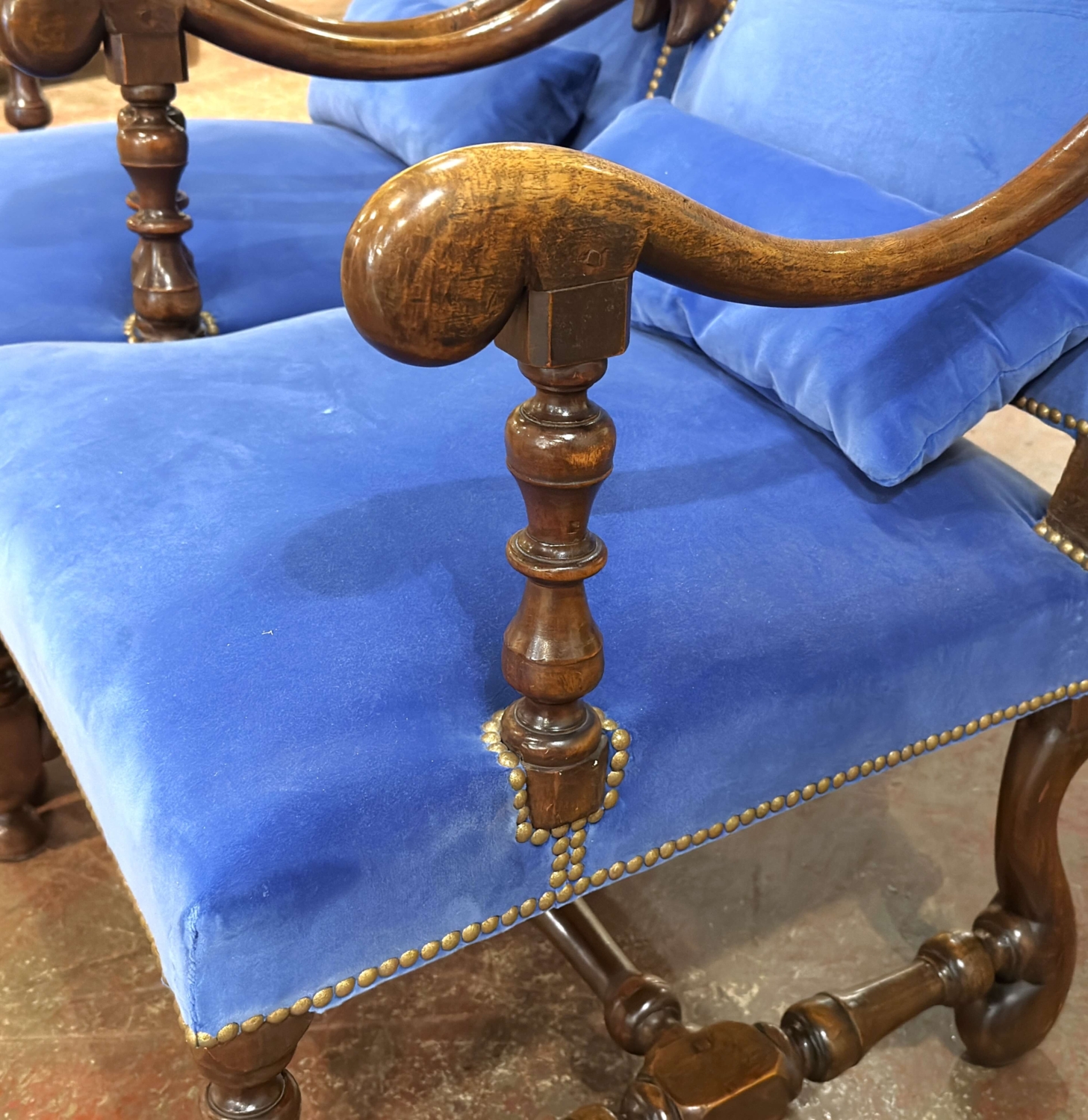 This elegant pair of antique French armchairs was crafted in France circa 1860 and reflects the enduring influence of the Louis XIII tradition, with subtle early Louis XIV formality. Built of solid walnut, each chair features a tall, slightly arched upholstered back, a wide generous seat, and finely turned legs joined by a sturdy box stretcher. The scrolled open arms terminate in sculptural hand-shaped rests and are supported by turned baluster uprights, adding both visual strength and refined craftsmanship. The warm walnut frames retain a rich, time-earned patina, highlighting the depth and grain of the wood. Recently reupholstered in a soft blue velvet, the chairs are trimmed with classic brass nailhead detailing and accompanied by matching lumbar cushions, offering both comfort and visual refinement. These antique armchairs are in excellent condition commensurate with age and use, with solid joinery and beautifully preserved proportions. Their commanding scale and high backs make them ideal as fireside chairs, library seating, or as a distinguished pair flanking a console or mantel in a classic or eclectic interior. Dimensions: 25″W x 35″D x 43.5″H Seat height: 16