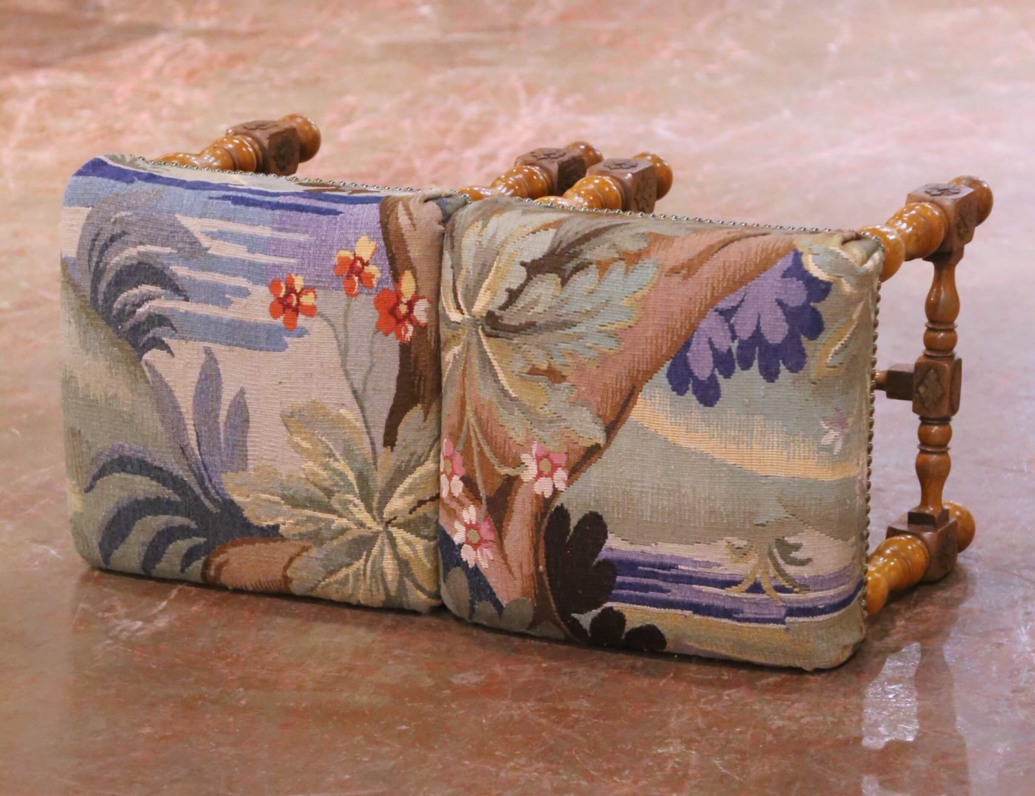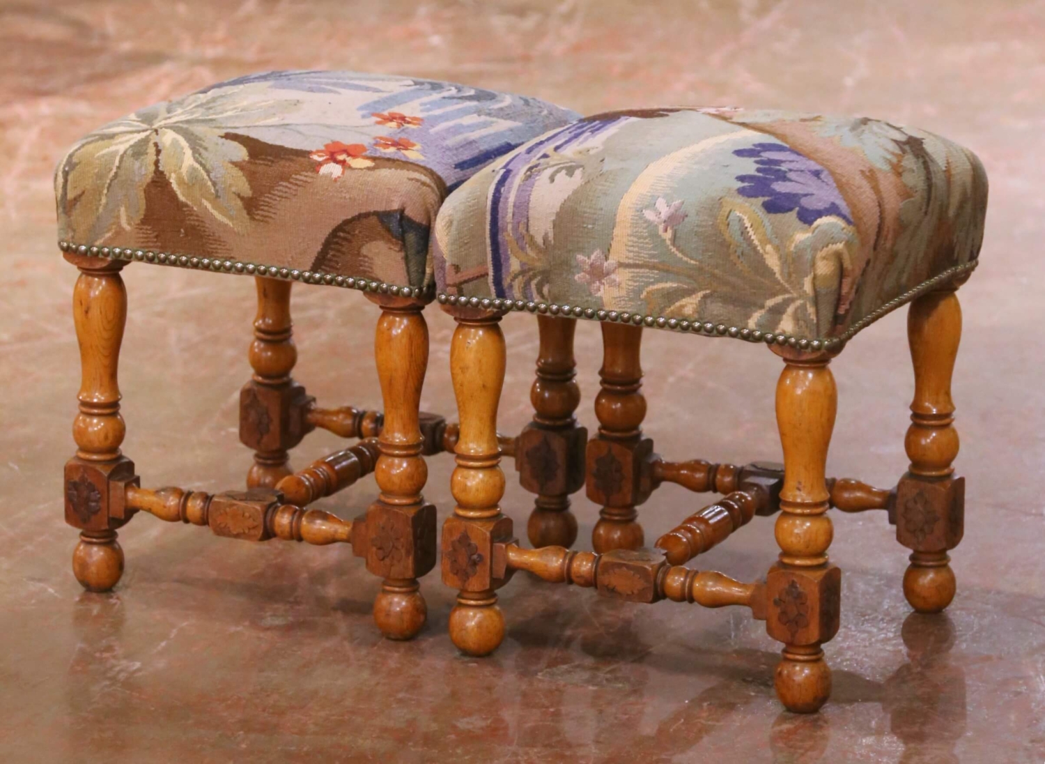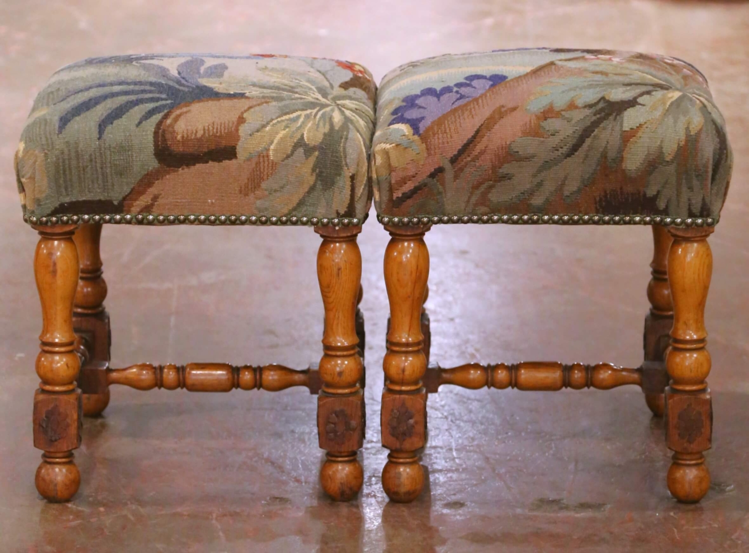 Pair of 19th Century French Louis XIII Walnut Stools with Aubusson Tapestry